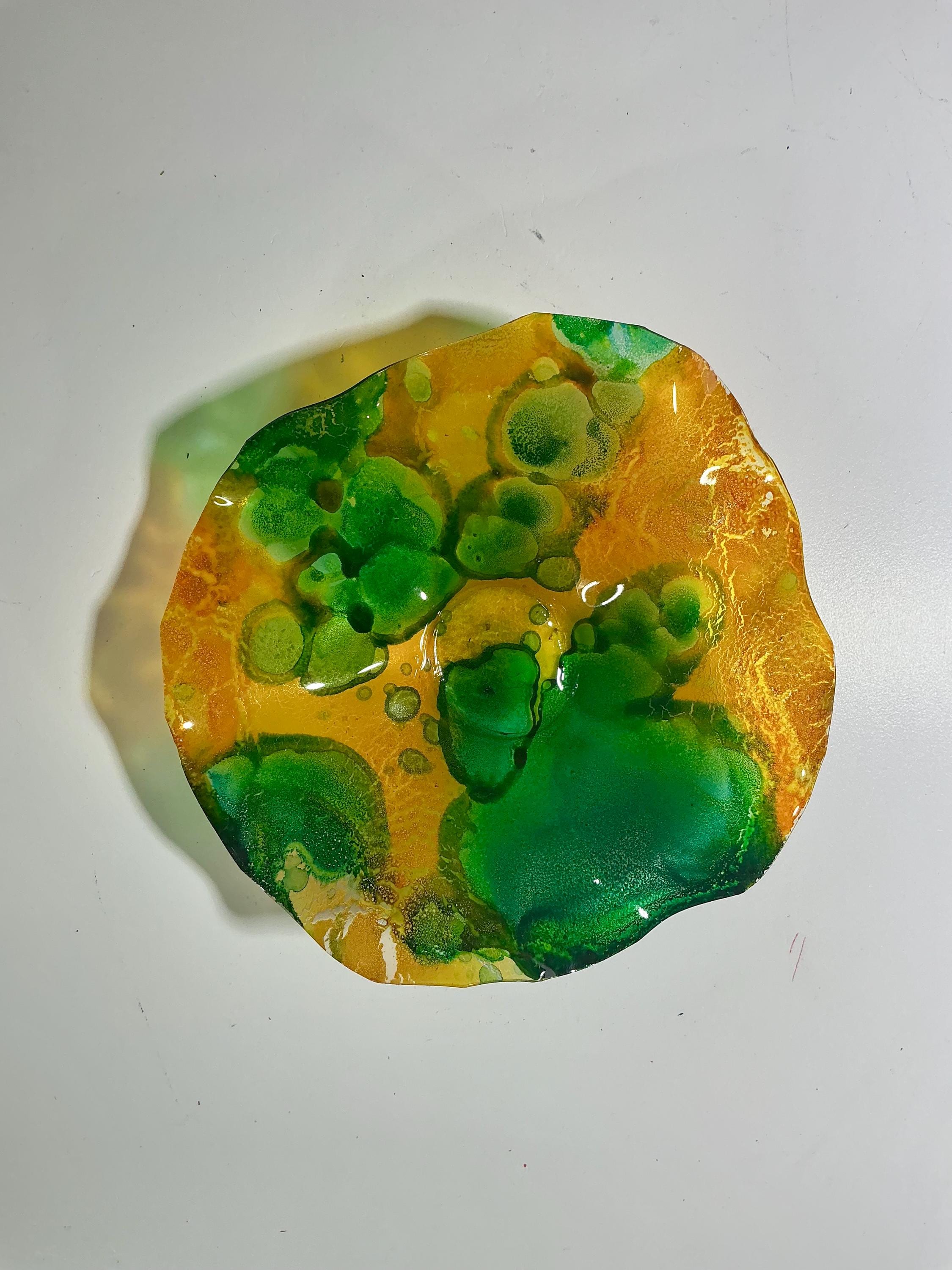 Handmade Wall flower hanging/orange & green home decor recycled plastic extra small 5” looks like glass/ patio wall art
