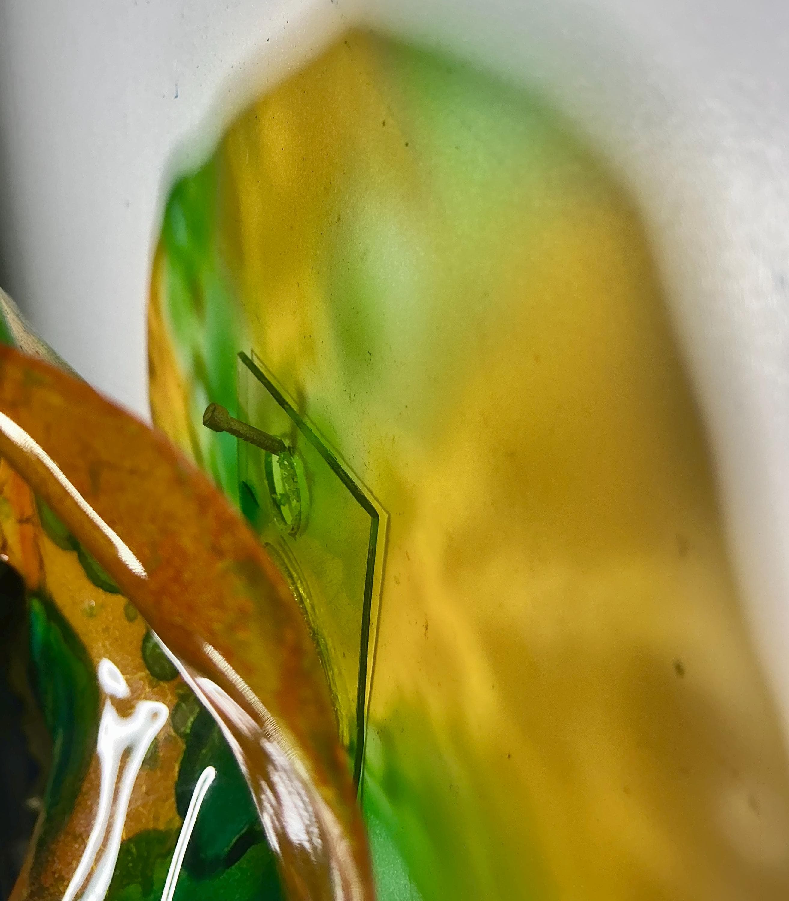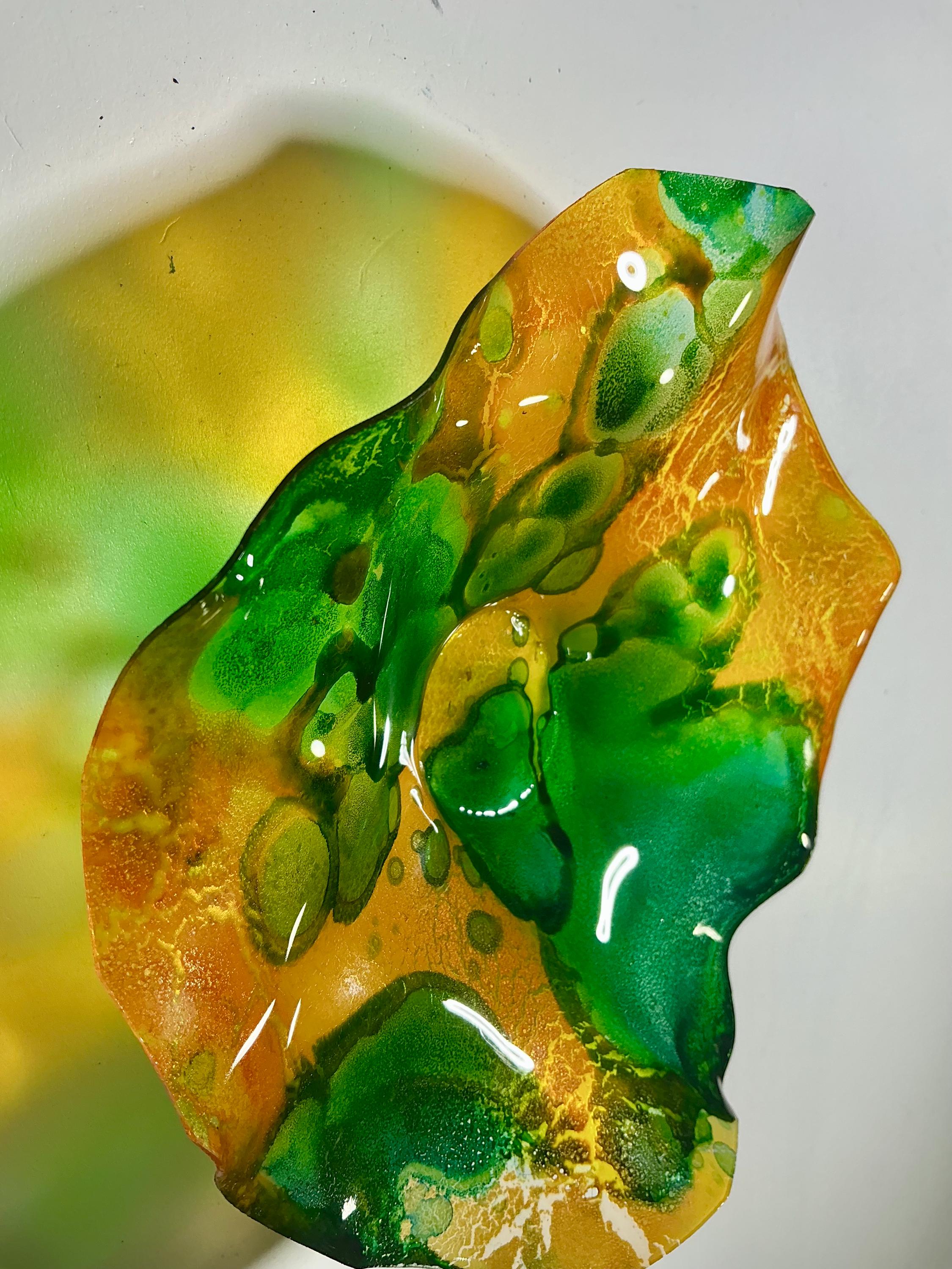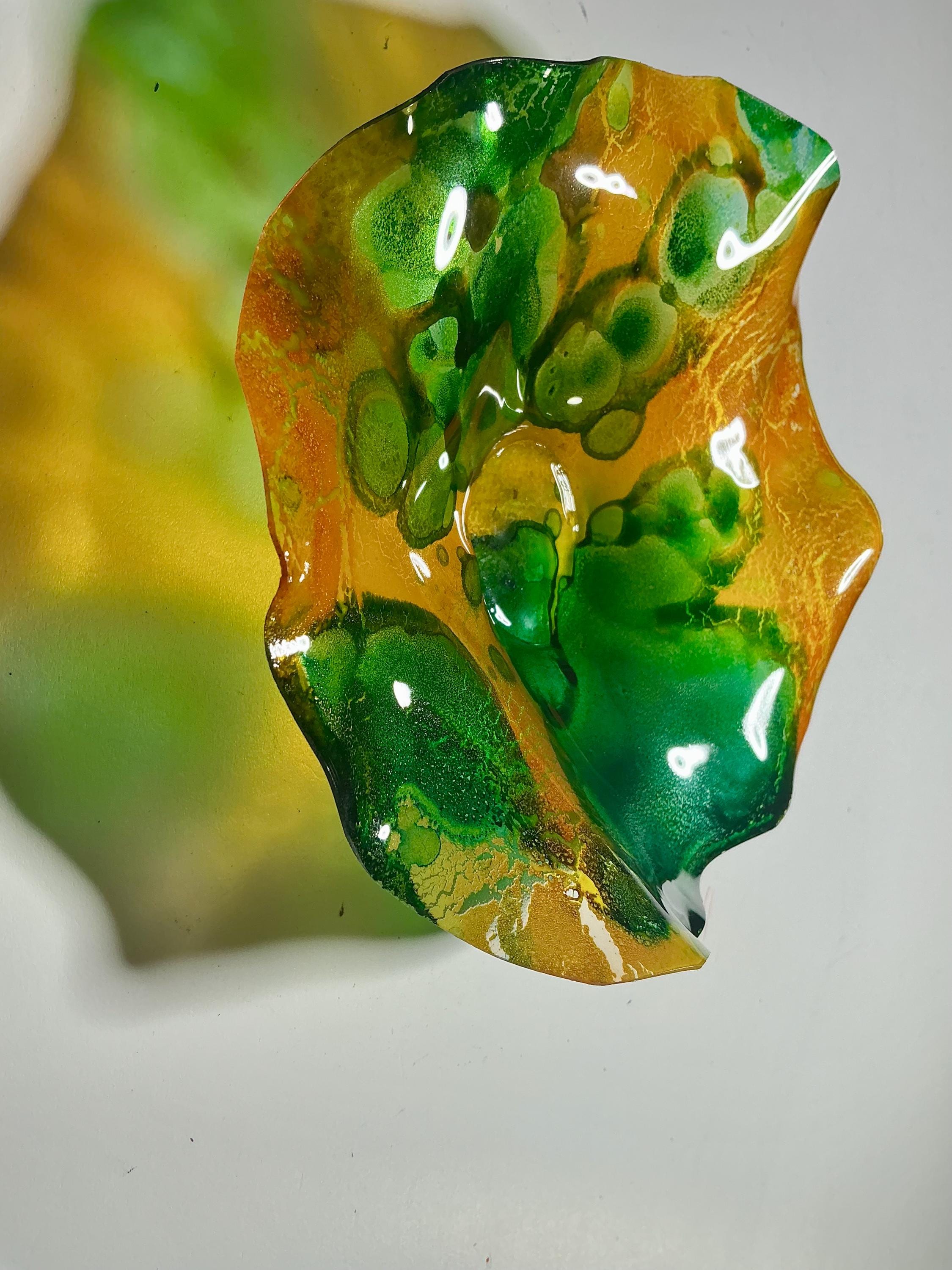 Each collectible piece is unique, no two are alike. This permanent, colorful, eye catching art looks and feels like glass. It shimmers in the light resembling water. They are very DURABLE AND LIGHTWEIGHT. These flowers are easy to hang, are all weather and UV resistant. Great for indoor or outdoor decorating.
