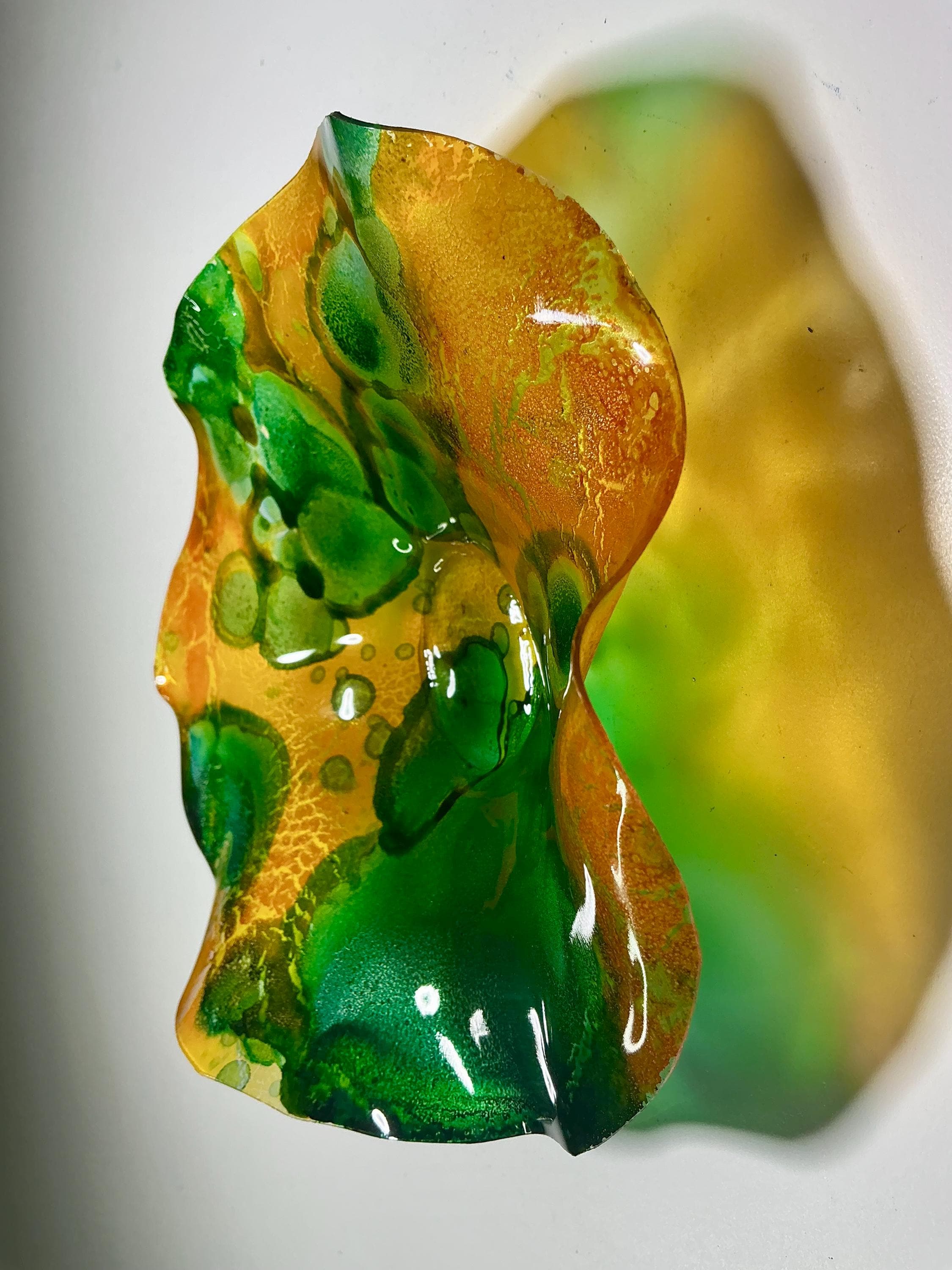 Eye catching wall flower orange and green blend. The light filters through casting a colorful glow to the hanging surface.