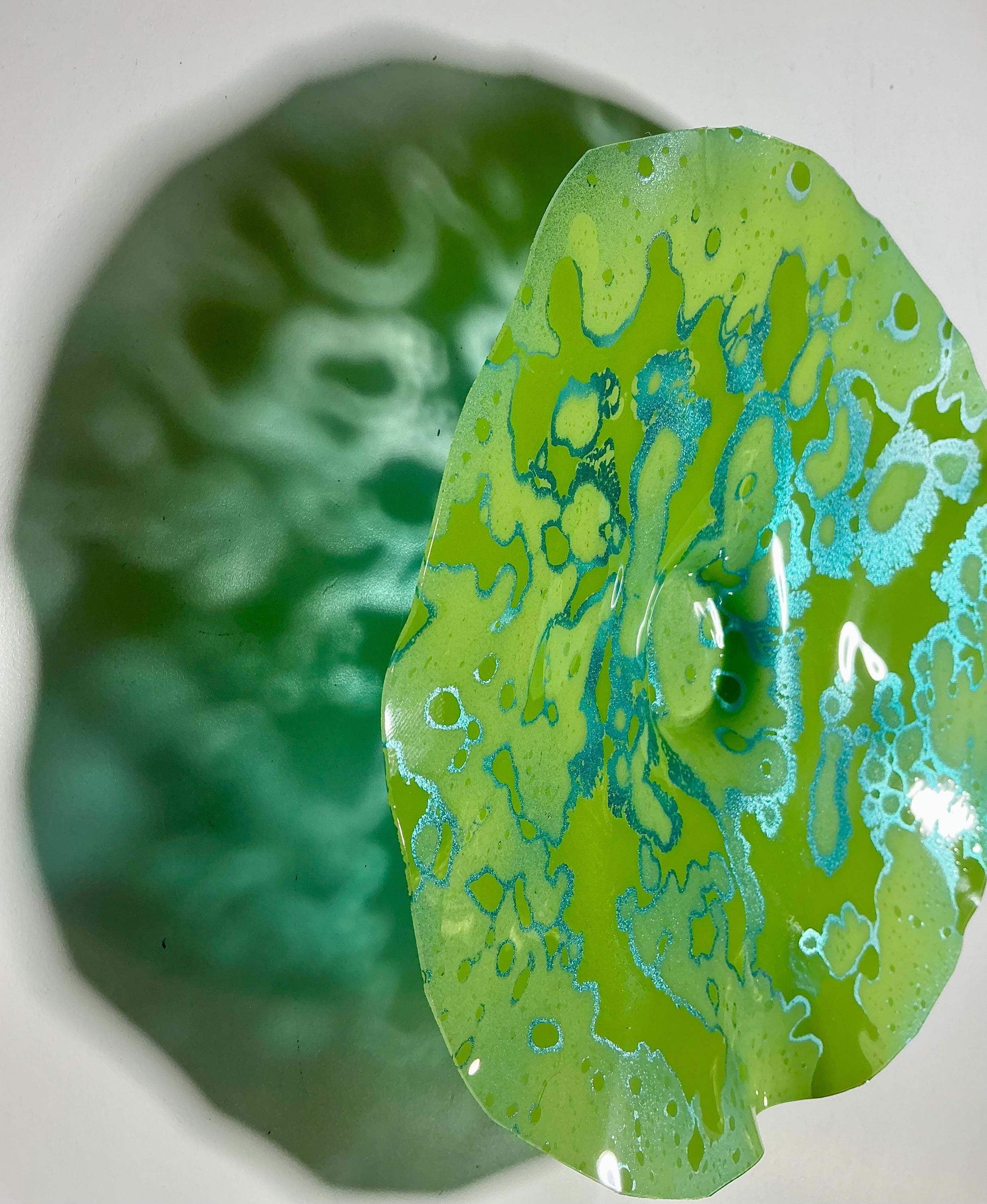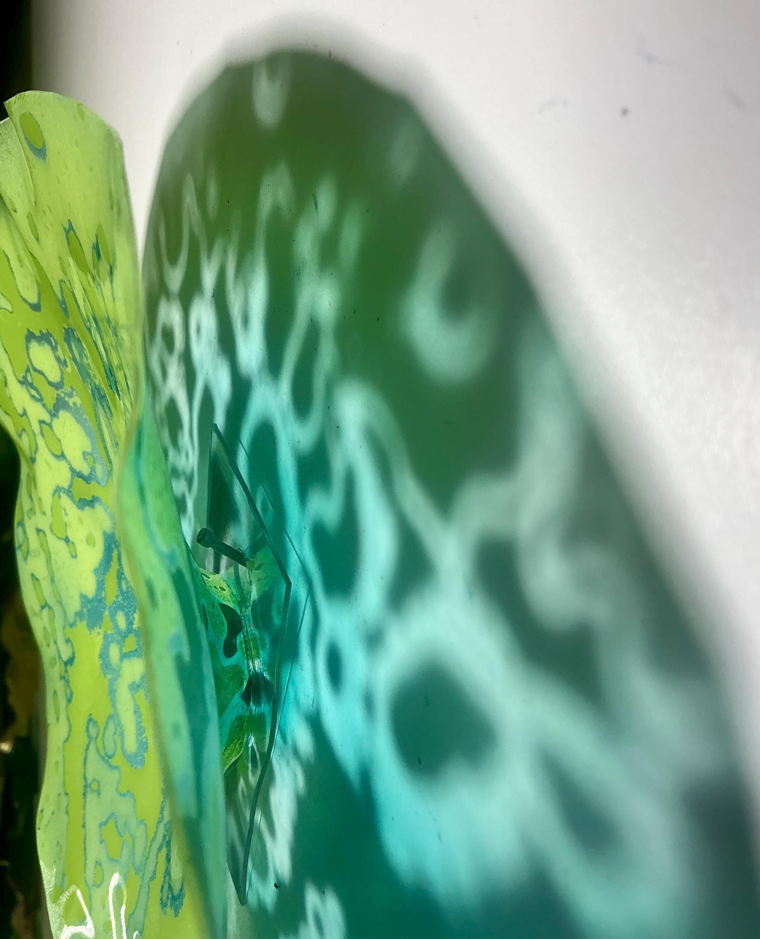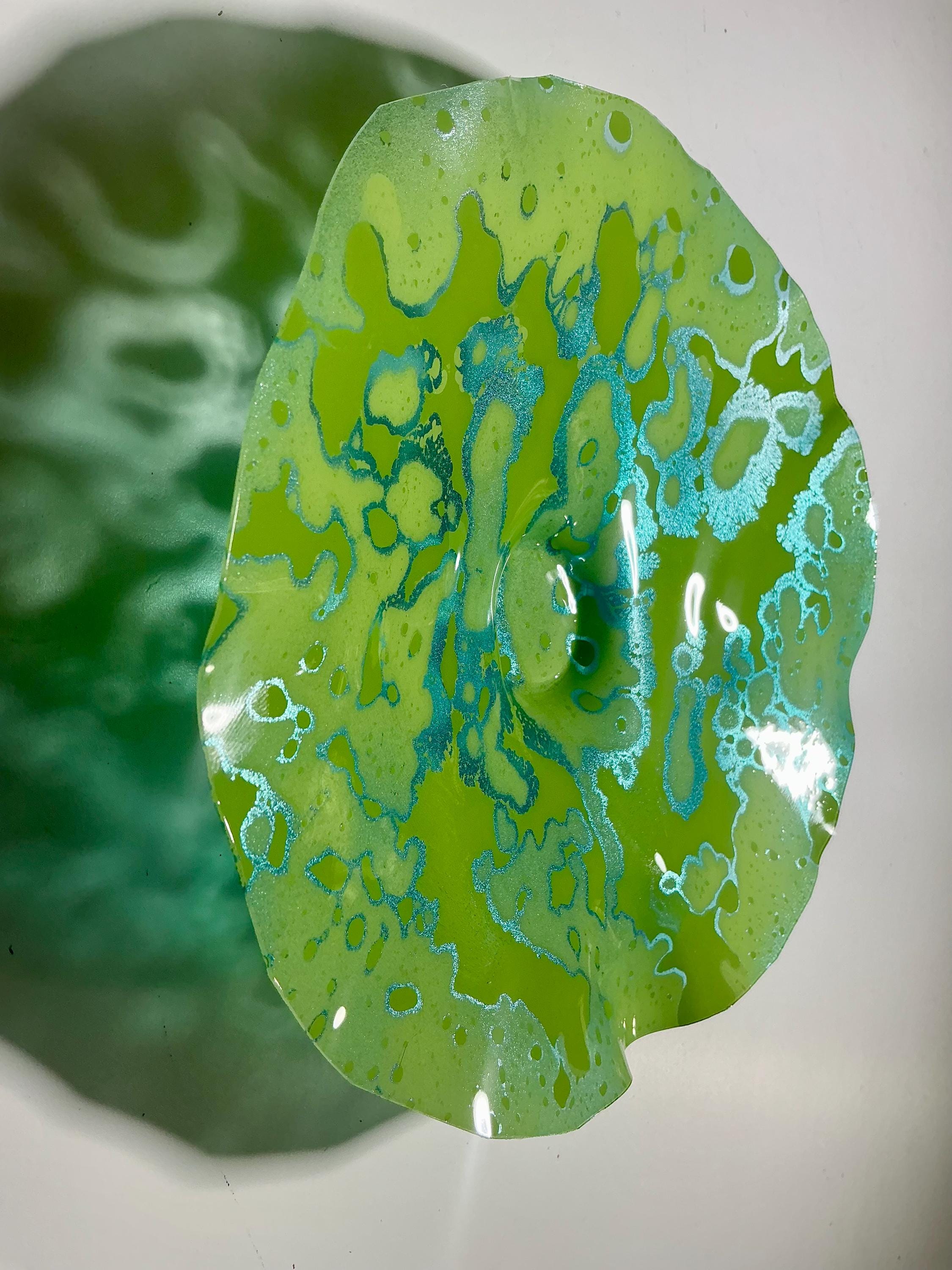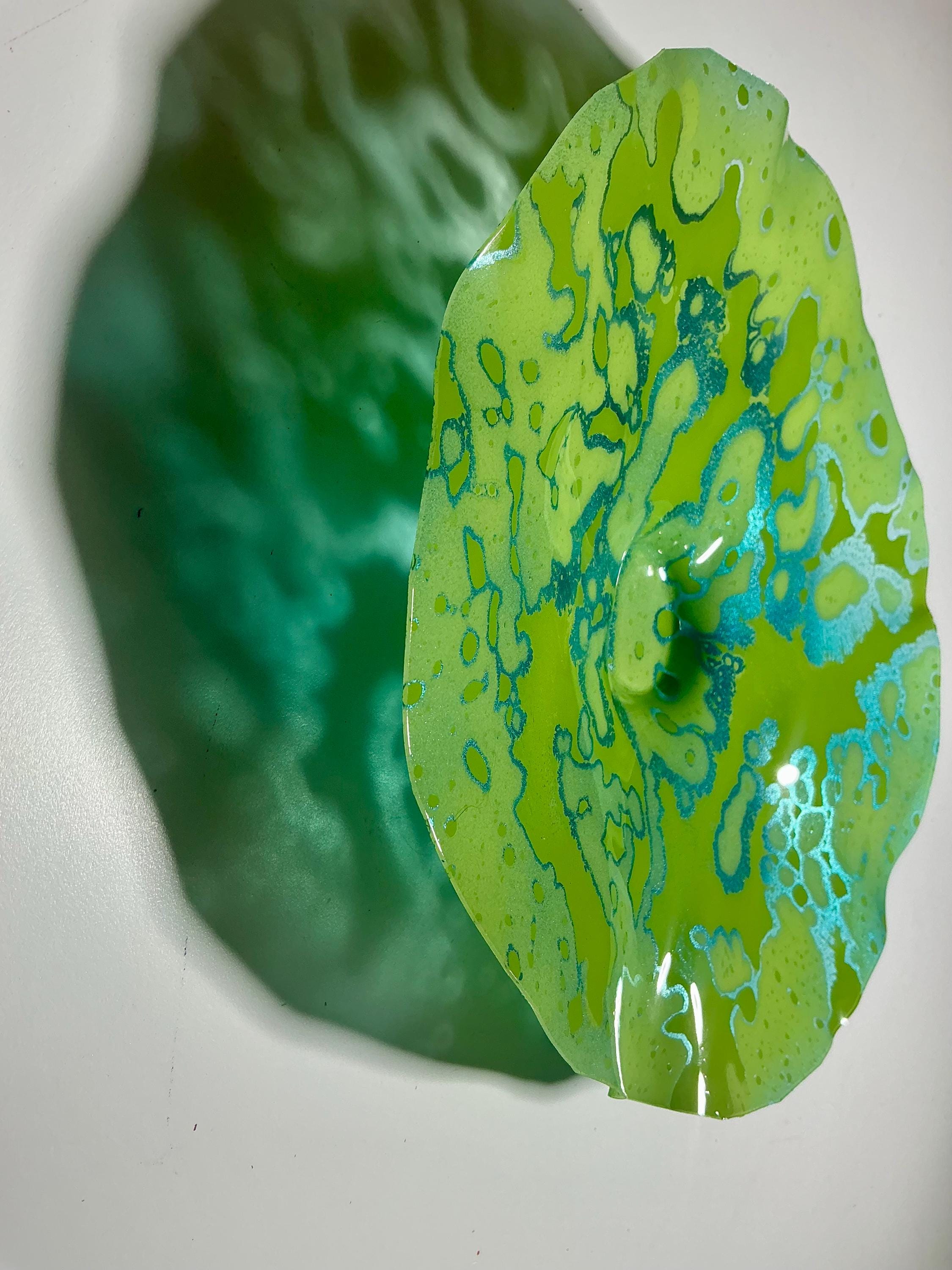 Each collectible piece is unique, no two are alike. This permanent, colorful, eye catching art looks and feels like glass. It shimmers in the light resembling water. They are very DURABLE AND LIGHTWEIGHT. These flowers are easy to hang, all weather and will not fade in the sun. Great for indoor or outdoor decorating.