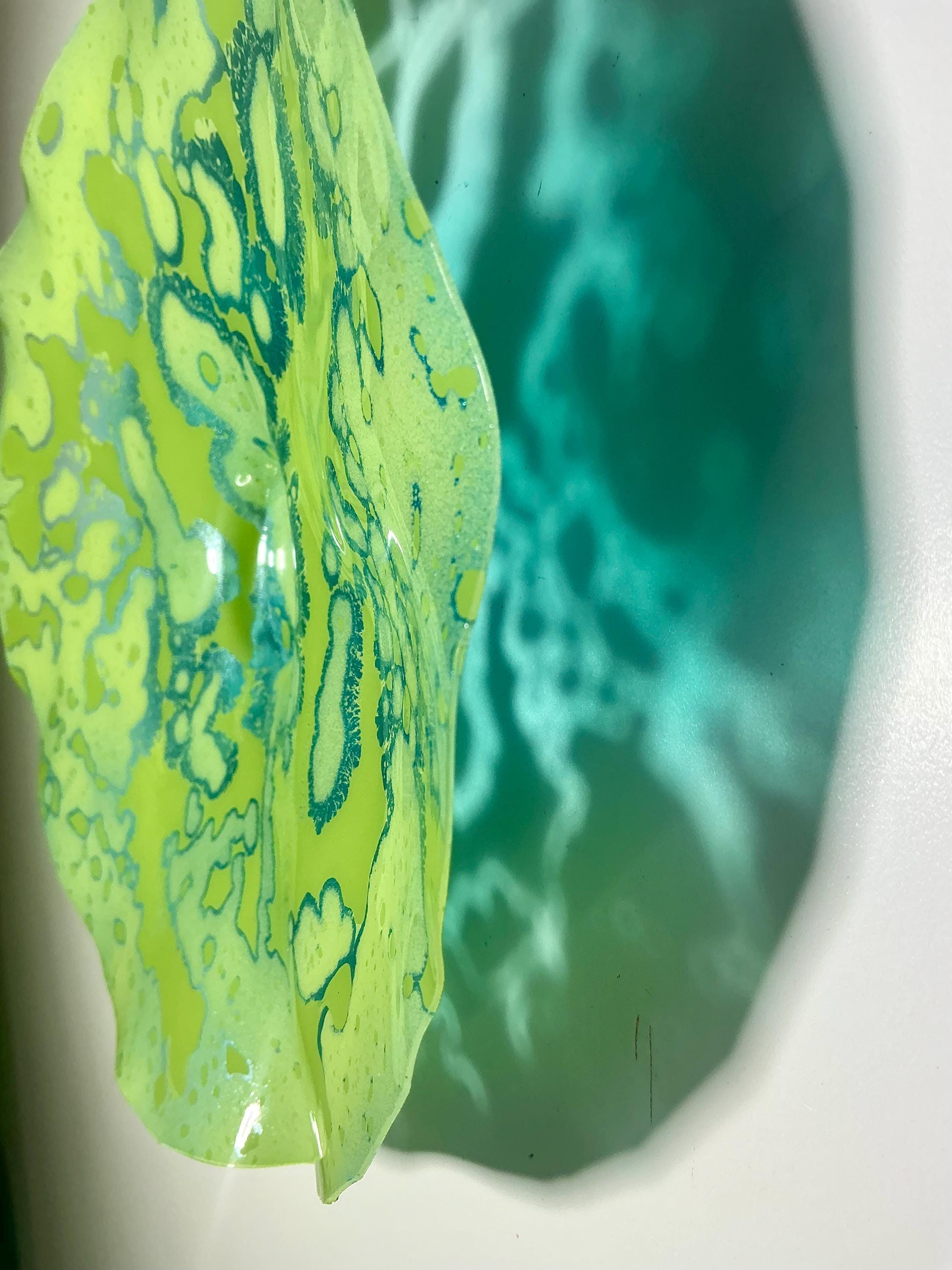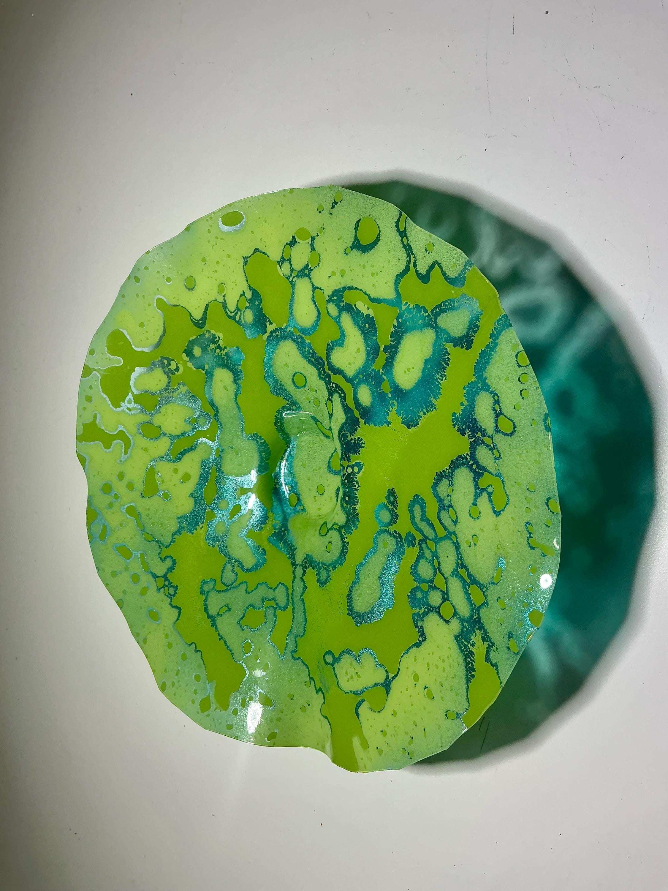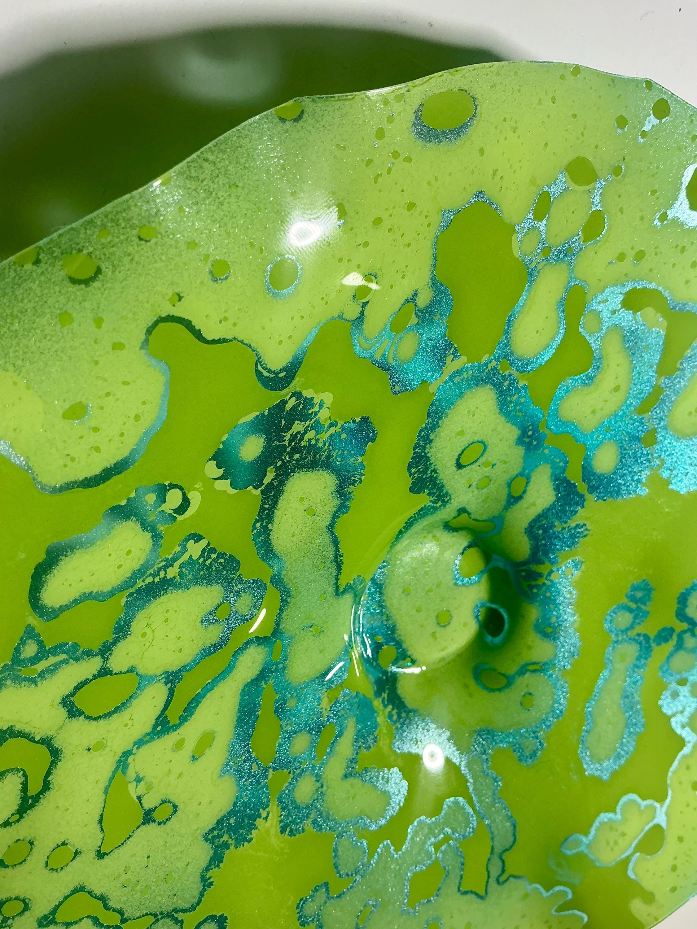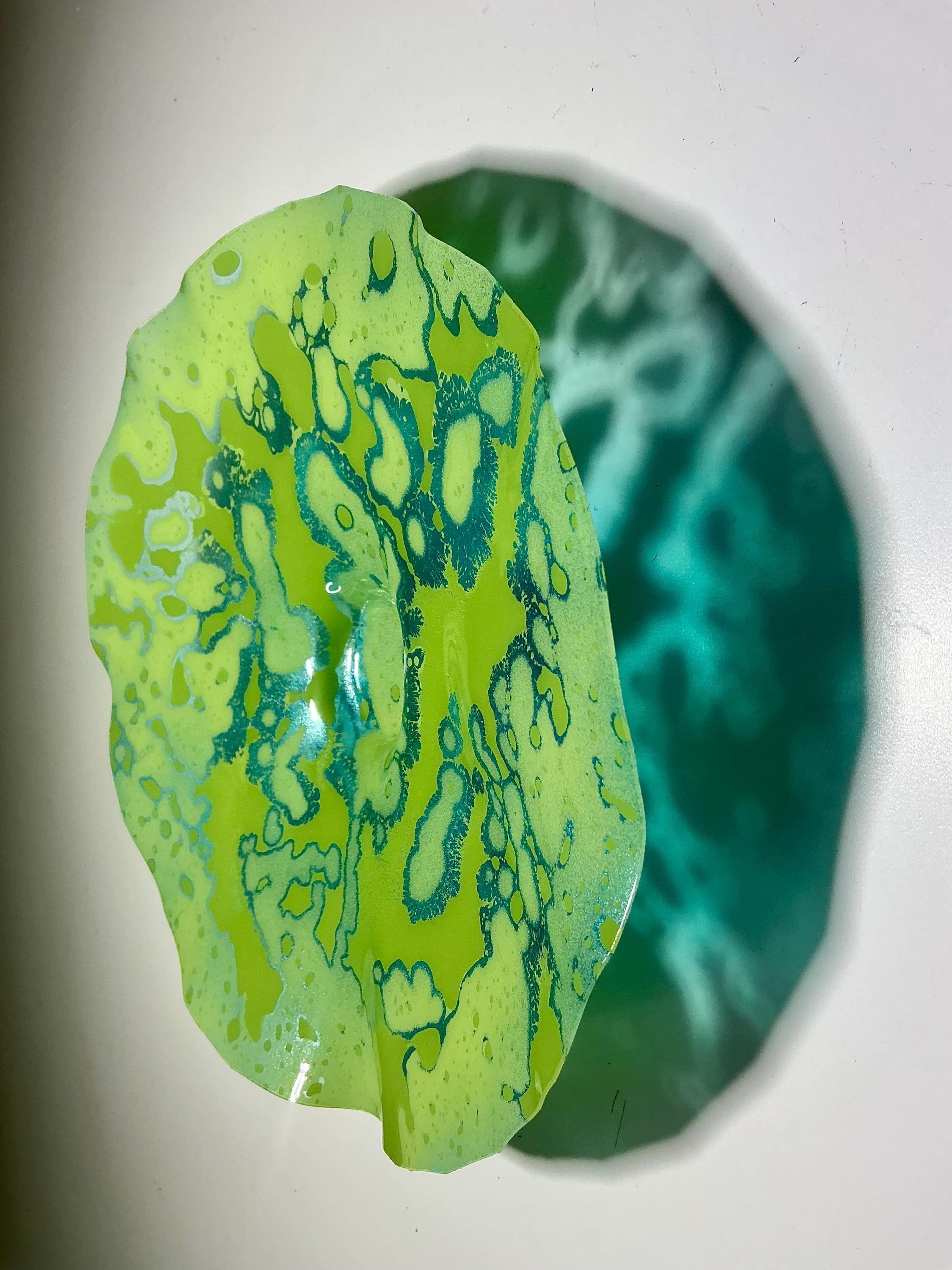 Each collectible piece is unique, no two are alike. This permanent, colorful, eye catching art looks and feels like glass. It shimmers in the light resembling water. They are very DURABLE AND LIGHTWEIGHT. These flowers are easy to hang, all weather and will not fade in the sun. Great for indoor or outdoor decorating.