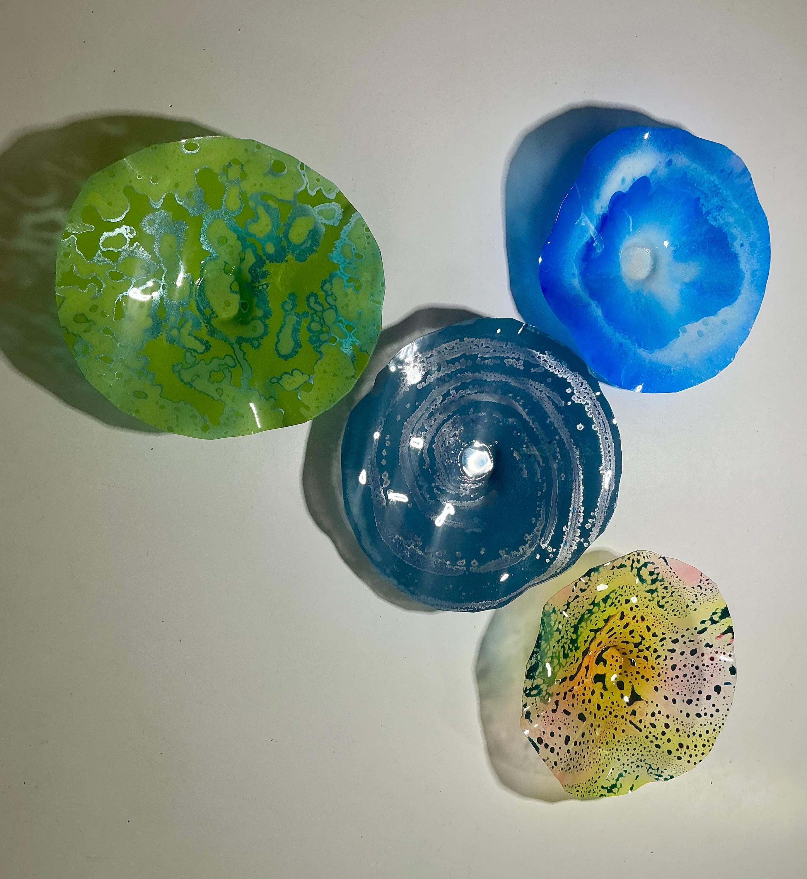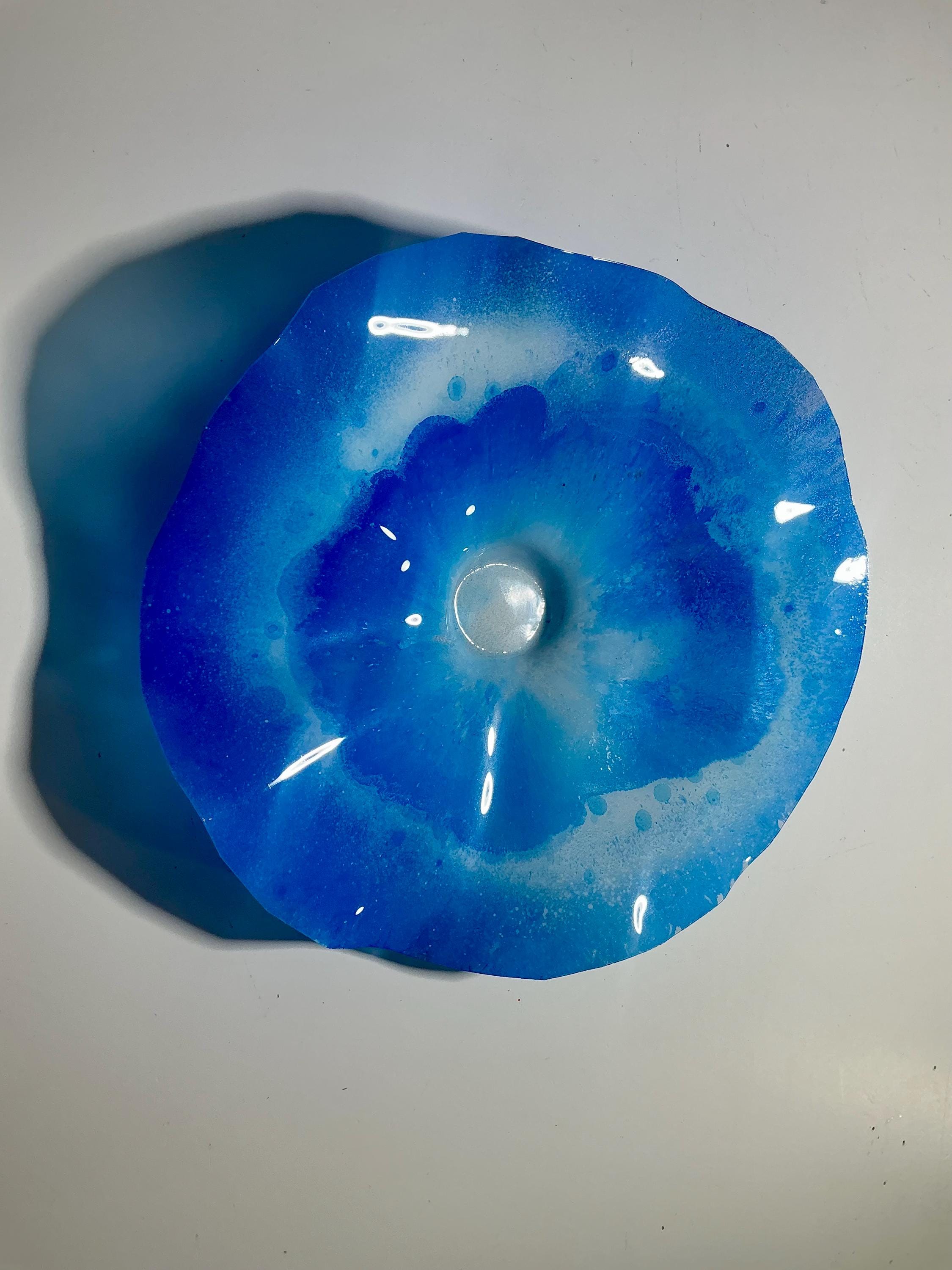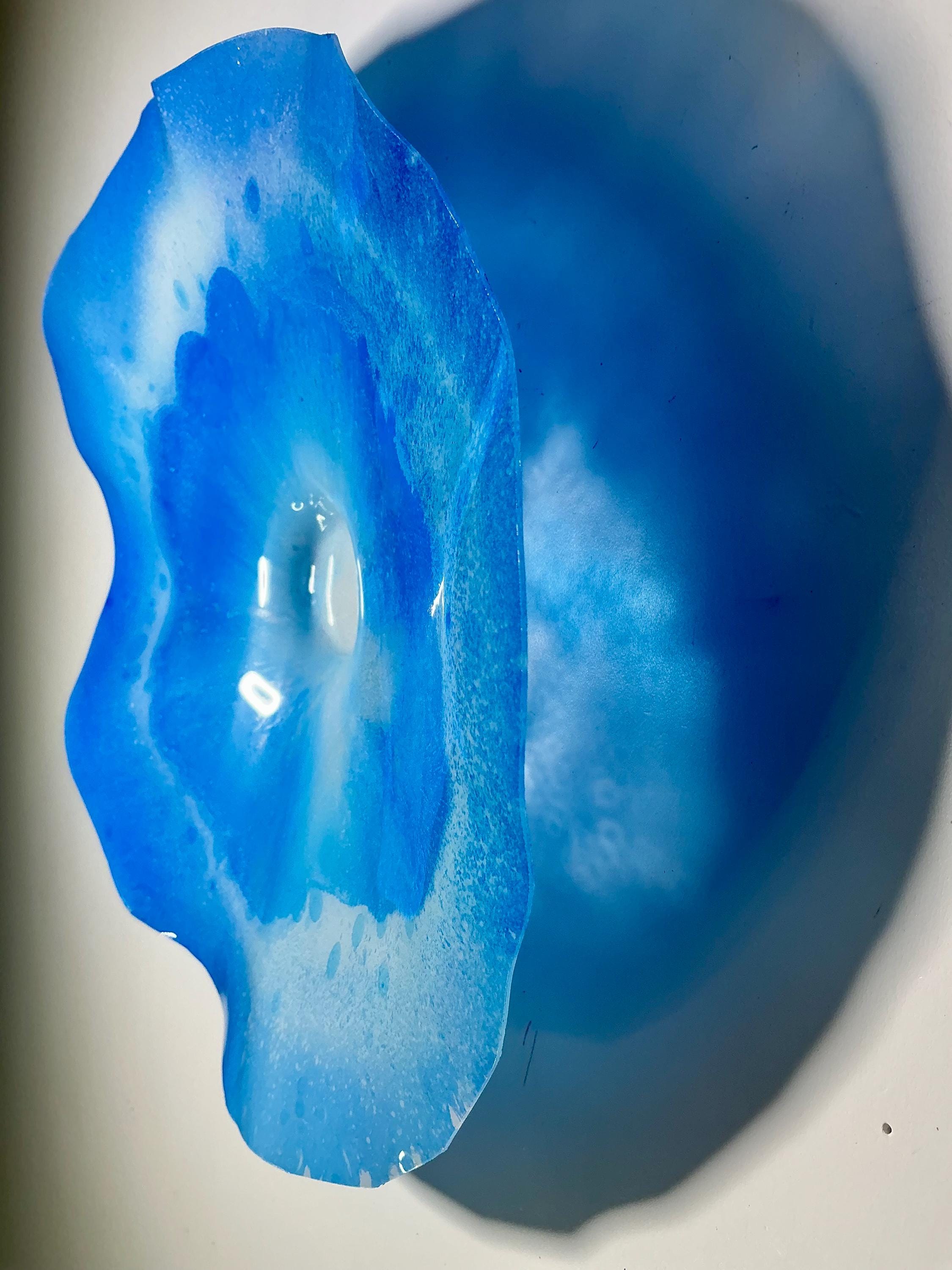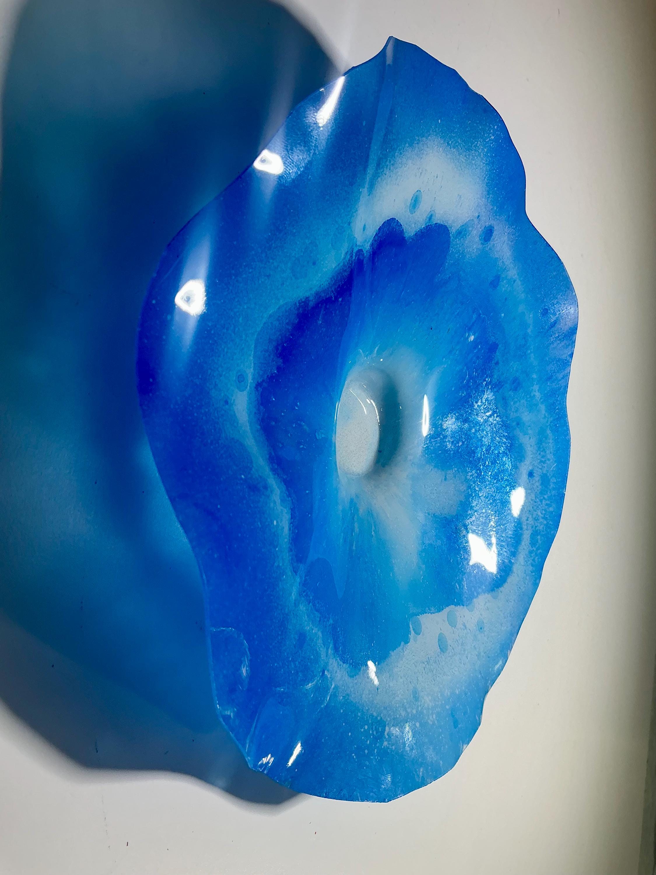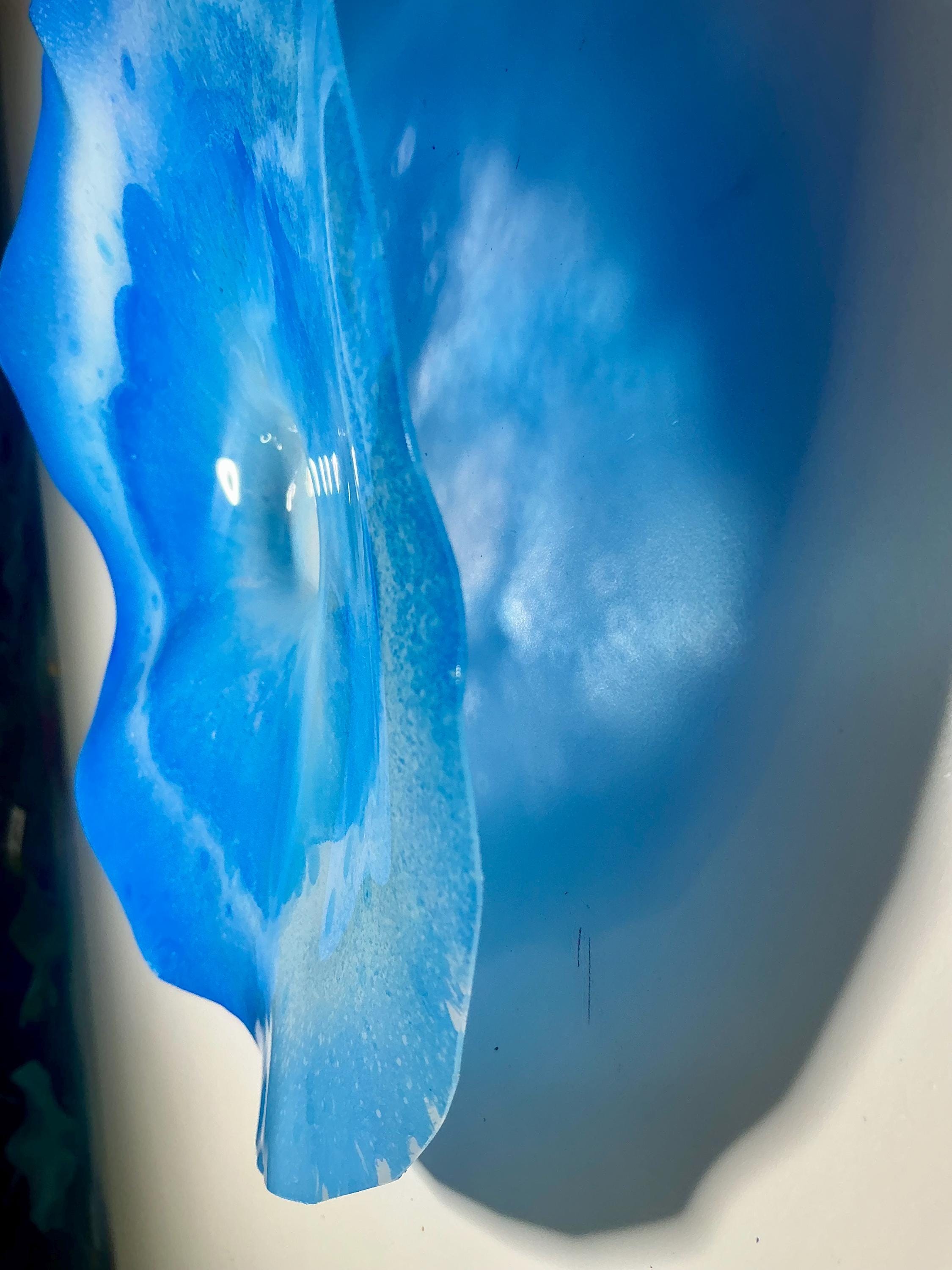 Each collectible piece is unique, no two are alike. This permanent, colorful, eye catching art looks and feels like glass. It shimmers in the light resembling water. They are very DURABLE AND LIGHTWEIGHT. These flowers are easy to hang, are all weather and UV resistant. Great for indoor or outdoor decorating.