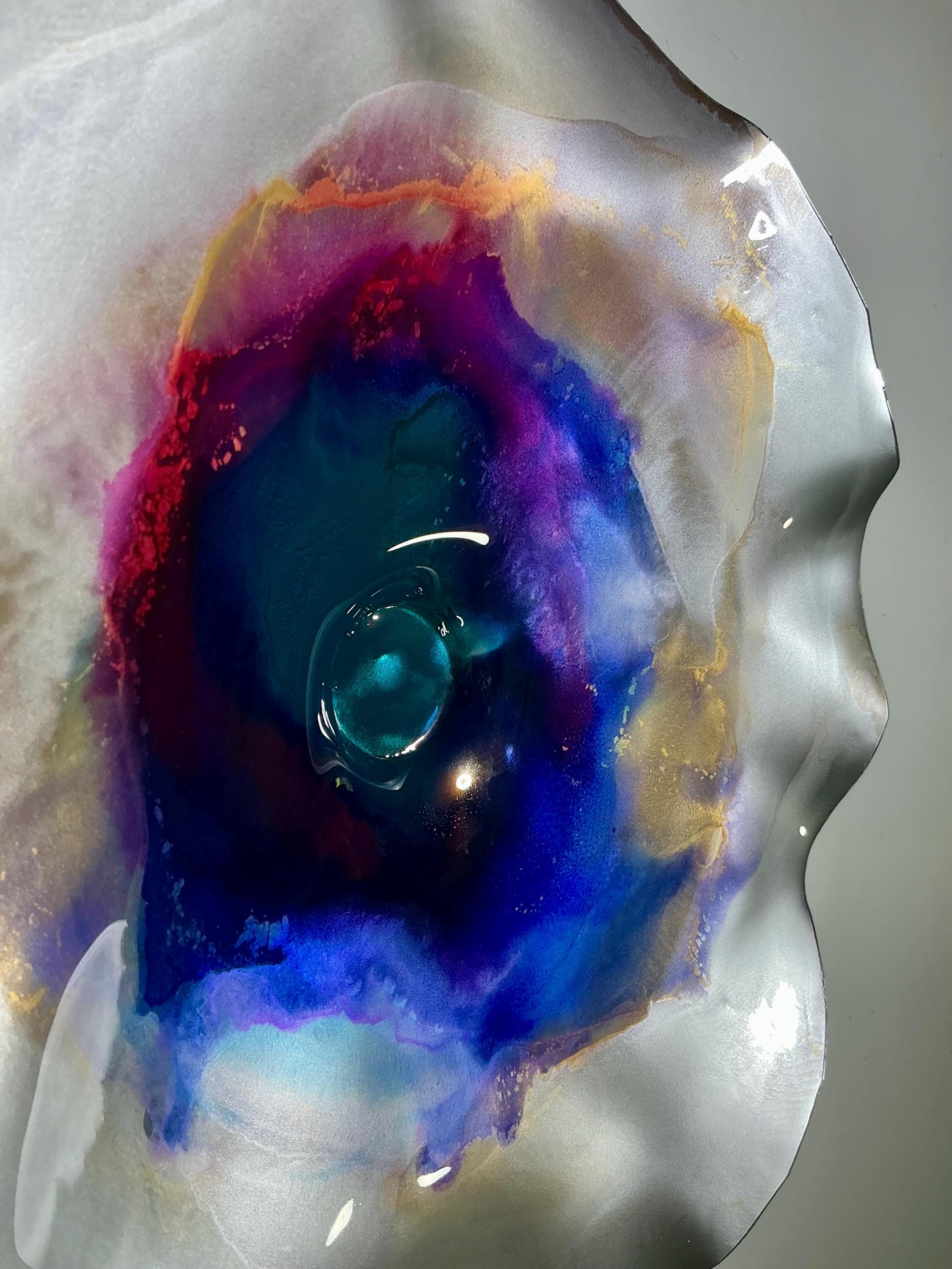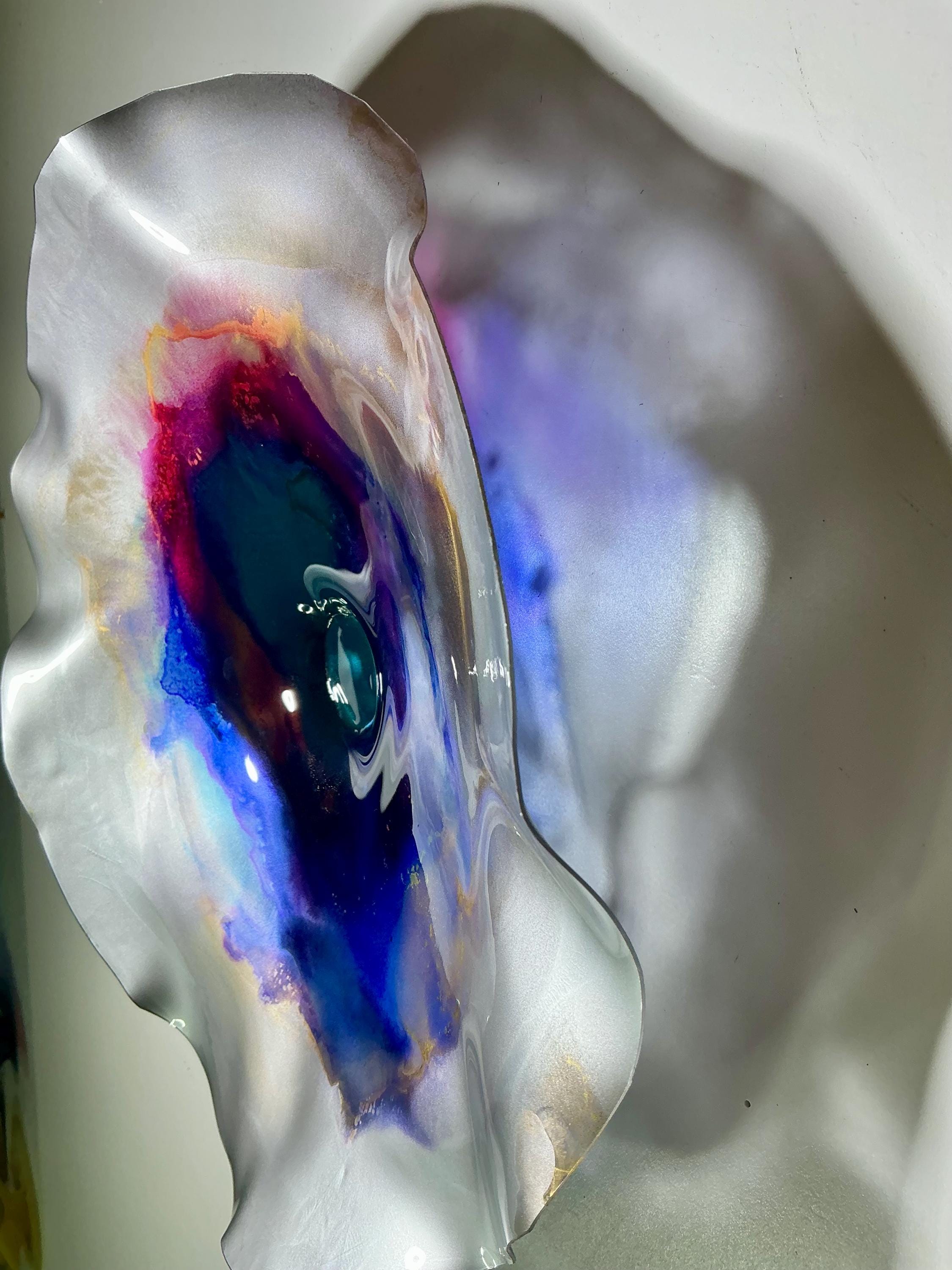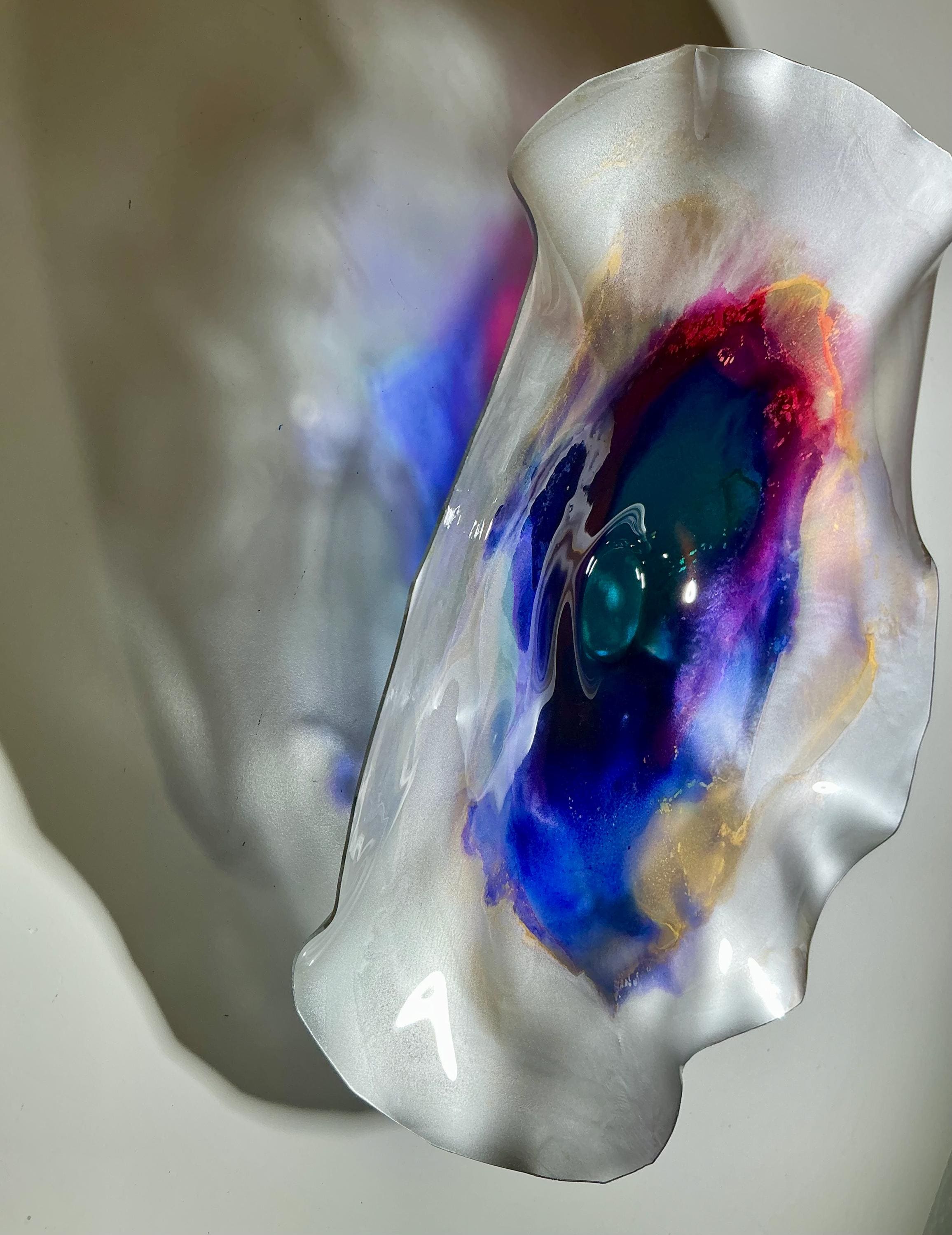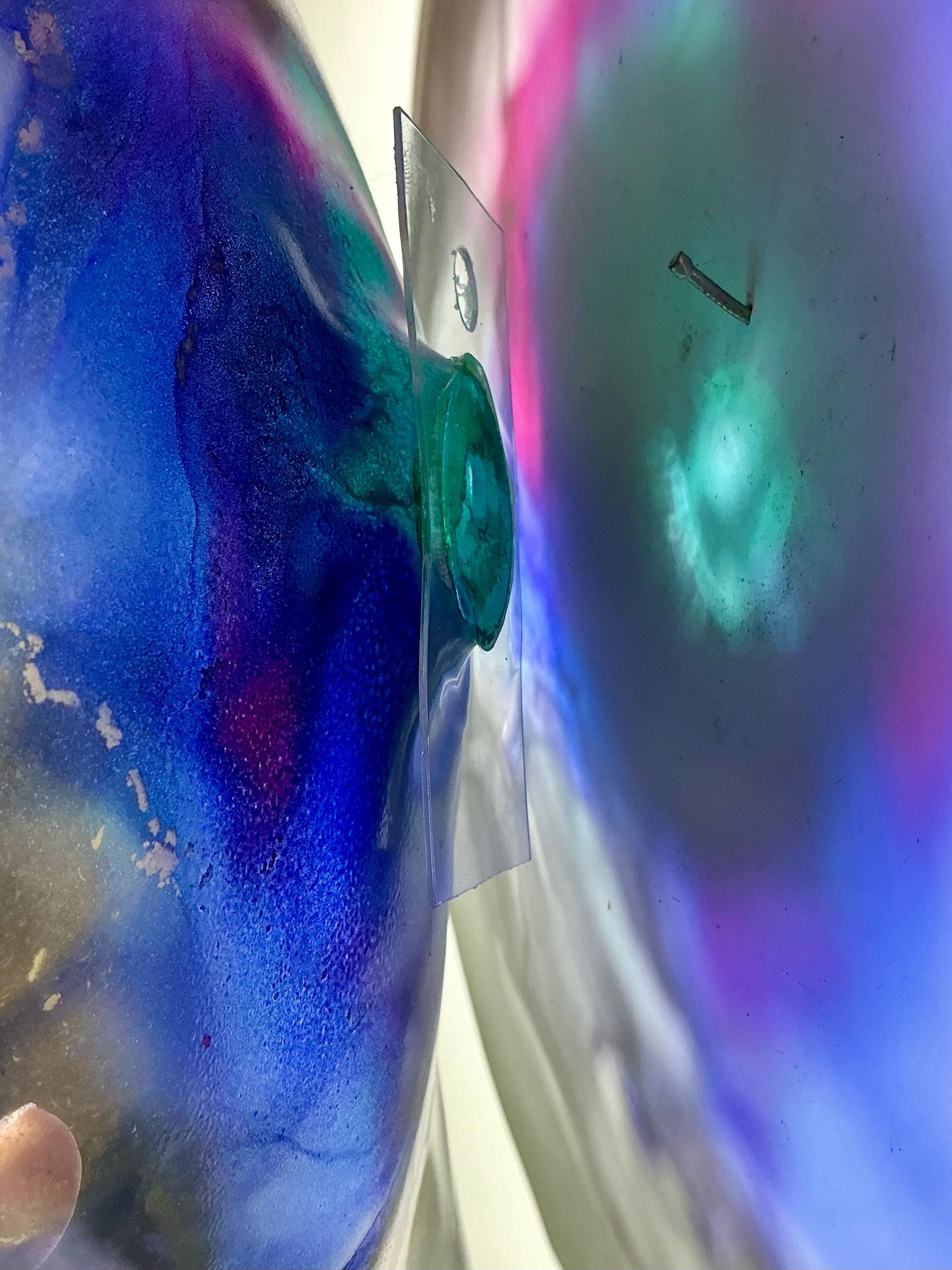 Each collectible piece is unique, no two are alike. This permanent, colorful, eye catching art looks and feels like glass. It shimmers in the light resembling water. They are very DURABLE AND LIGHTWEIGHT. This flower is easy to hang all weather and UV resistant. Great for indoor or outdoor decorating.