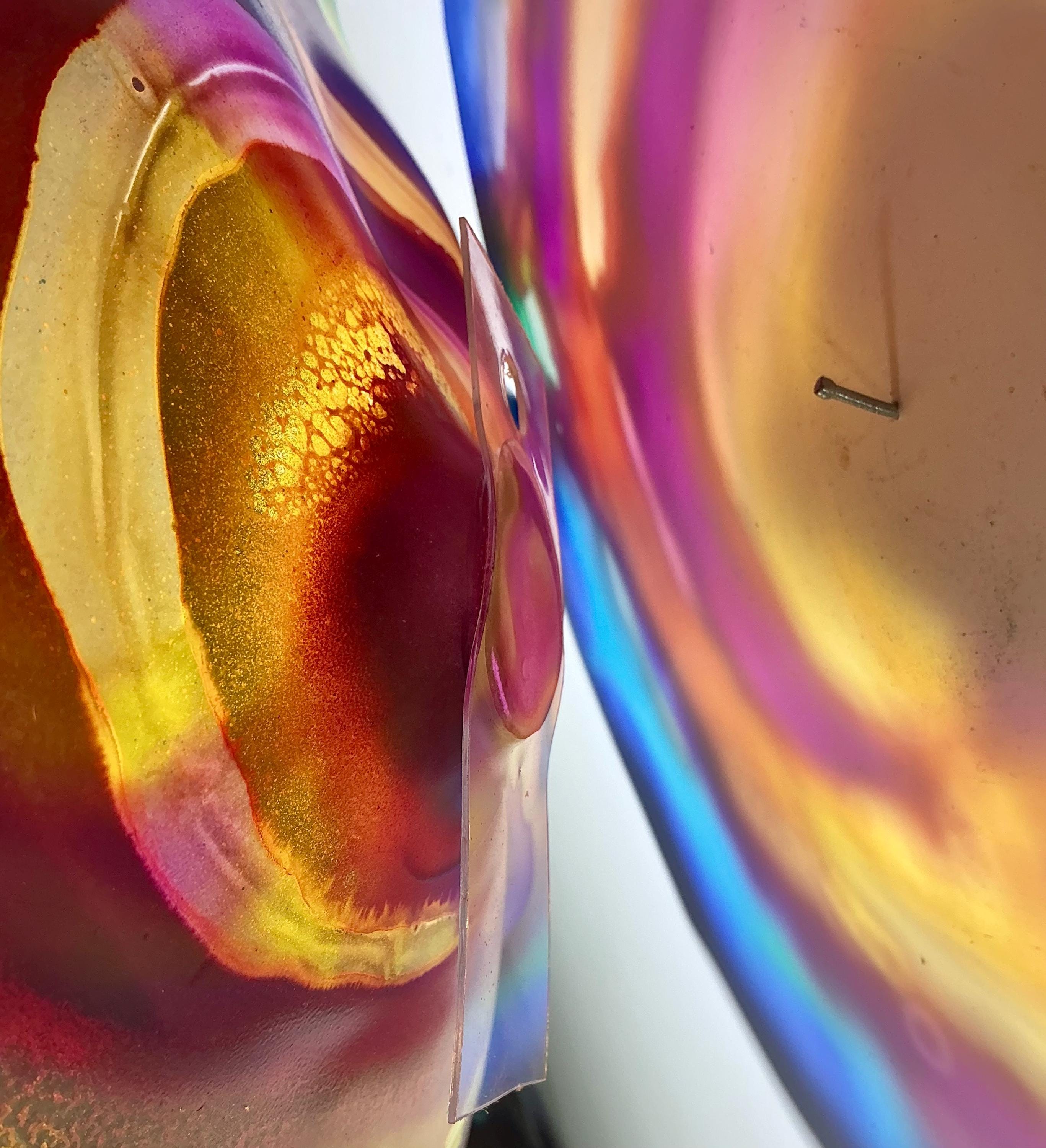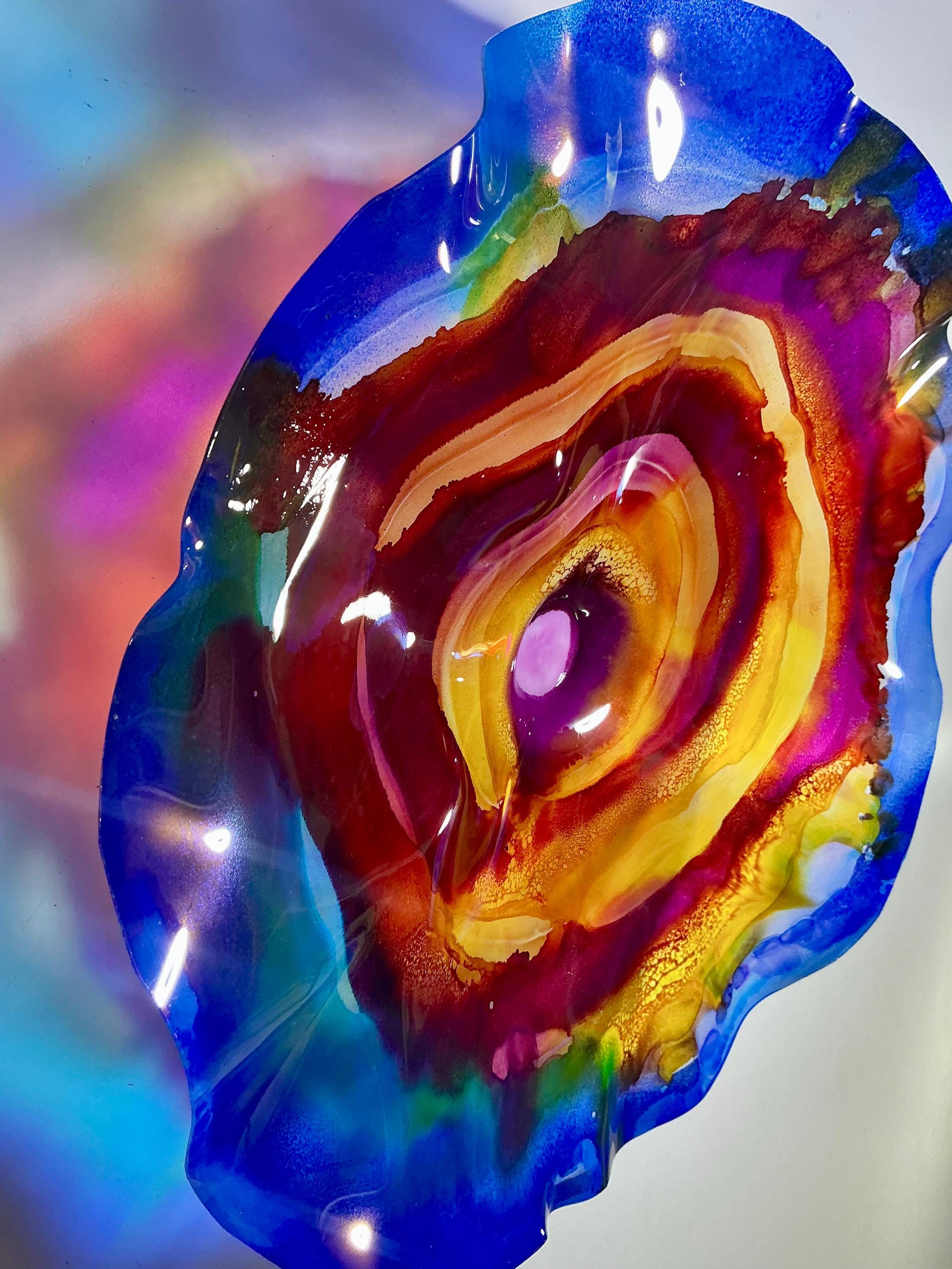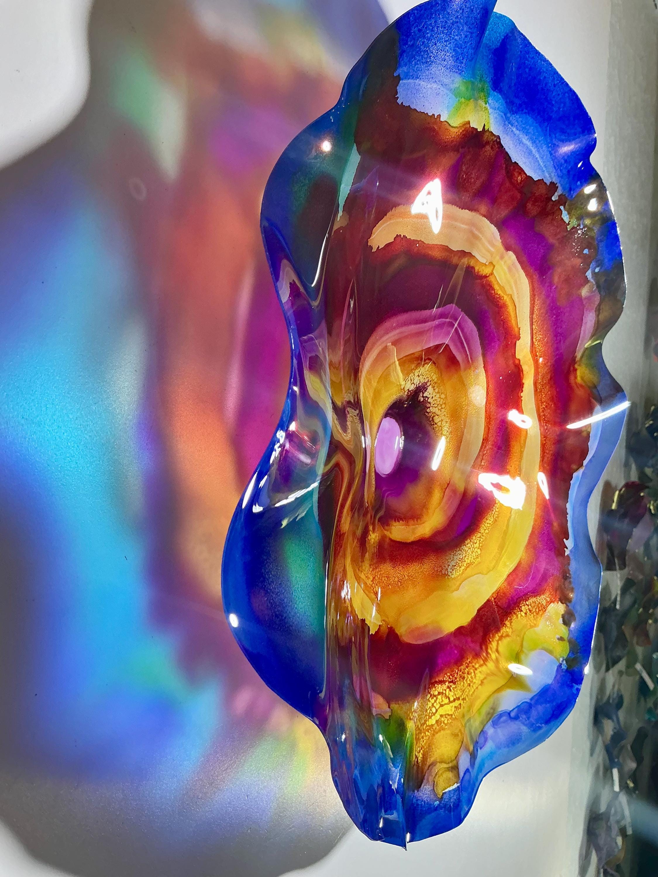 Each collectible piece is unique, no two are alike. This permanent, colorful, eye catching art looks like glass. It shimmers in the light resembling water. They are very DURABLE AND LIGHTWEIGHT. These flowers are easy to hang, all weather , and UV resistant. Great for indoor or outdoor decorating.