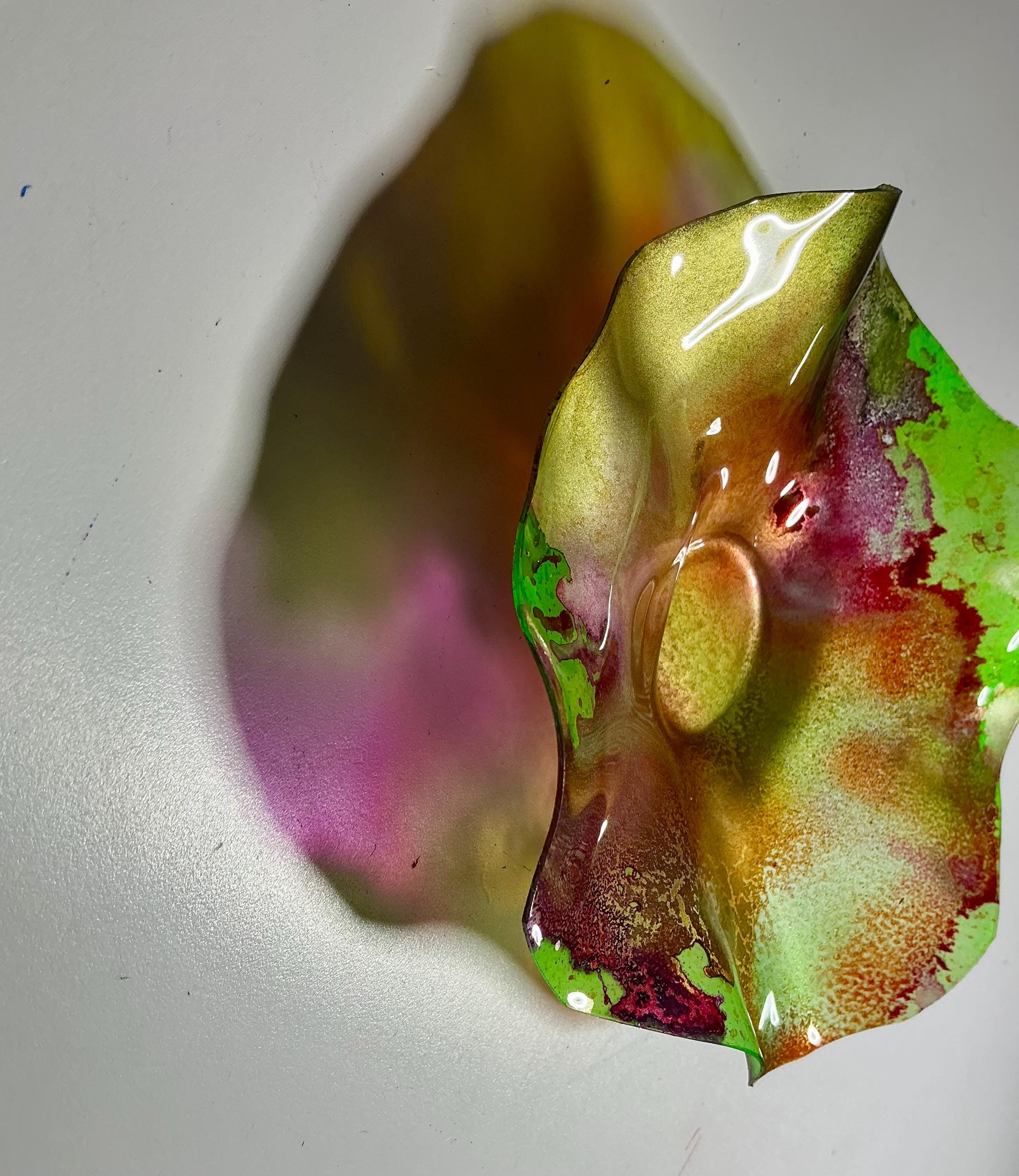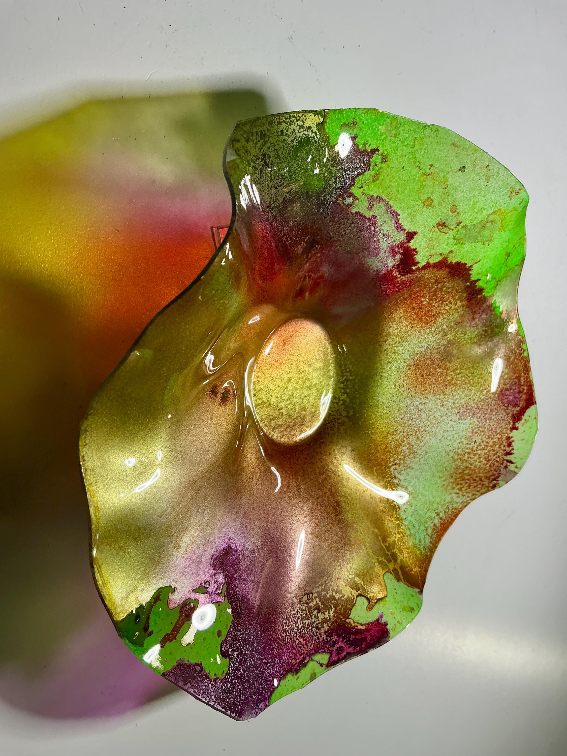 Each collectible piece is unique, no two are alike. This permanent, colorful, eye catching art looks and feels like glass. It shimmers in the light resembling water. They are very DURABLE AND LIGHTWEIGHT. These flowers are easy to hang ,are all weather and UV resistant. Great for indoor or outdoor decorating.