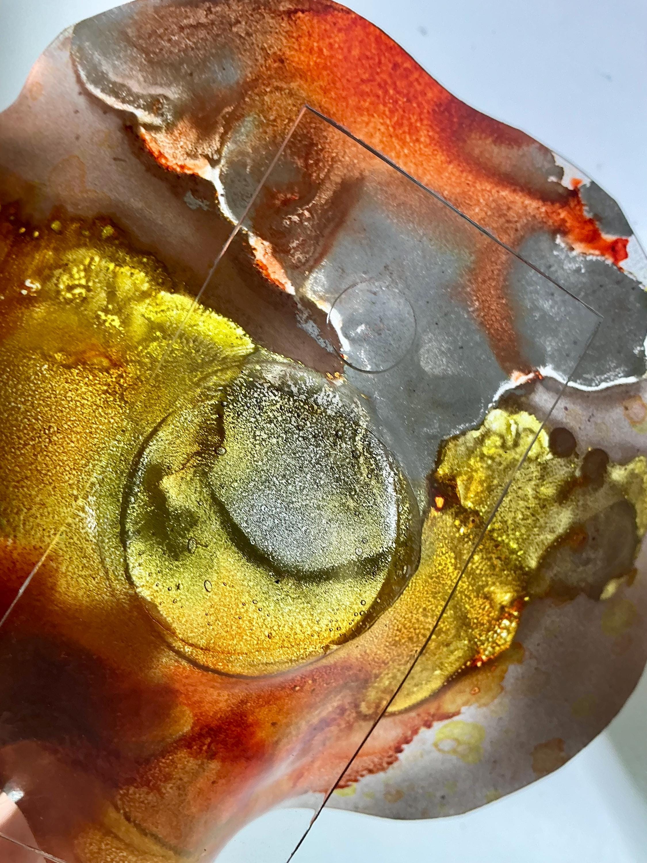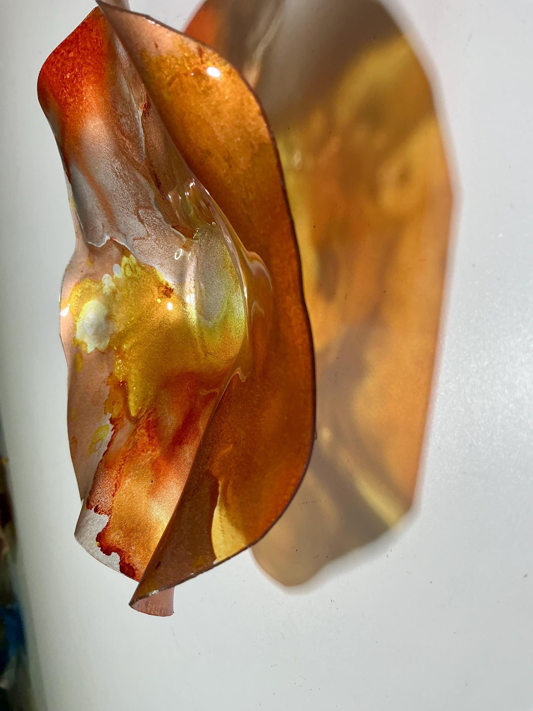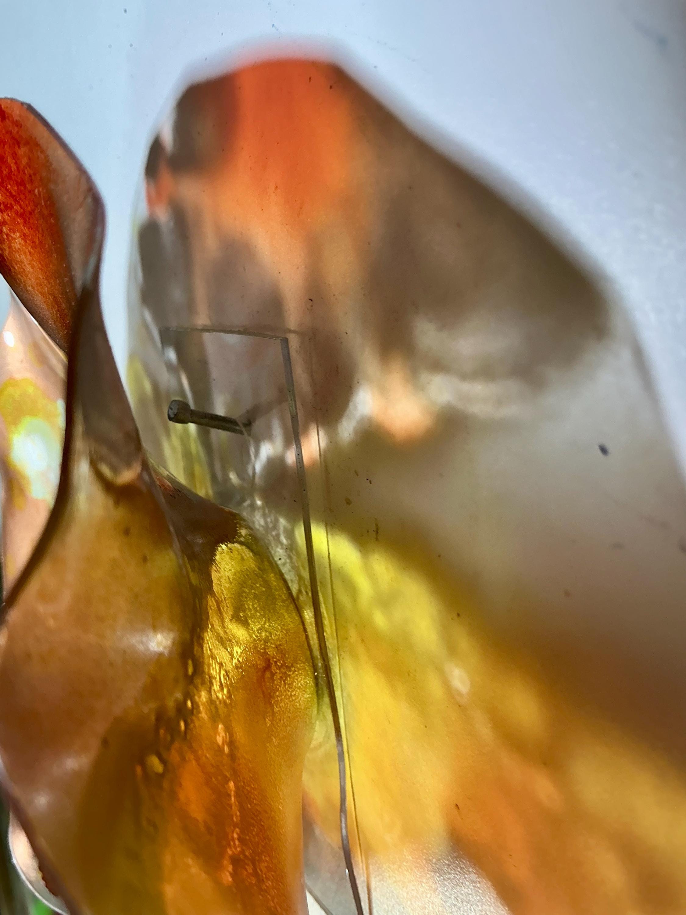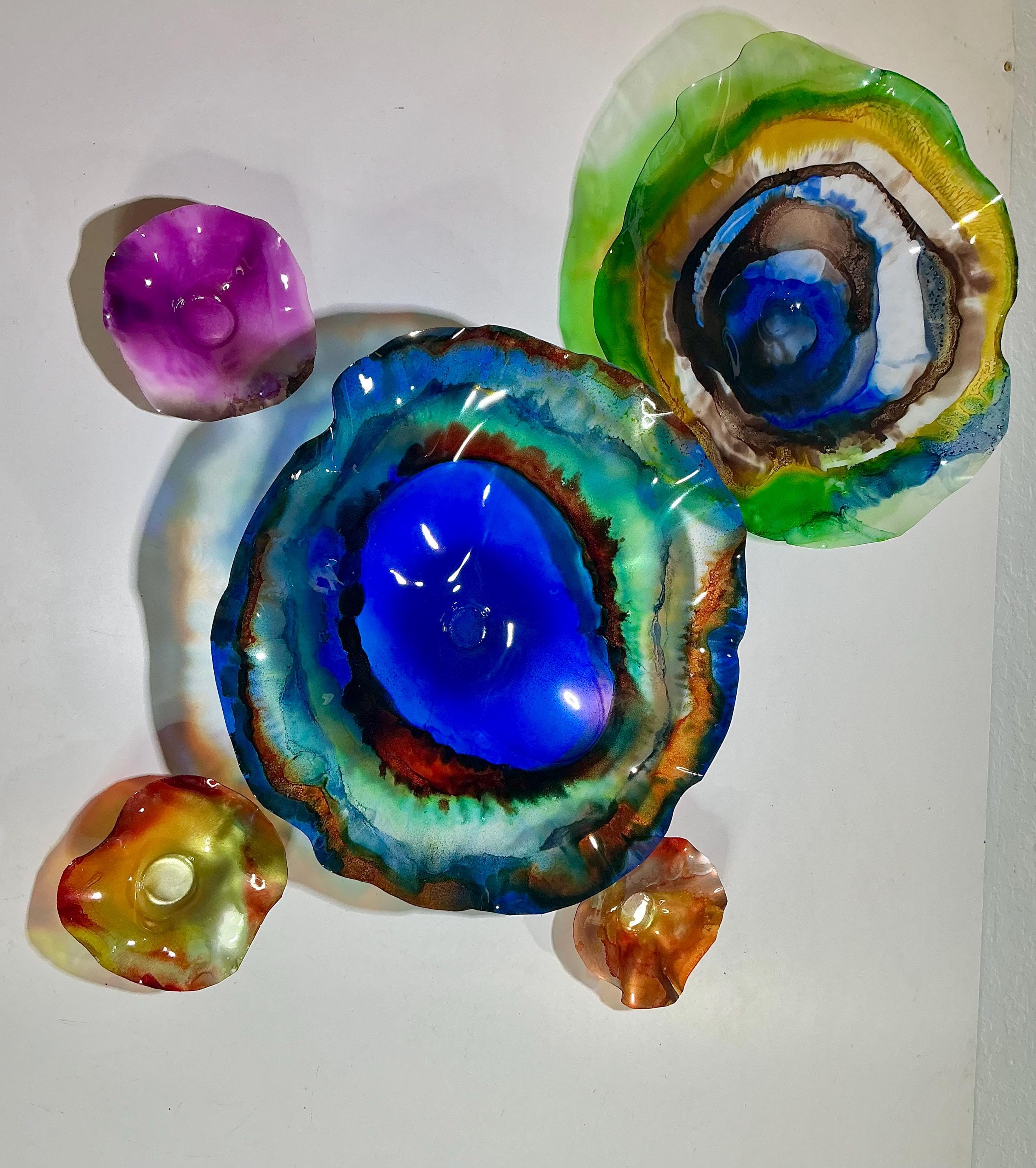 Each collectible piece is unique, no two are alike. This permanent, colorful, eye catching art looks and feels like glass. It shimmers in the light resembling water. They are very DURABLE AND LIGHTWEIGHT. These flowers are easy to hang ,are all weather and UV resistant. Great for indoor or outdoor decorating.