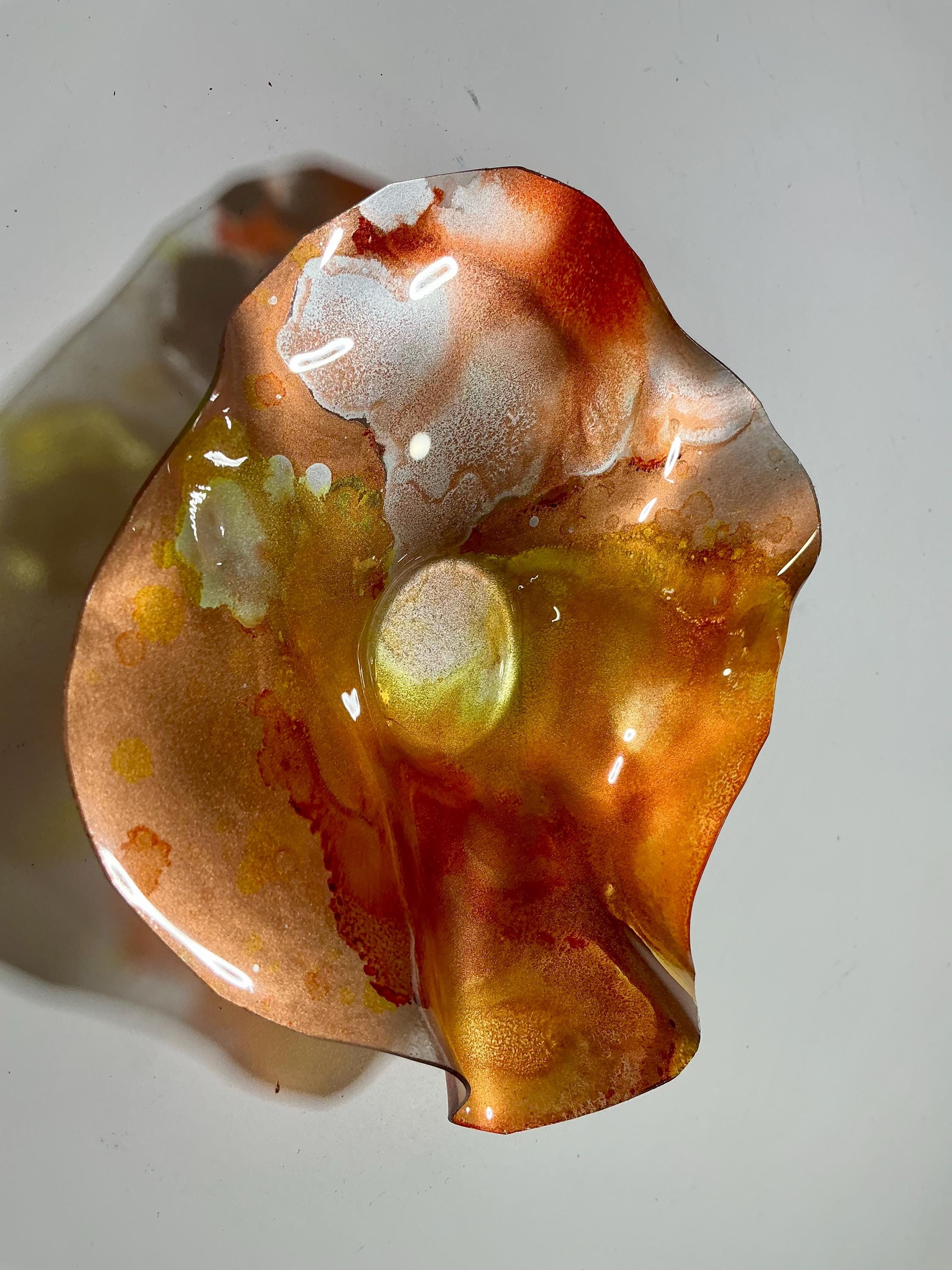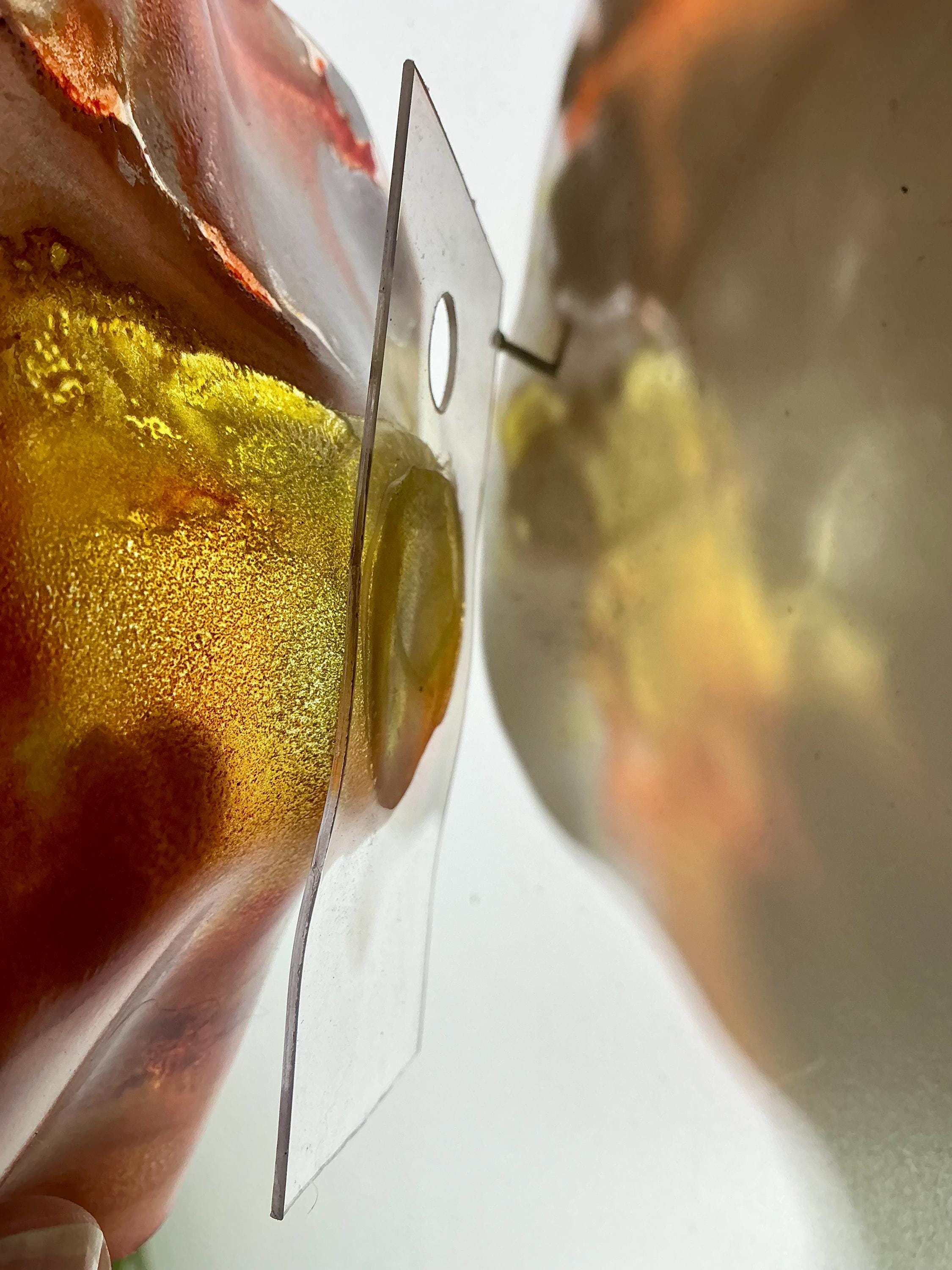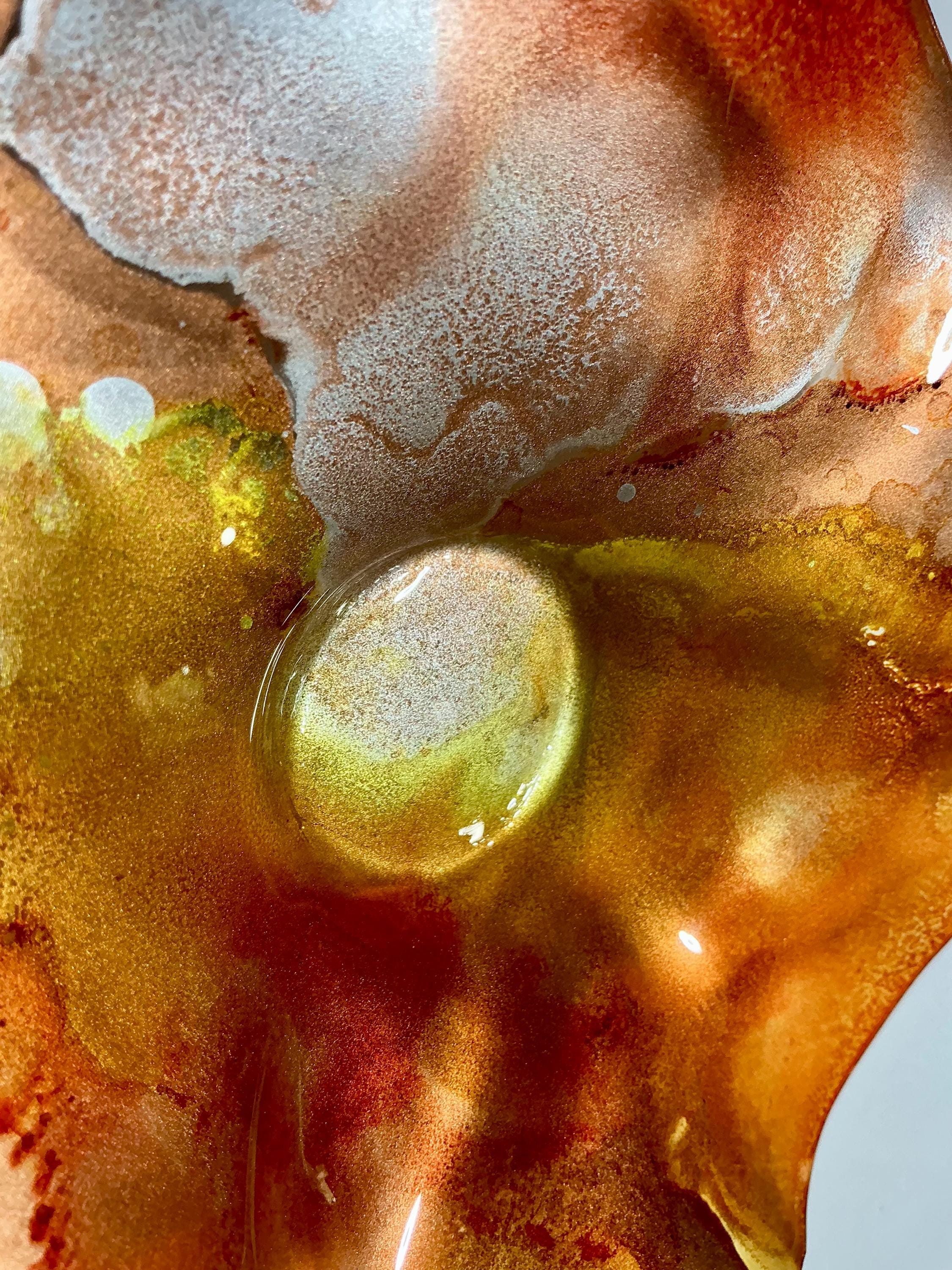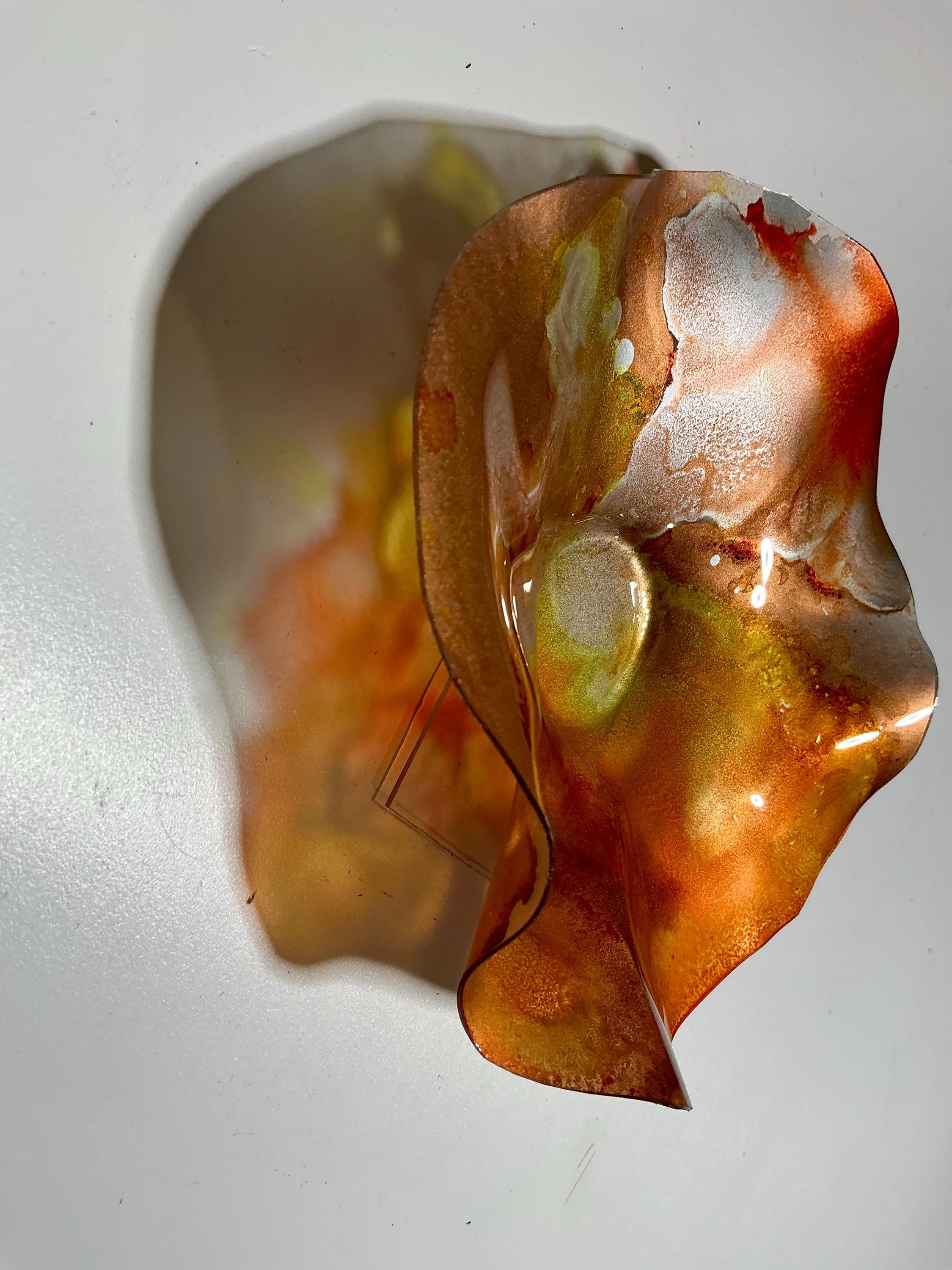 Each collectible piece is unique, no two are alike. This permanent, colorful, eye catching art looks and feels like glass. It shimmers in the light resembling water. They are very DURABLE AND LIGHTWEIGHT. These flowers are easy to hang ,are all weather and UV resistant. Great for indoor or outdoor decorating.