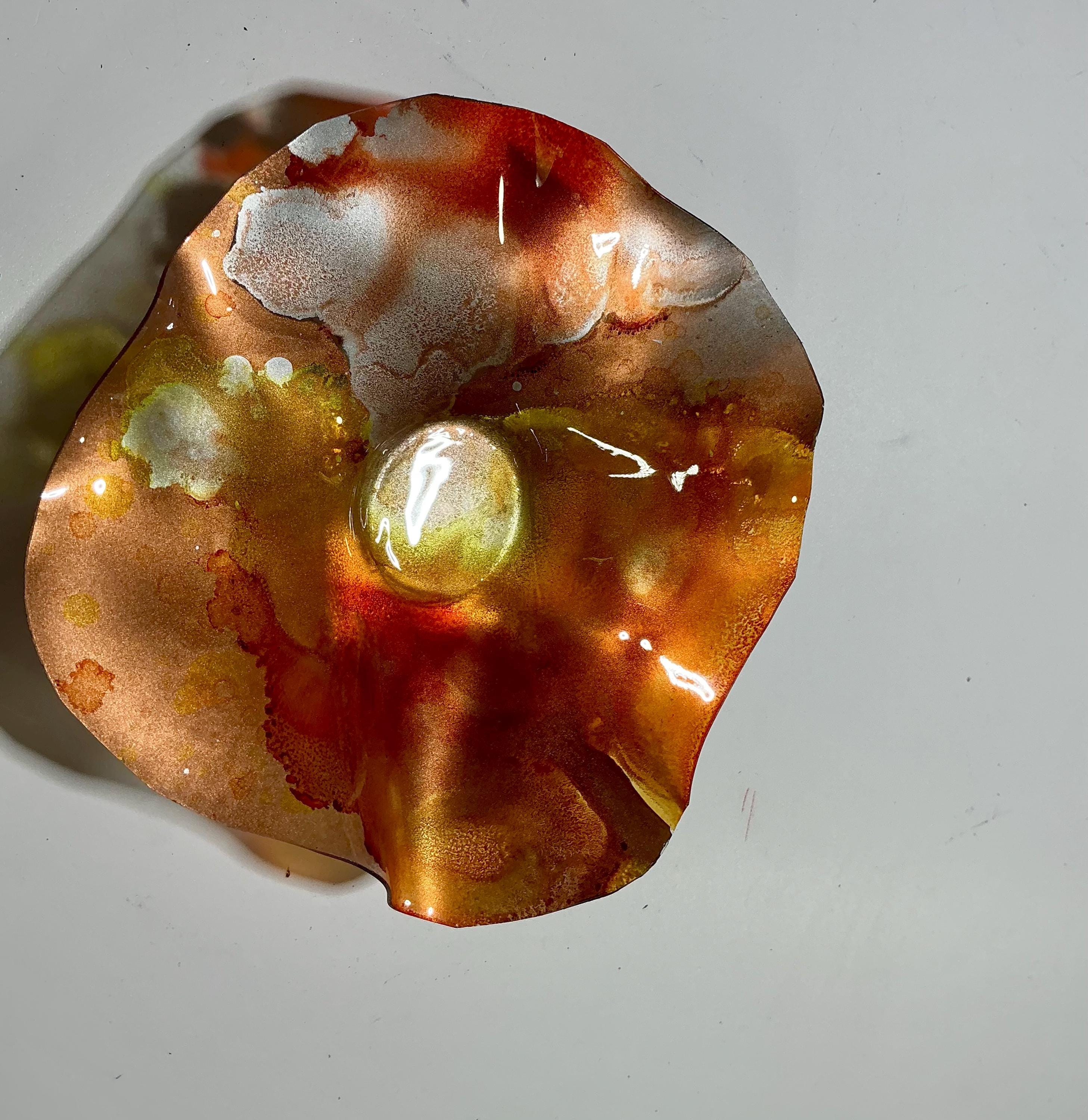 Brighten your space with our stunning Shades of Orange and Silver Wallflower! This 5-inch handmade piece is crafted from upcycled plastic, giving it a unique, eco-friendly twist. Its glass-like look adds an elegant touch to any decor style. Perfect for brightening walls, tables, or as a centerpiece, each flower is one-of-a-kind. Bring a pop of color and creativity to your home while promoting sustainable living. Elevate your decor today with this eye-catching design!