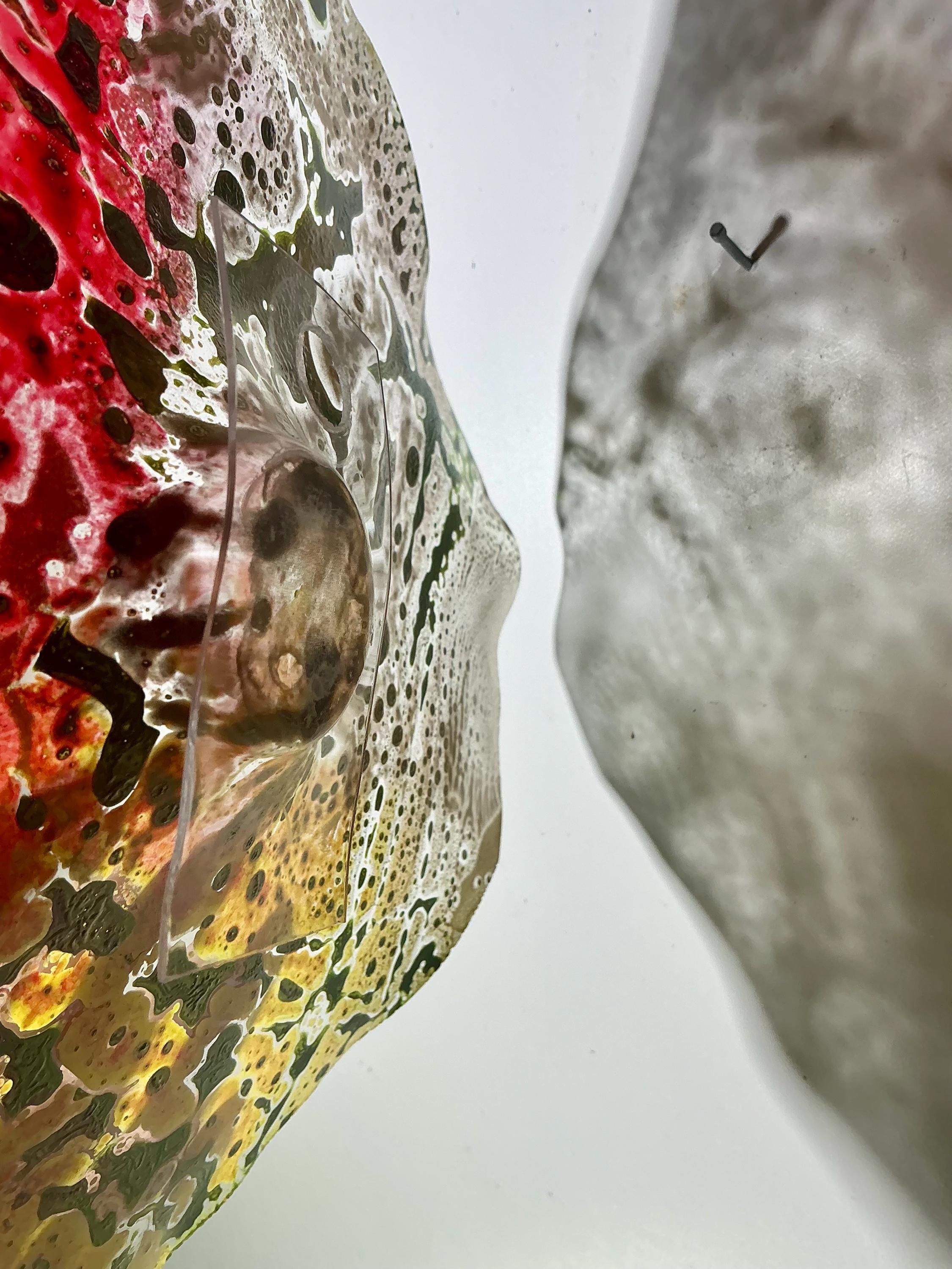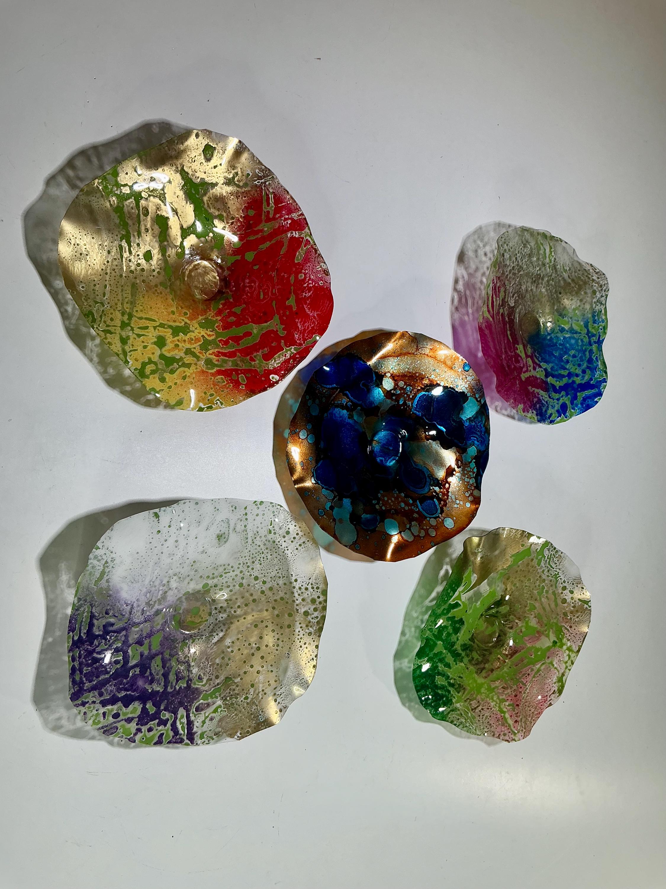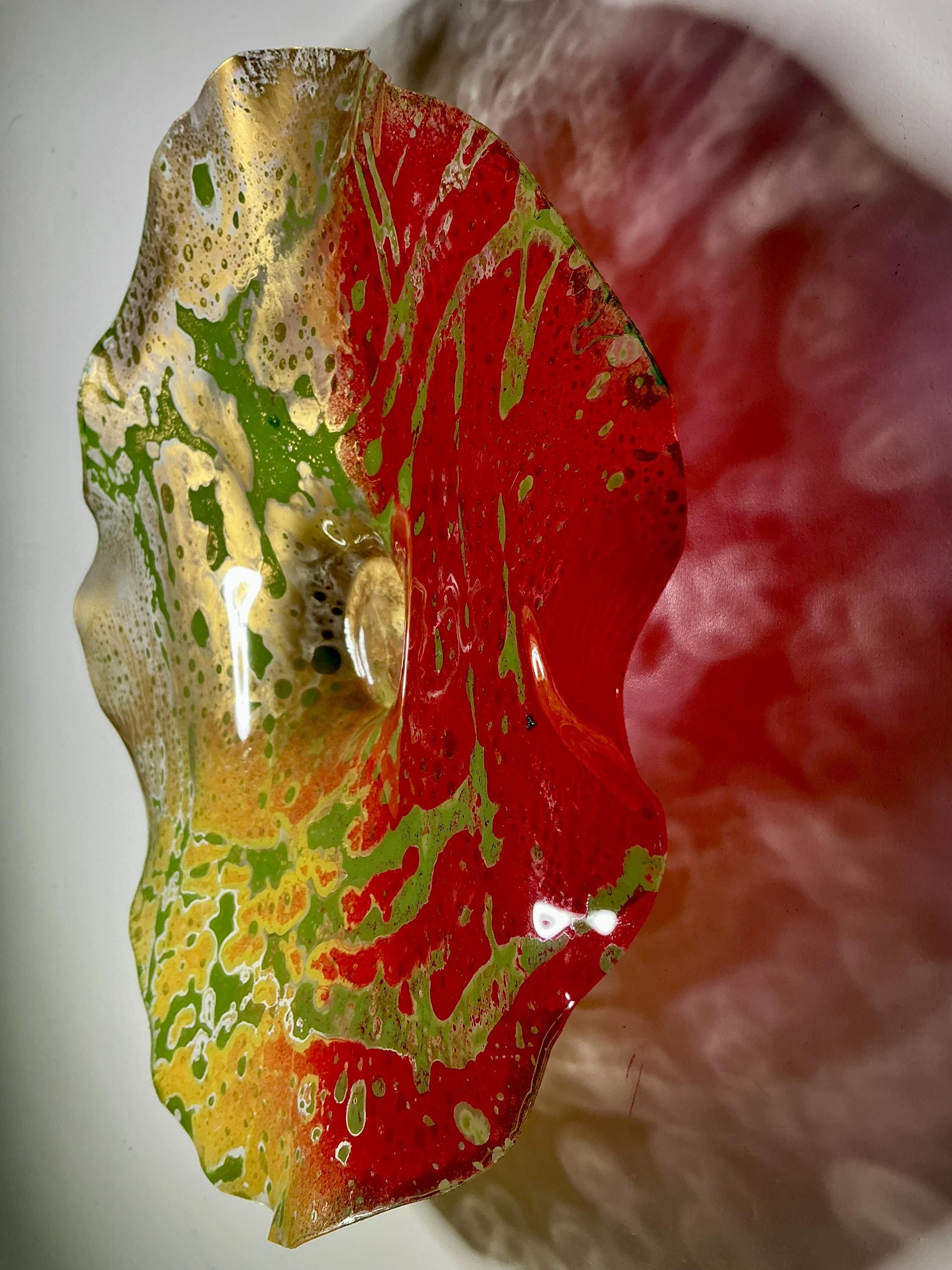 Each collectible piece is unique, no two are alike. This permanent, colorful, eye catching art looks and feels like glass. It shimmers in the light resembling water. They are very DURABLE AND LIGHTWEIGHT. This flower is easy to hang all weather and UV resistant. Great for indoor or outdoor decorating.