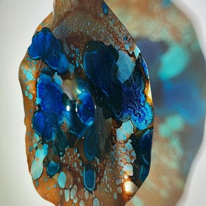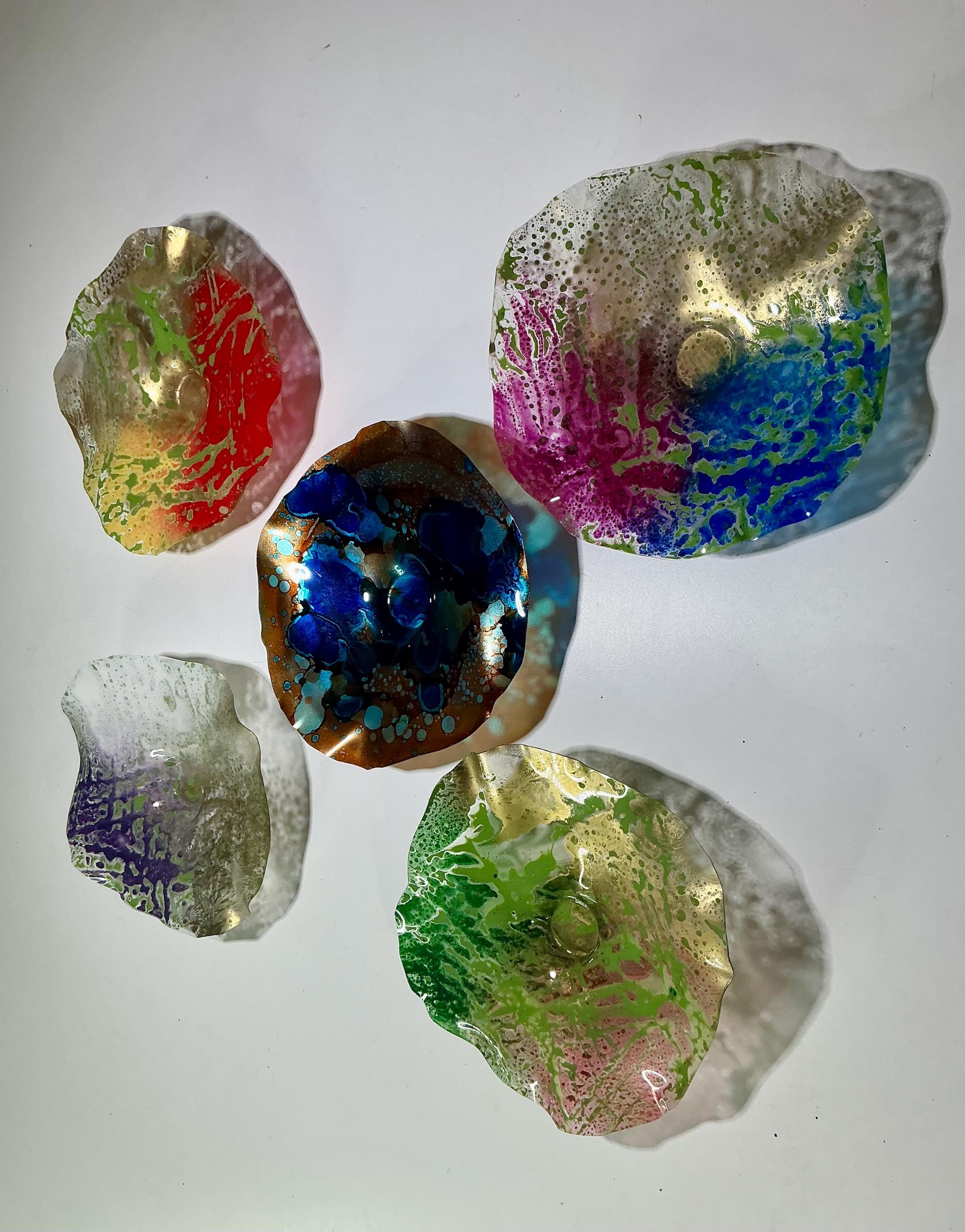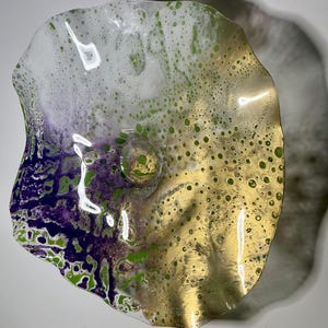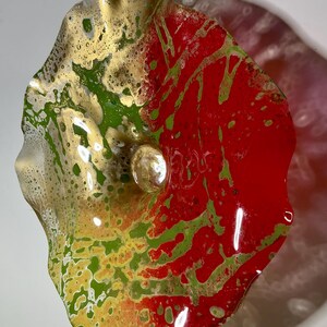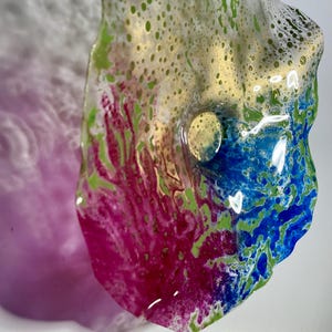Each collectible piece is unique, no two are alike. This permanent, colorful, eye catching art looks and feels like glass. It shimmers in the light resembling water. They are very DURABLE, AND LIGHTWEIGHT. These flowers are easy to hang, all weather and UV resistant. Great for indoor or outdoor decorating.