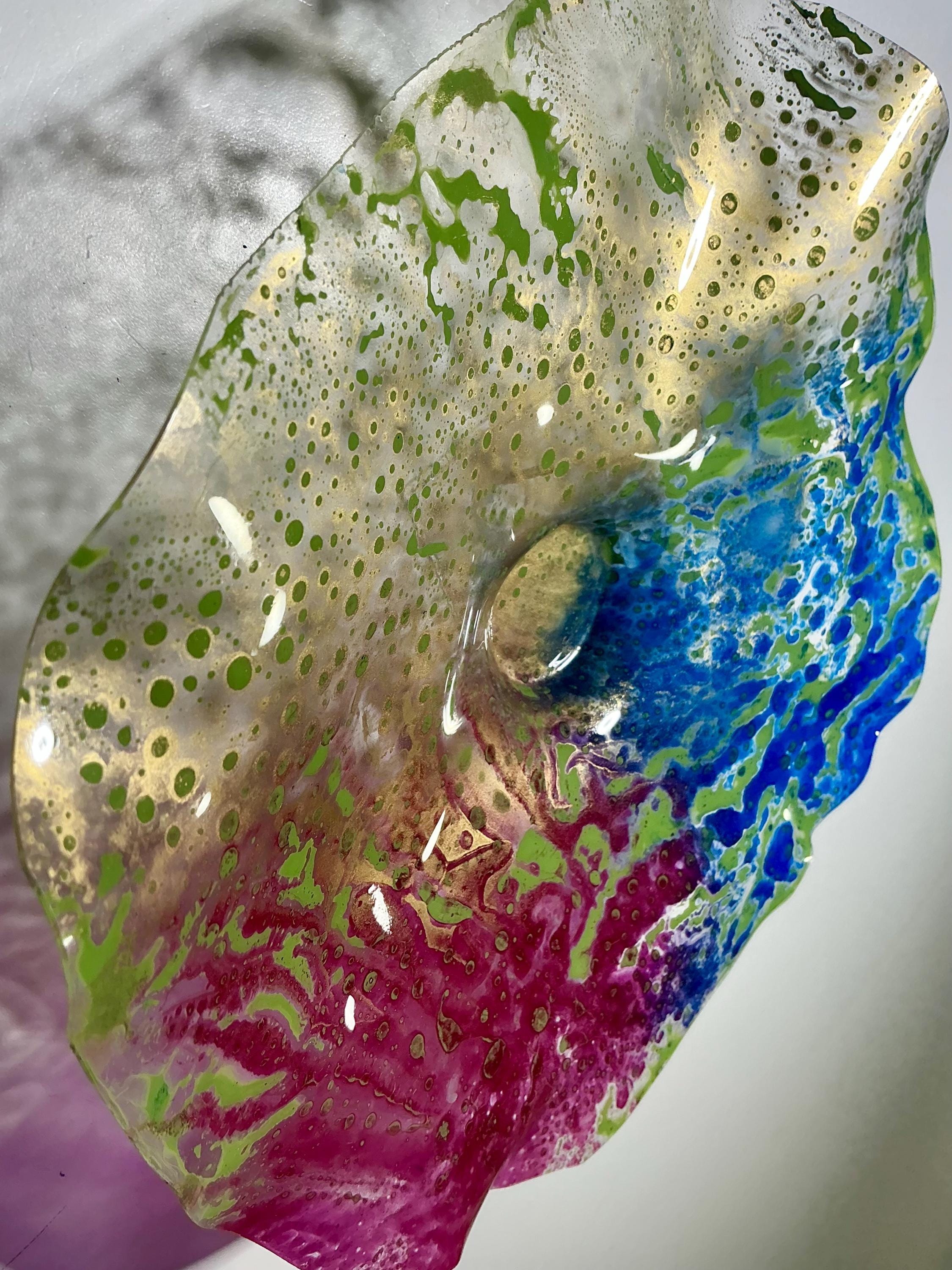 Each collectible piece is unique, no two are alike. This permanent, colorful, eye catching art looks and feels like glass. It shimmers in the light resembling water. They are very DURABLE AND LIGHTWEIGHT. This flower is easy to hang all weather and UV resistant. Great for indoor or outdoor decorating.