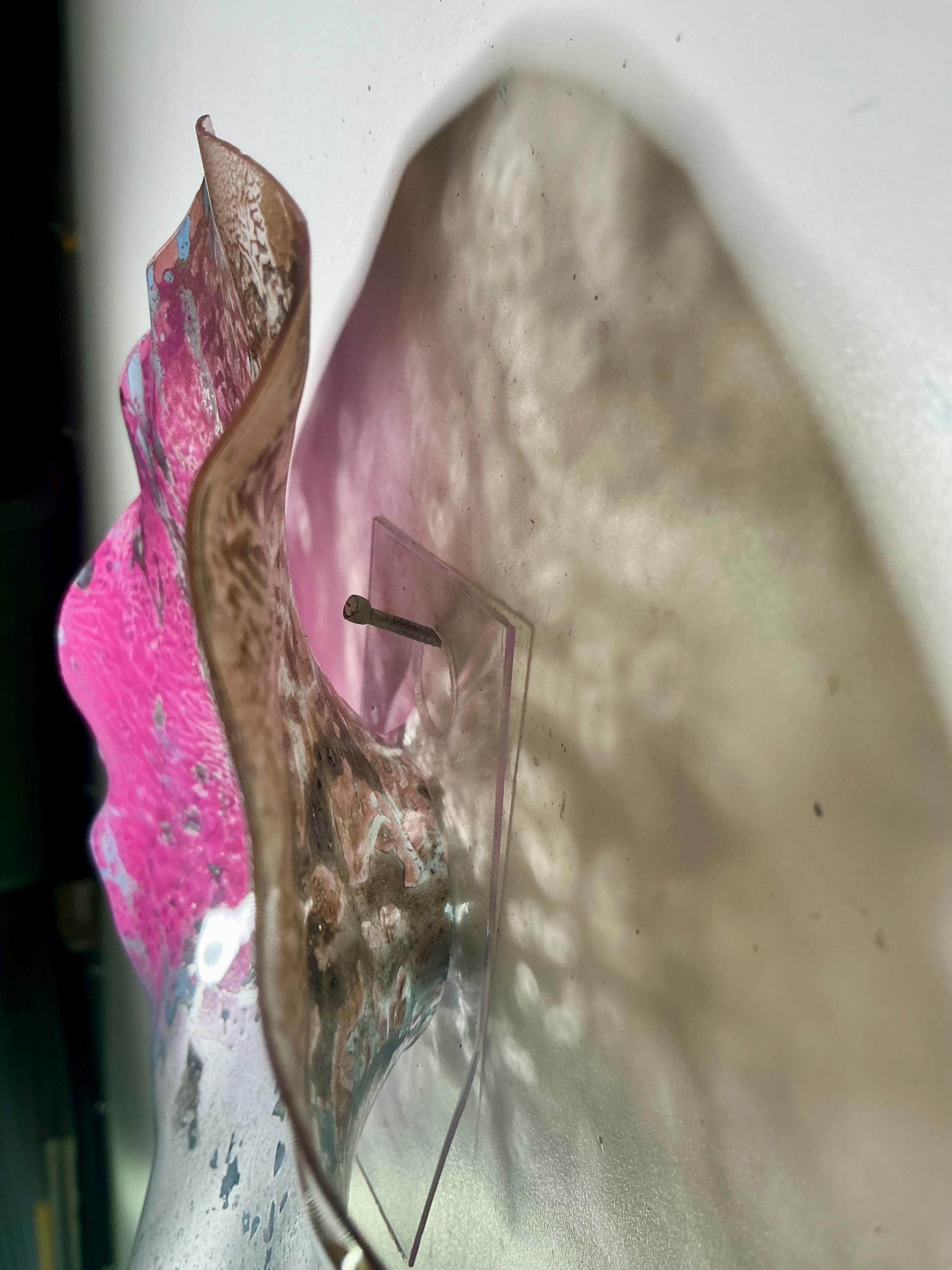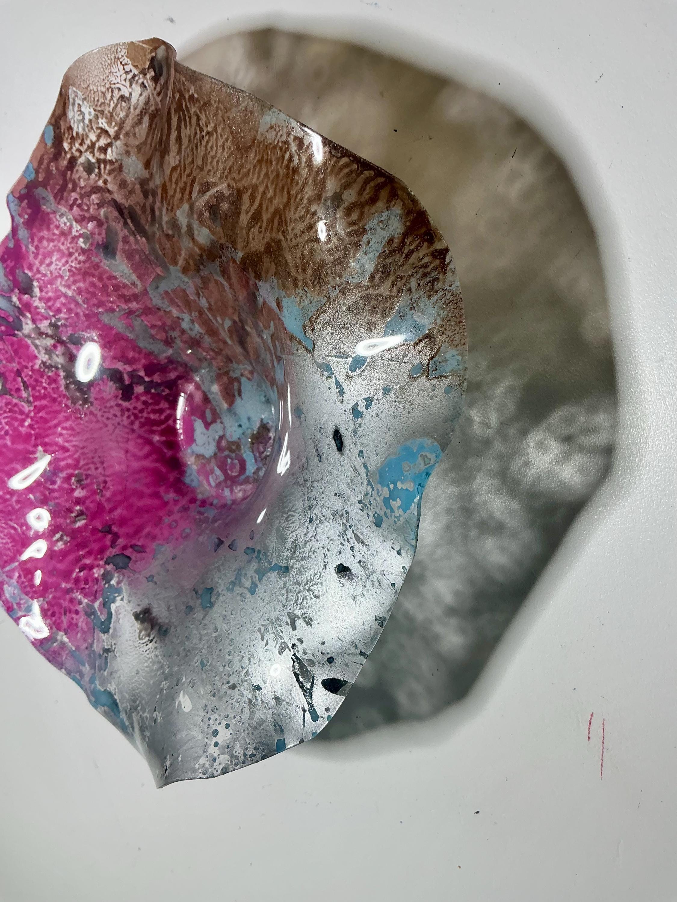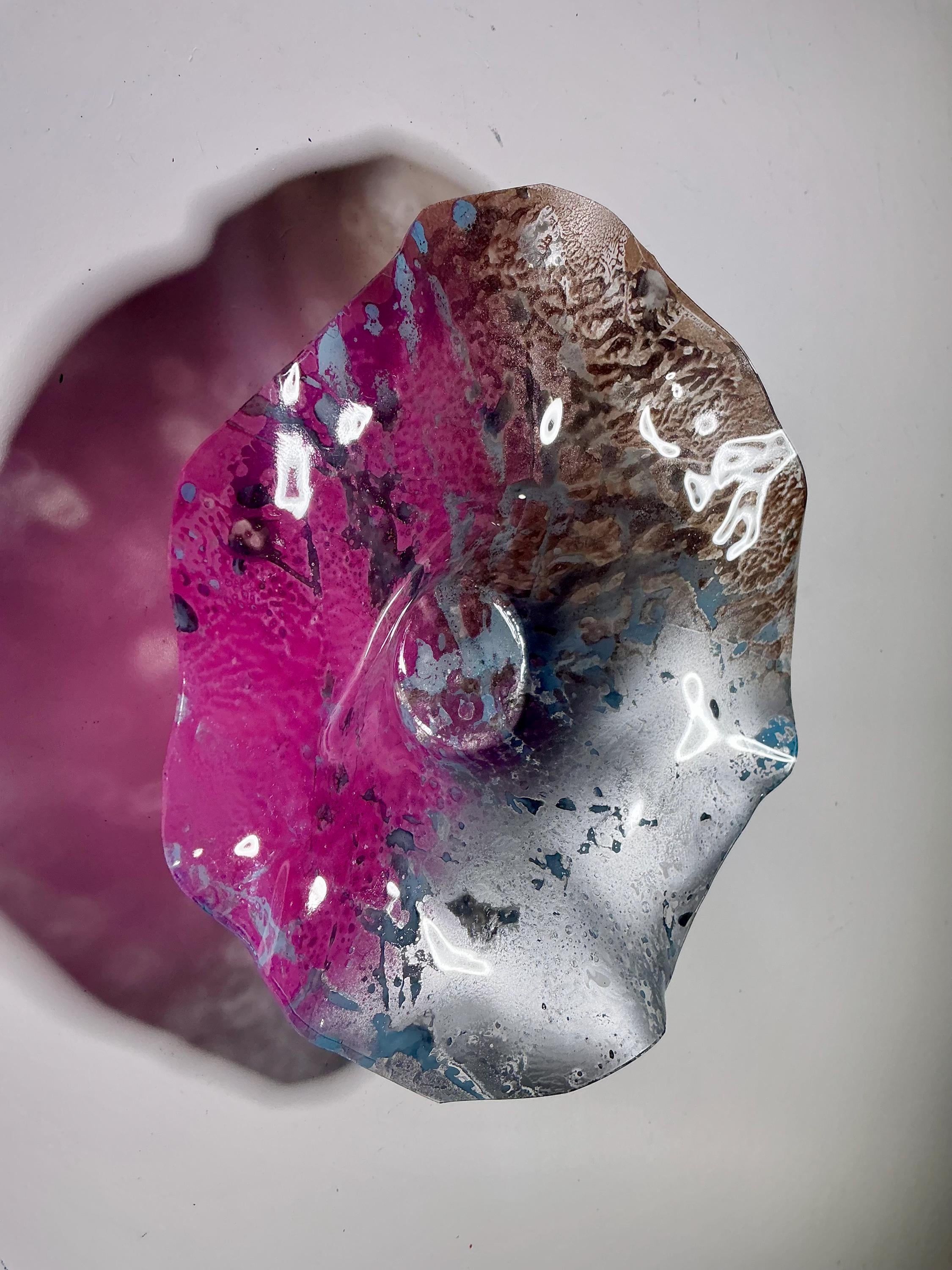 Discover this stunning extra small wallflower handcrafted by Todd Lynd, featuring a beautiful blend of pink, silver, and brown hues. Made from recycled plastic, this unique piece boasts a captivating glass-like finish that adds a touch of elegance to any space. Measuring 5 inches, it's perfect for creating a charming focal point in your home or gifting to a loved one. Bring sustainability and art together with this exquisite wallflower – a true treasure for eco-conscious decor enthusiasts!