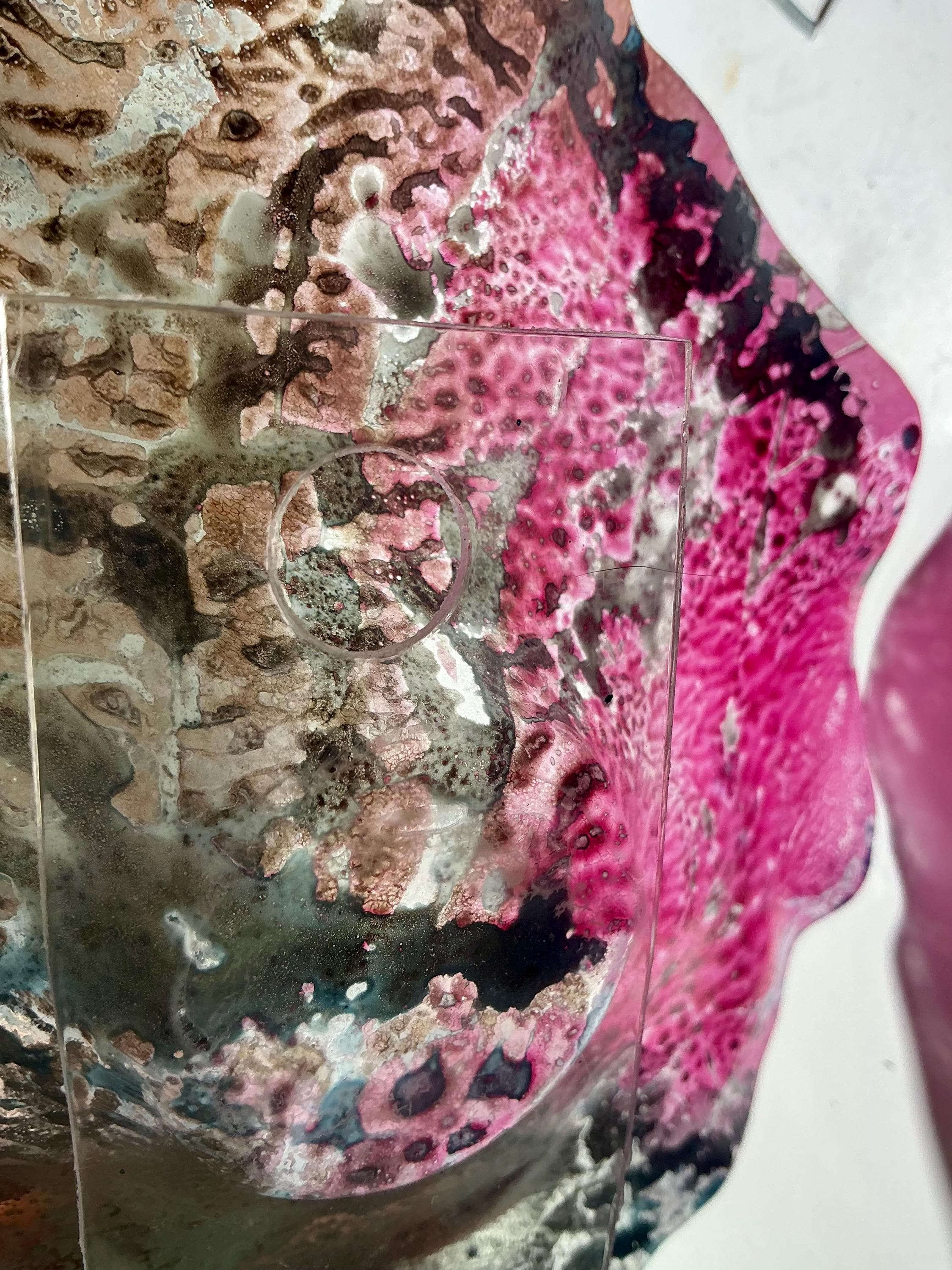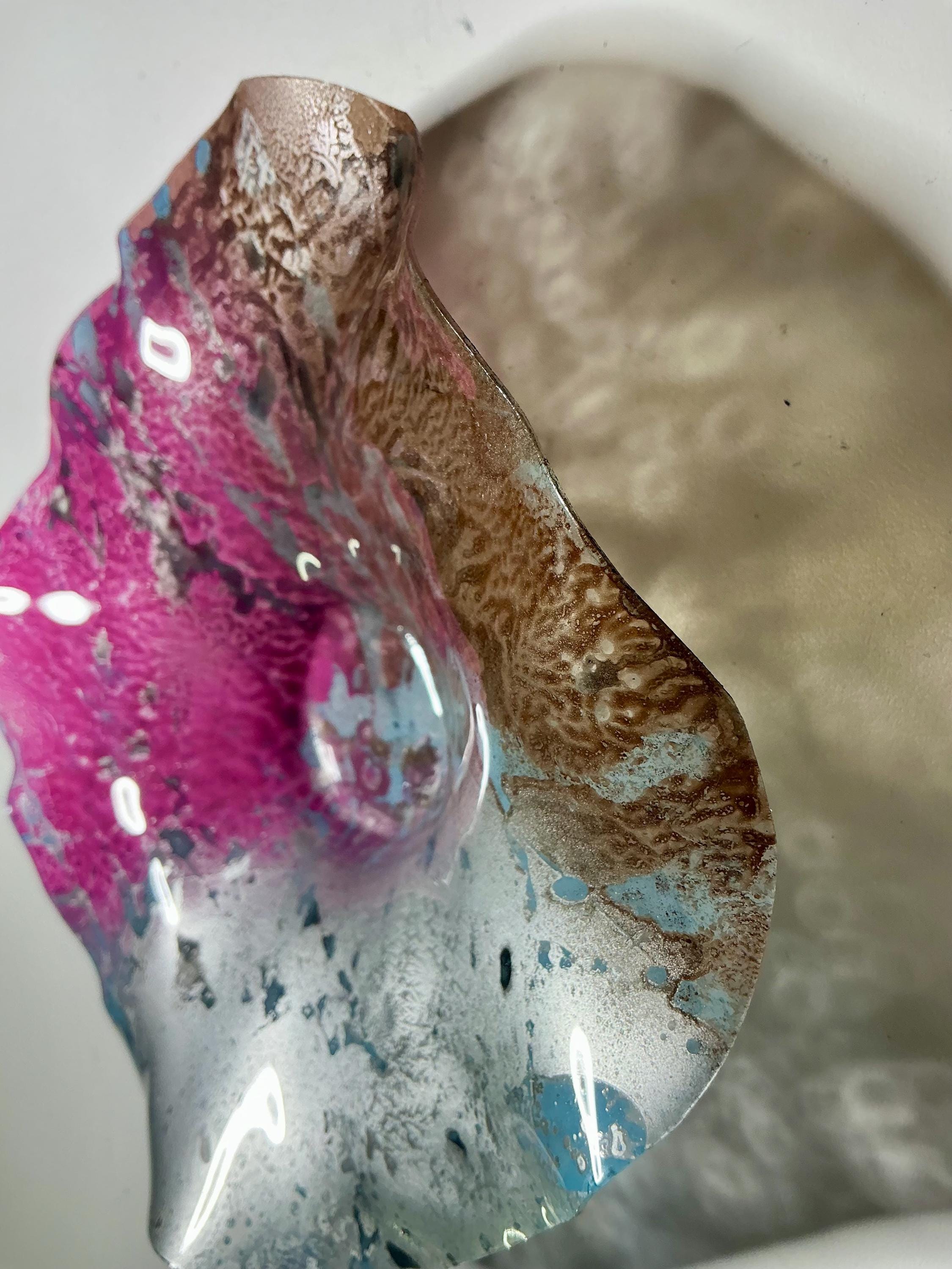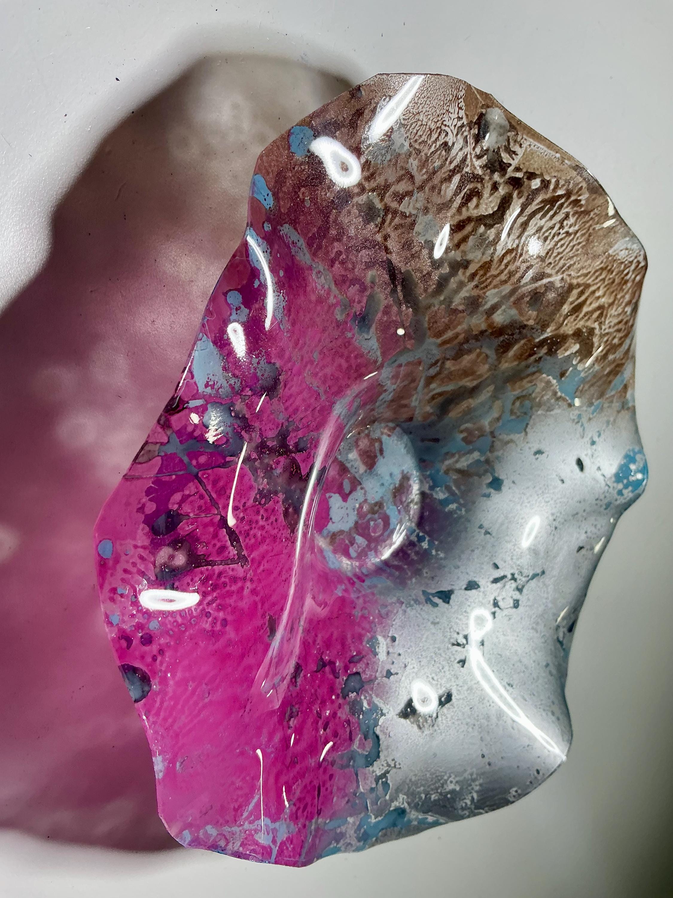 Discover this stunning extra small wallflower handcrafted by Todd Lynd, featuring a beautiful blend of pink, silver, and brown hues. Made from recycled plastic, this unique piece boasts a captivating glass-like finish that adds a touch of elegance to any space. Measuring 5 inches, it's perfect for creating a charming focal point in your home or gifting to a loved one. Bring sustainability and art together with this exquisite wallflower – a true treasure for eco-conscious decor enthusiasts!