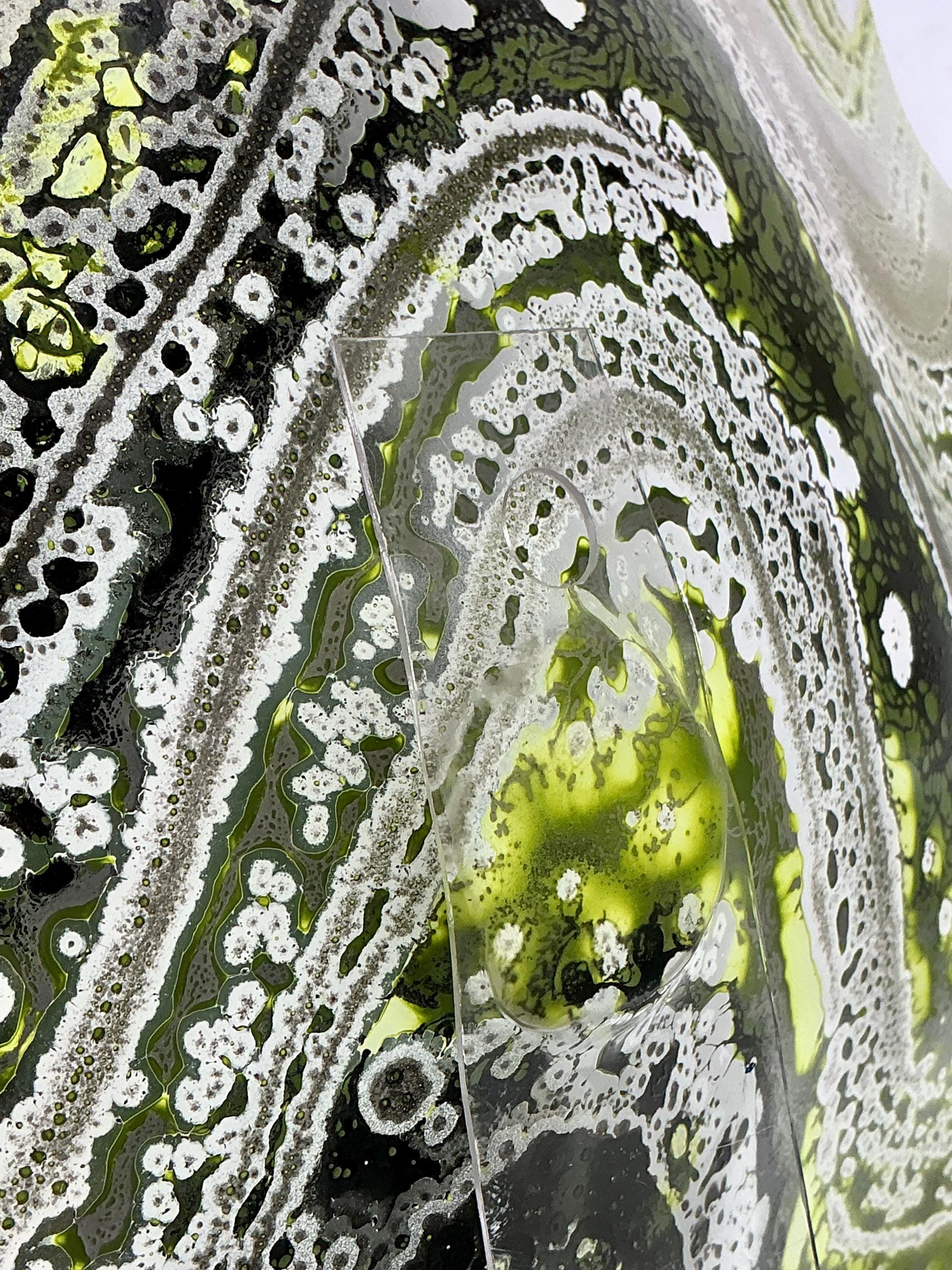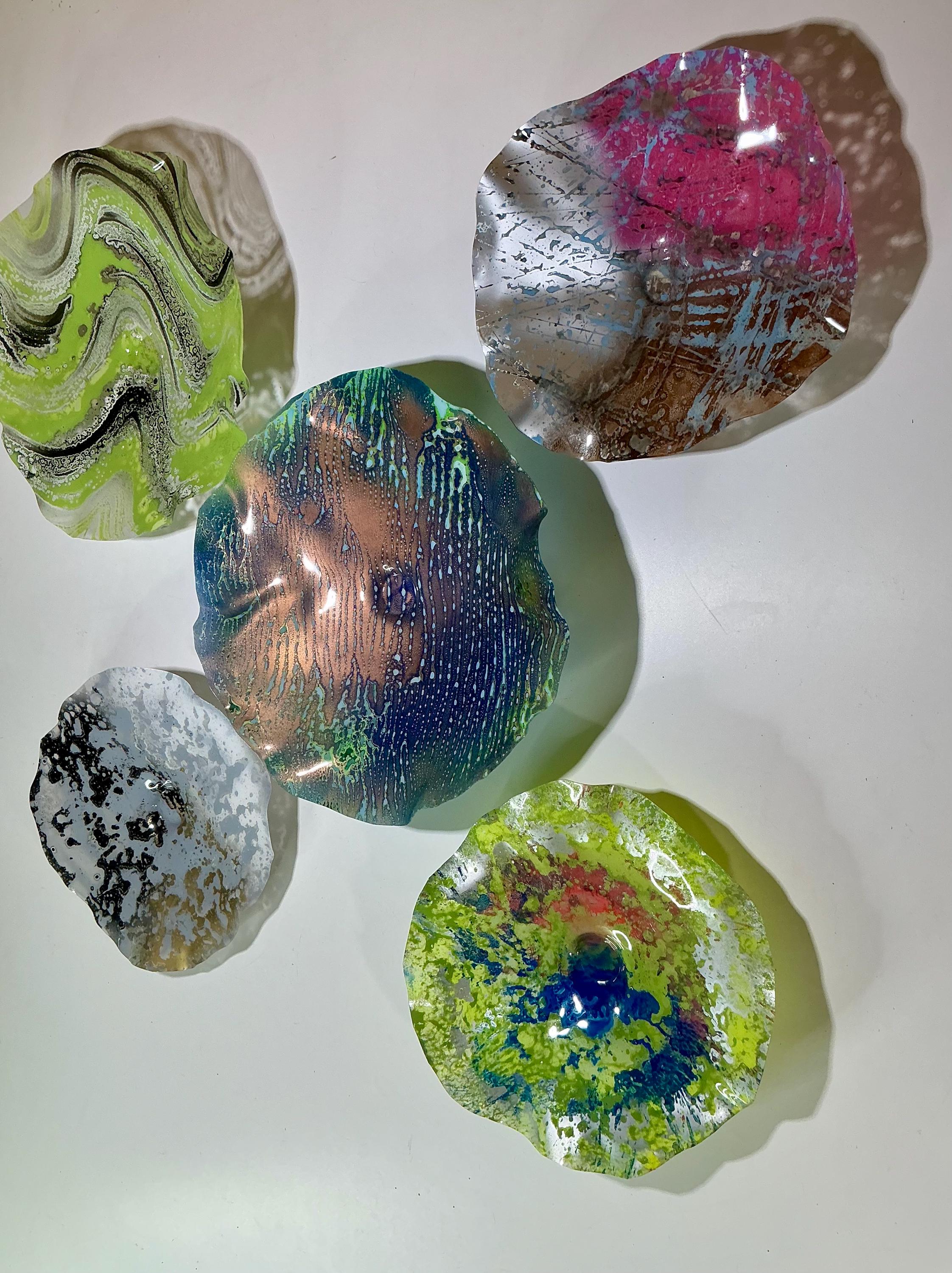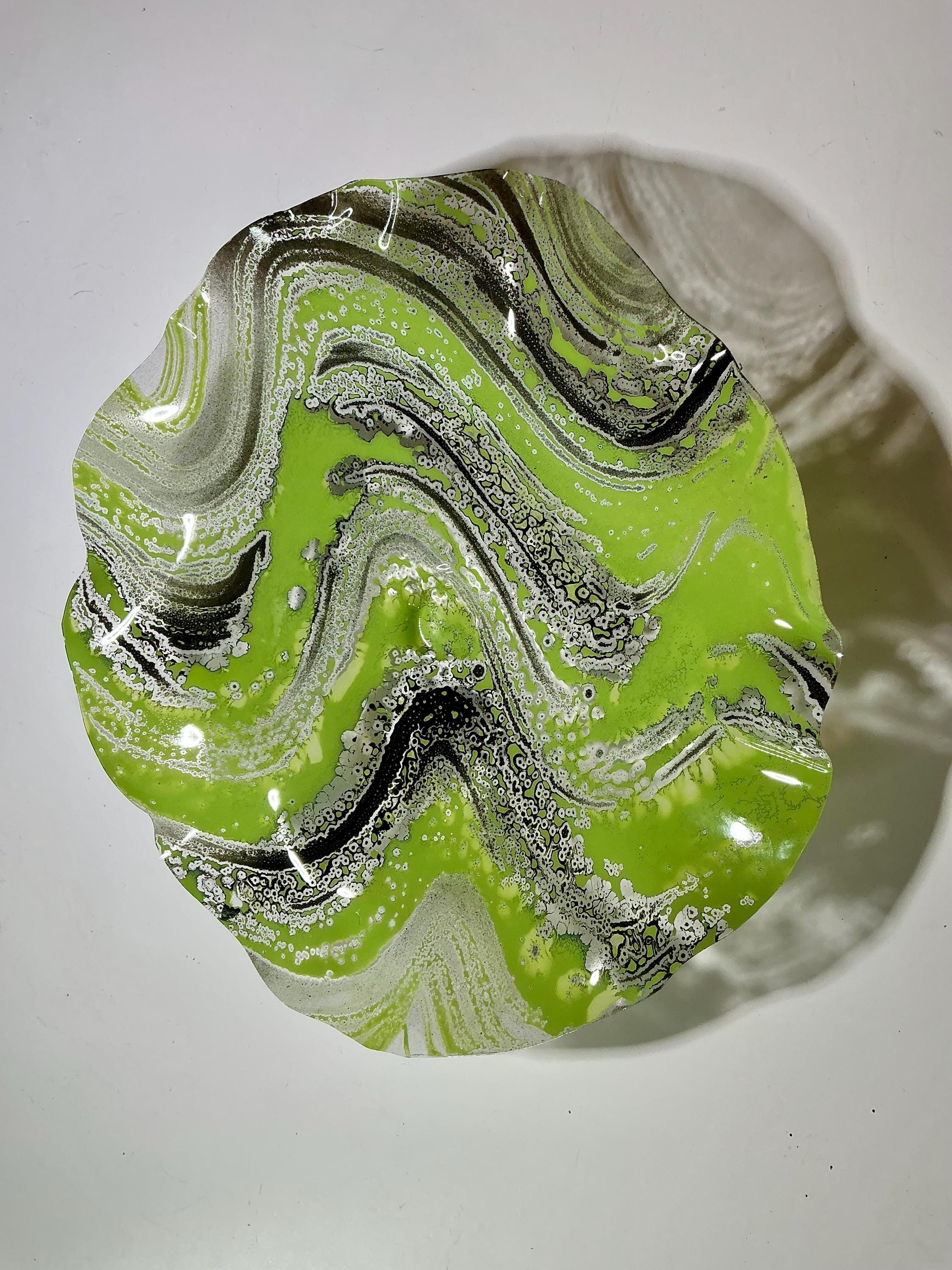 Each collectible piece is unique, no two are alike. This permanent, colorful, eye catching art looks like glass. It shimmers in the light resembling water. They are very DURABLE AND LIGHTWEIGHT. Great for indoor or outdoor decorating.
