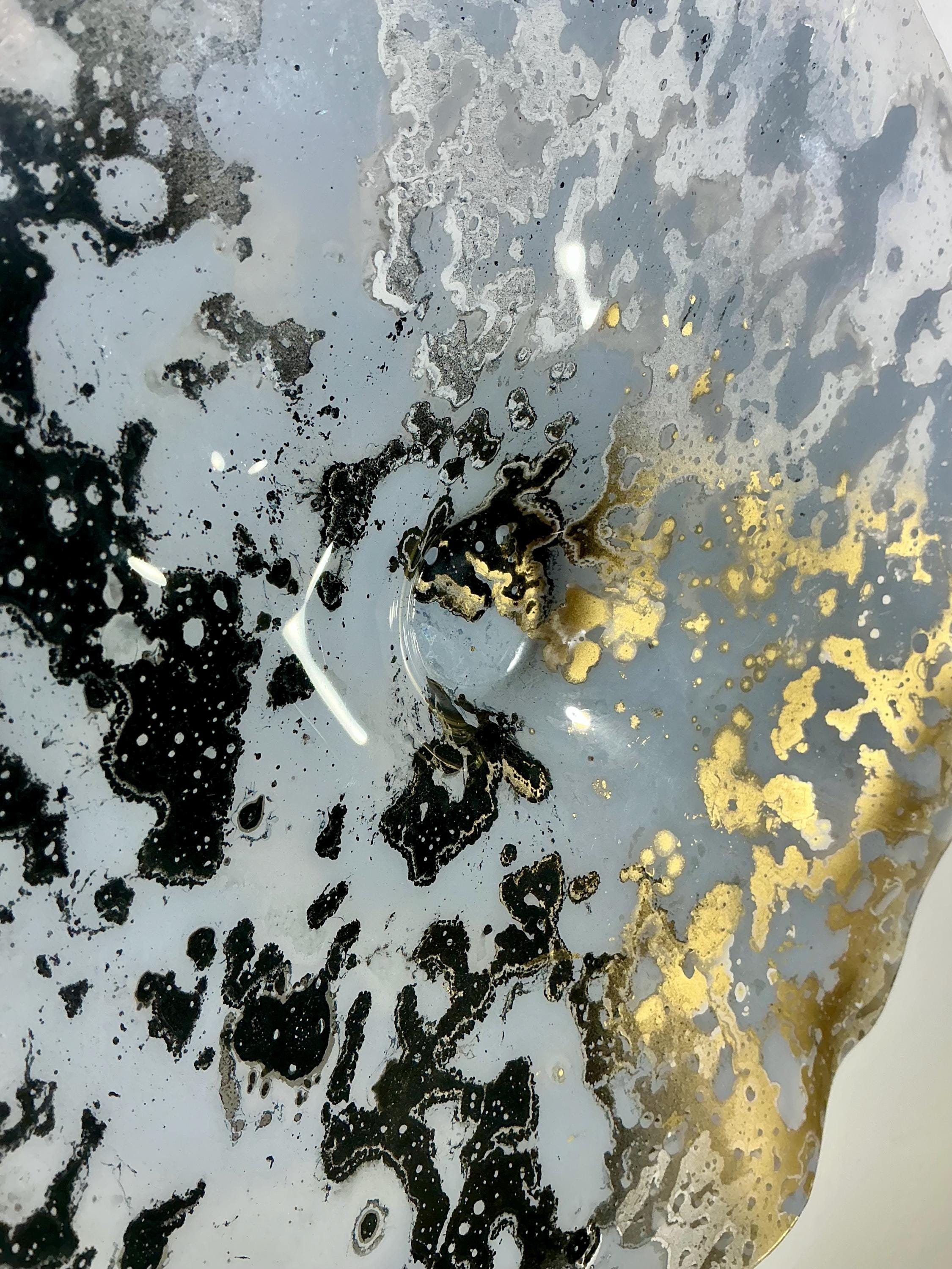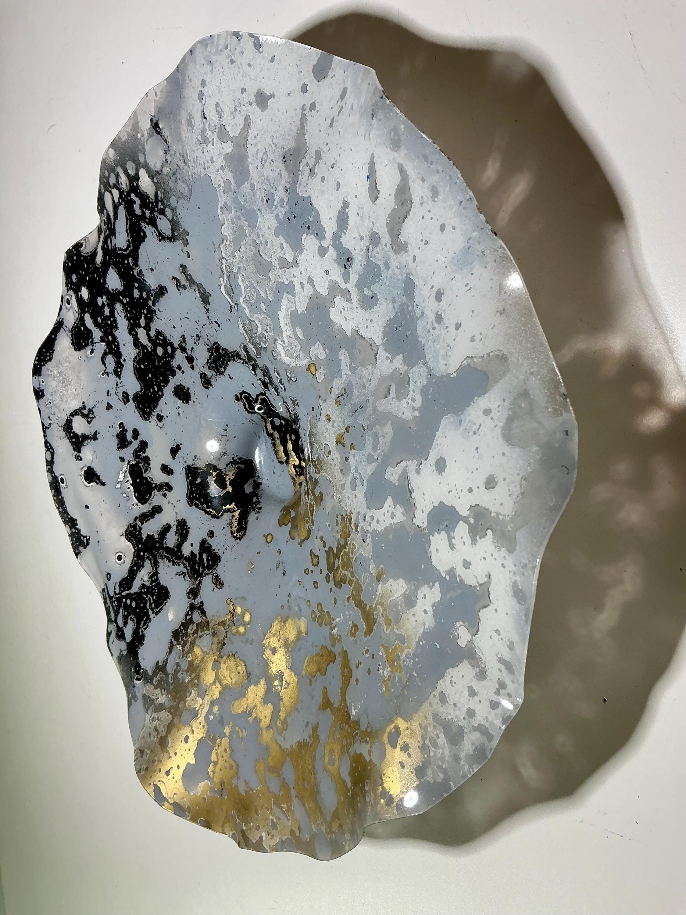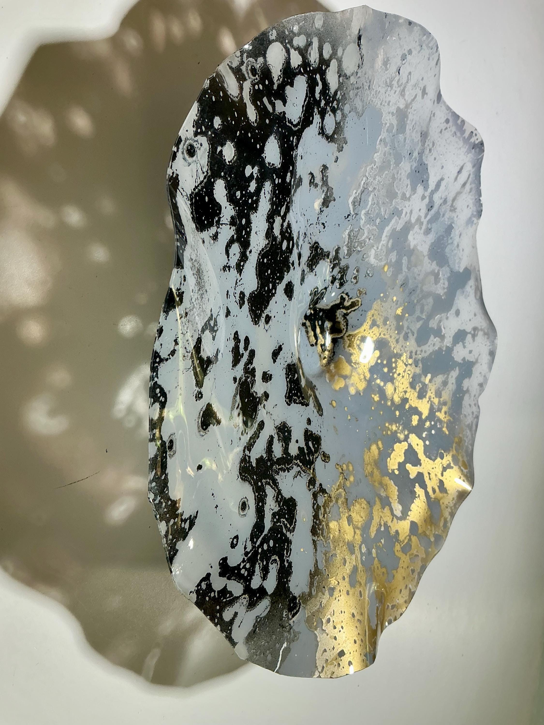 Elevate your home decor with our stunning 12” wall art, handcrafted from upcycled plastic. This original piece features a striking black, white, and gold design that beautifully mimics the elegance of glass. Perfect for adding a touch of sophistication to any room, this unique art will make a bold statement on your walls. Environmentally friendly and artistically inspired, it’s ideal for modern and chic interiors. Transform your space with this one-of-a-kind treasure today!