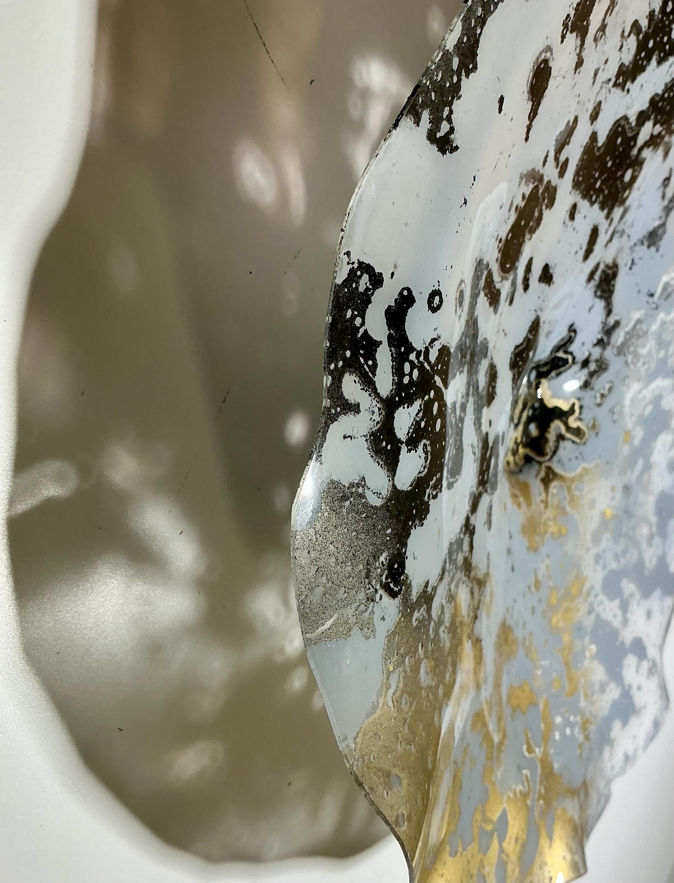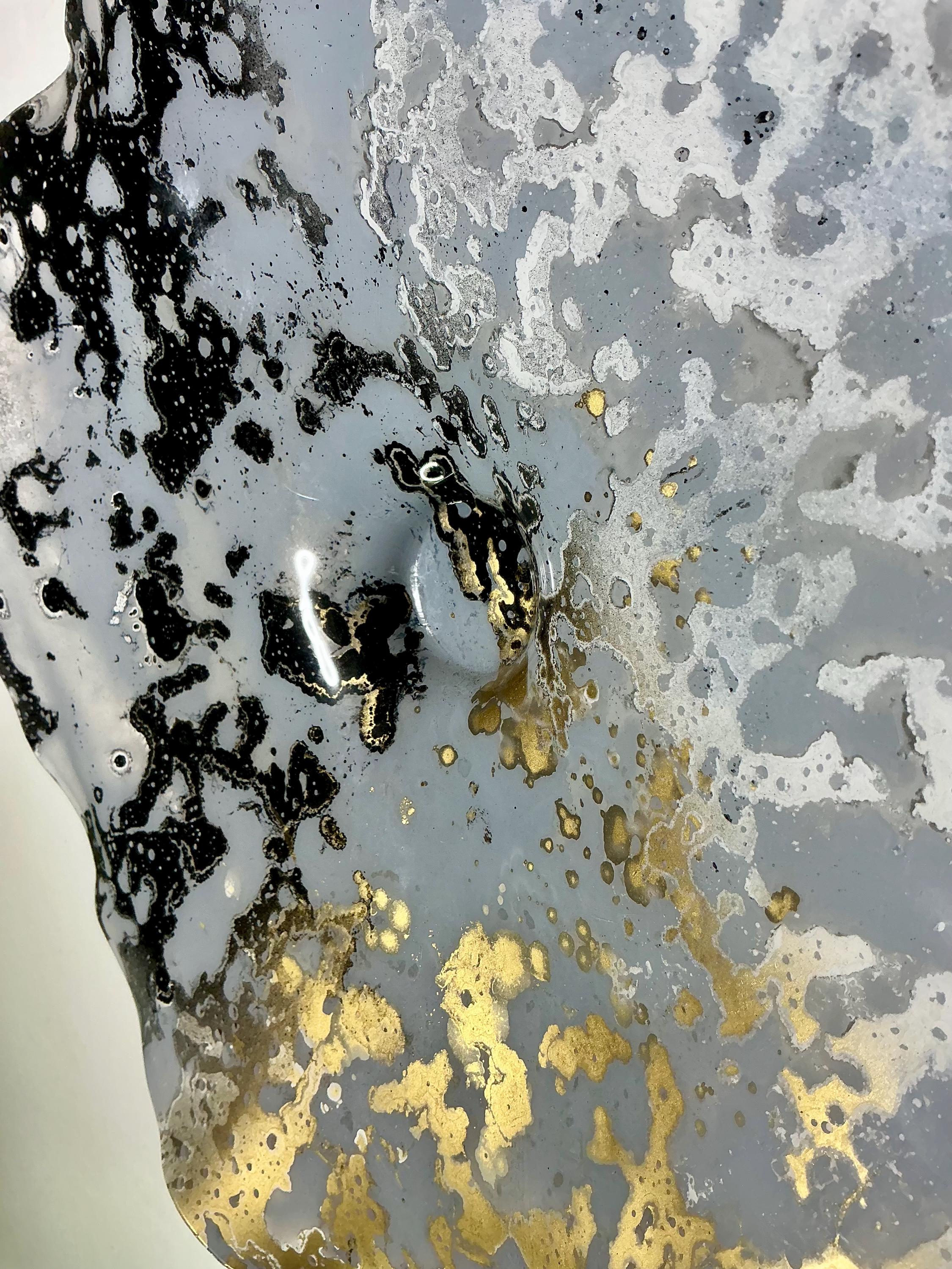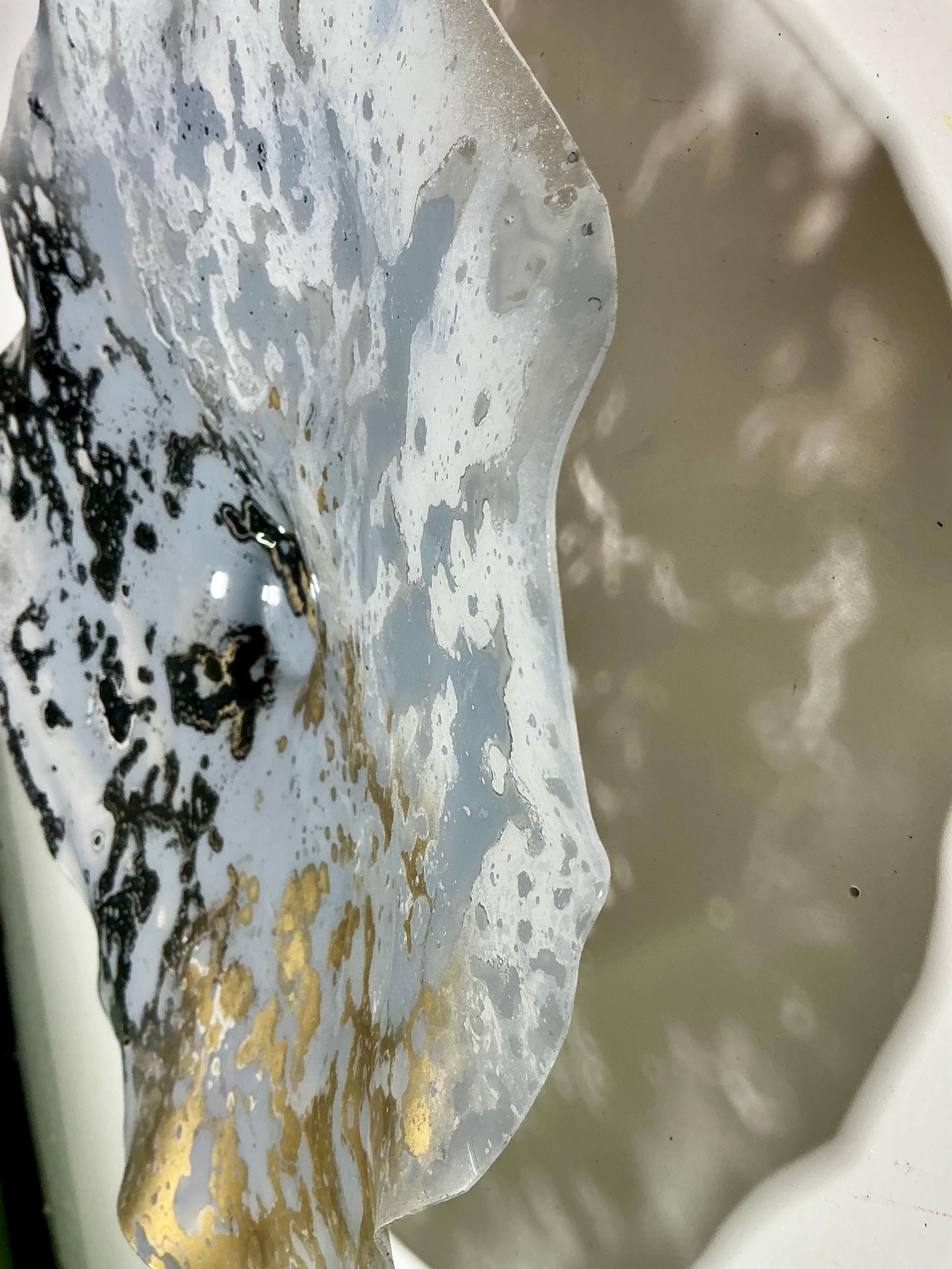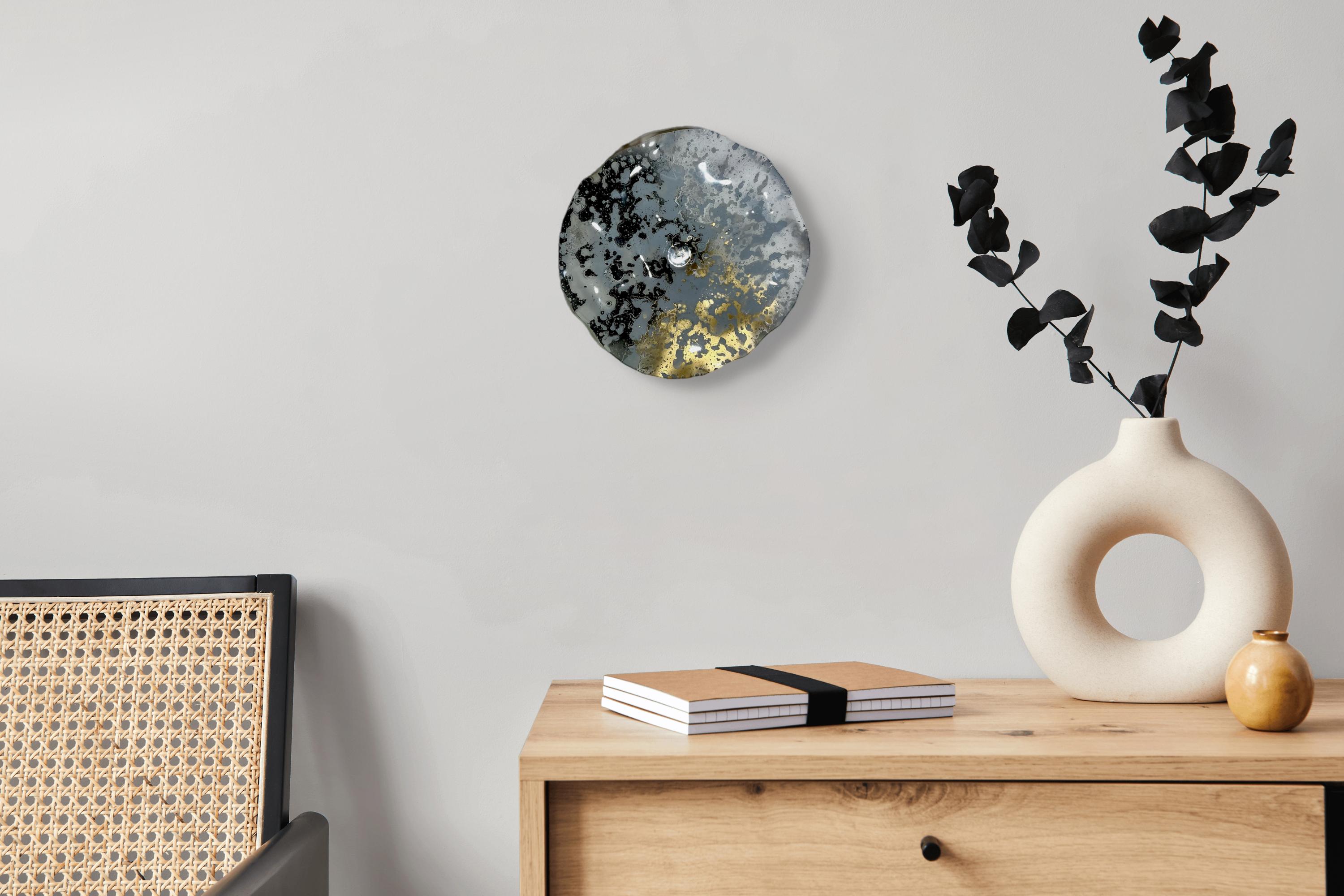 Elevate your home decor with our stunning 12” wall art, handcrafted from upcycled plastic. This original piece features a striking black, white, and gold design that beautifully mimics the elegance of glass. Perfect for adding a touch of sophistication to any room, this unique art will make a bold statement on your walls. Environmentally friendly and artistically inspired, it’s ideal for modern and chic interiors. Transform your space with this one-of-a-kind treasure today!