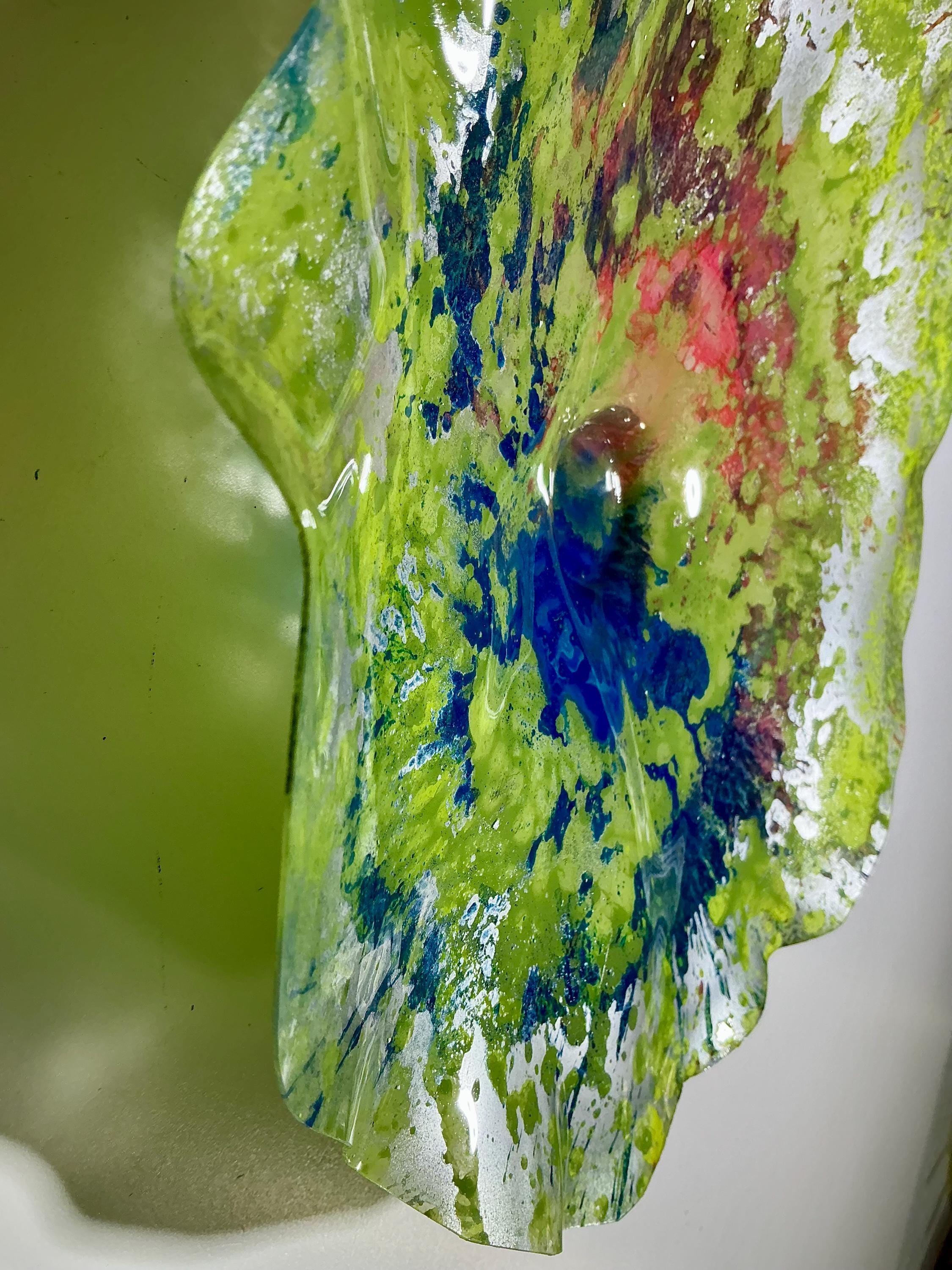 Each collectible piece is unique, no two are alike. This permanent, colorful, eye catching art looks and feels like glass. It shimmers in the light resembling water. They are very DURABLE, AND LIGHTWEIGHT. These flowers are easy to hang, all weather and UV resistant. Great for indoor or outdoor decorating.