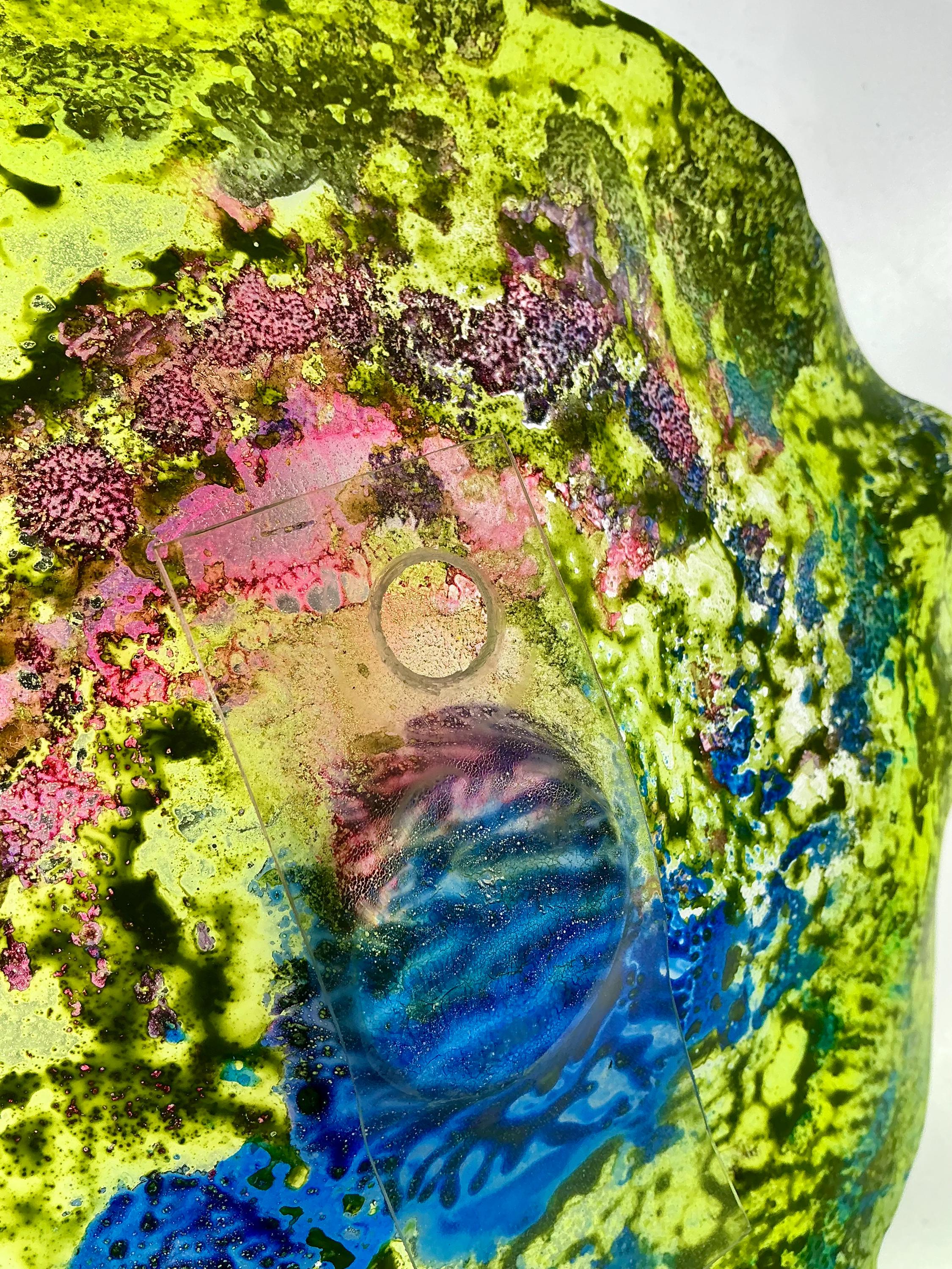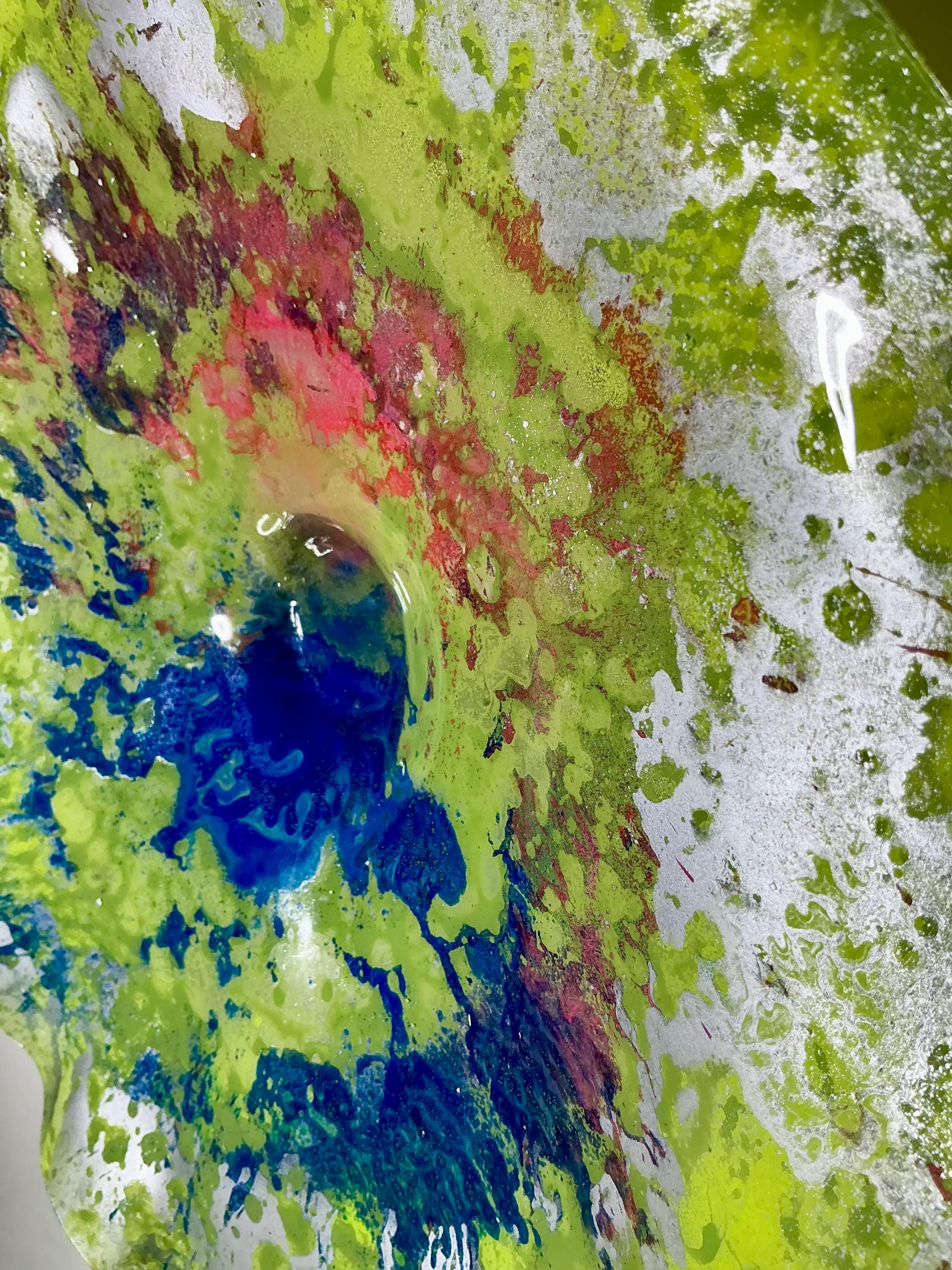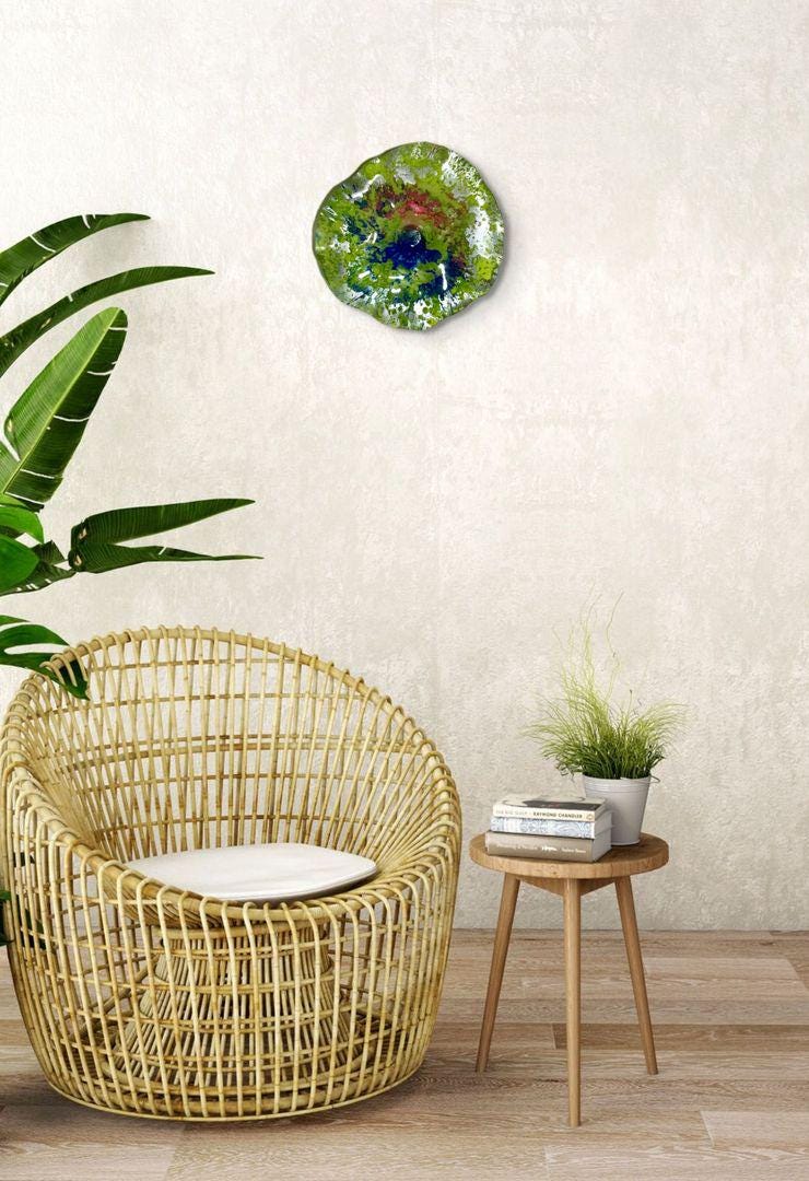 Artisan 12” Wall Flower in Vibrant Green, Blue, Silver & Pink - Handmade Decor from Recycled Plastic -looks like glass