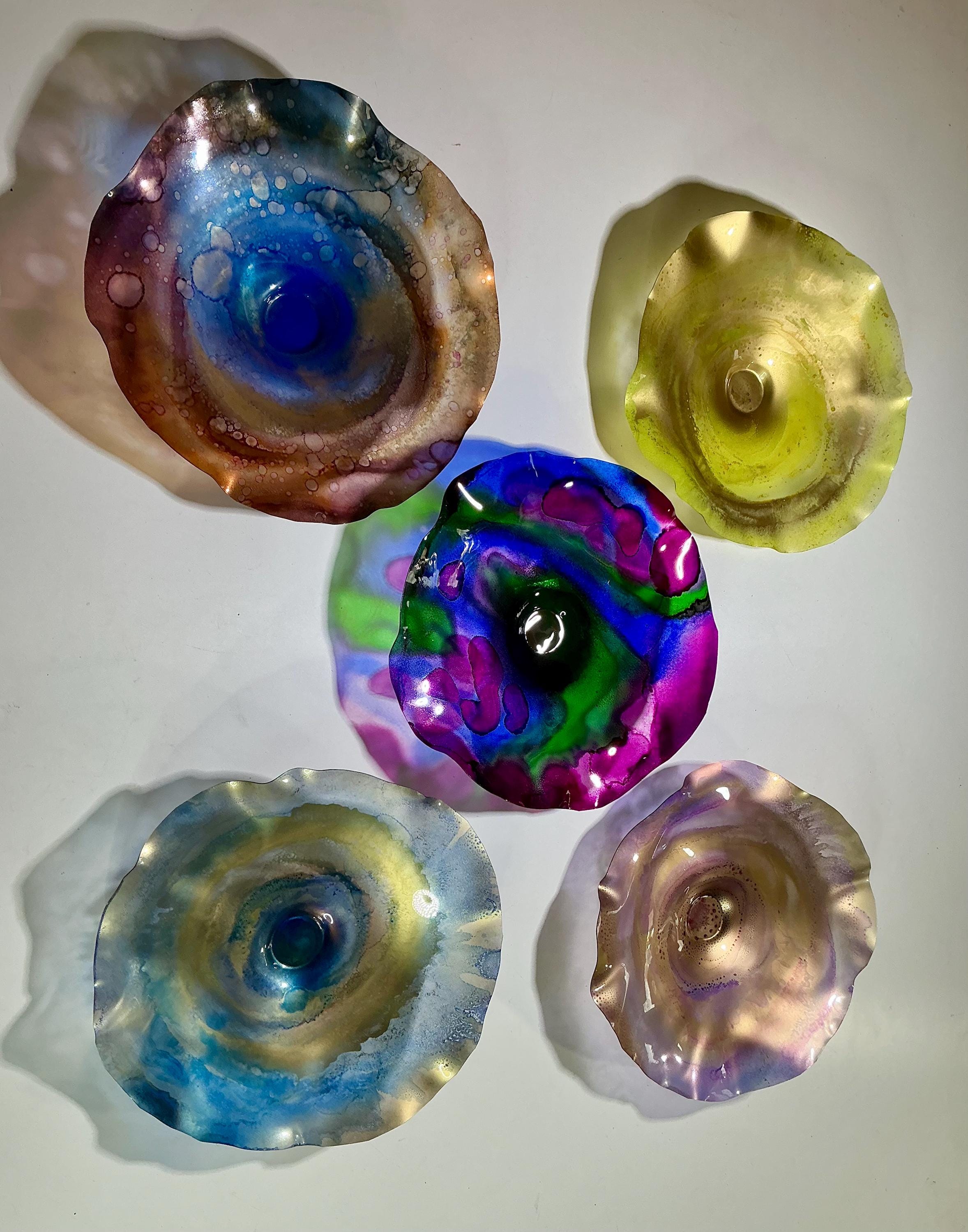 Each collectible piece is unique, no two are alike. This permanent, colorful, eye catching art looks and feels like glass. It shimmers in the light resembling water. They are very DURABLE AND LIGHTWEIGHT. This flower is easy to hang all weather and UV resistant. Great for indoor or outdoor decorating.