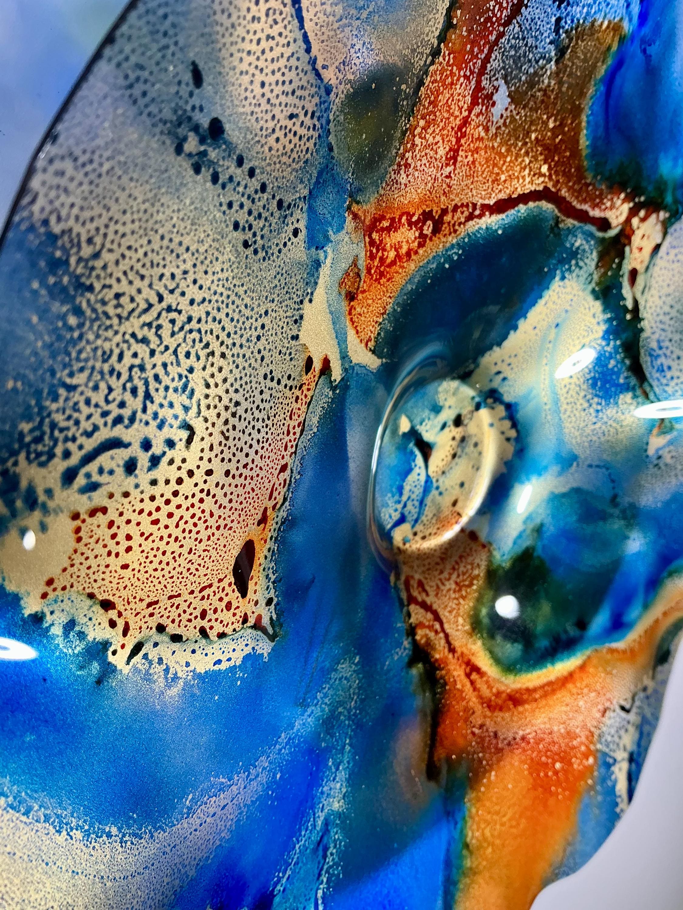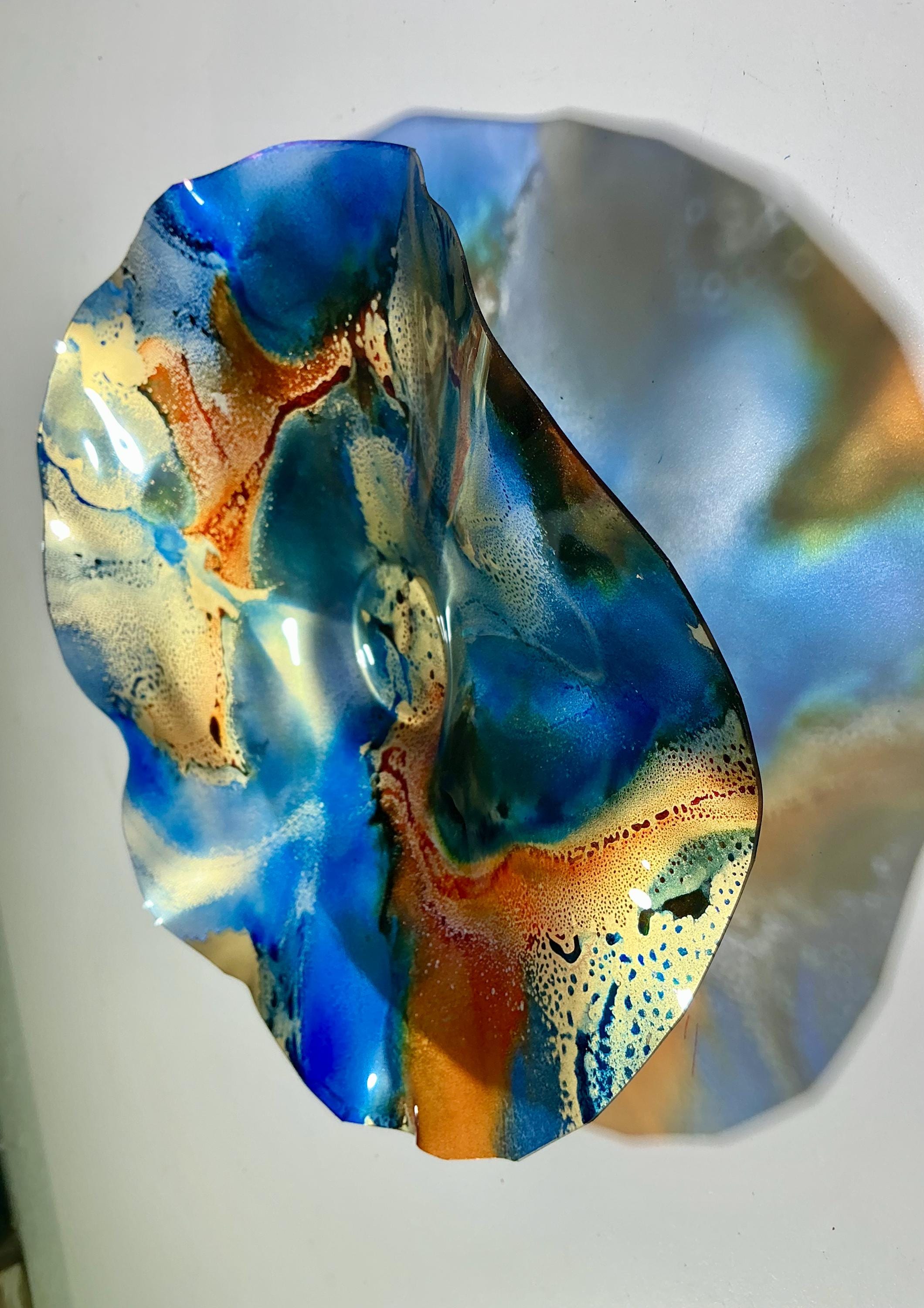 Beautiful Handcrafted 8” Wall Flower - Orange, Blue & Gold Eco-Friendly Art-upcycled plastic- glass like look