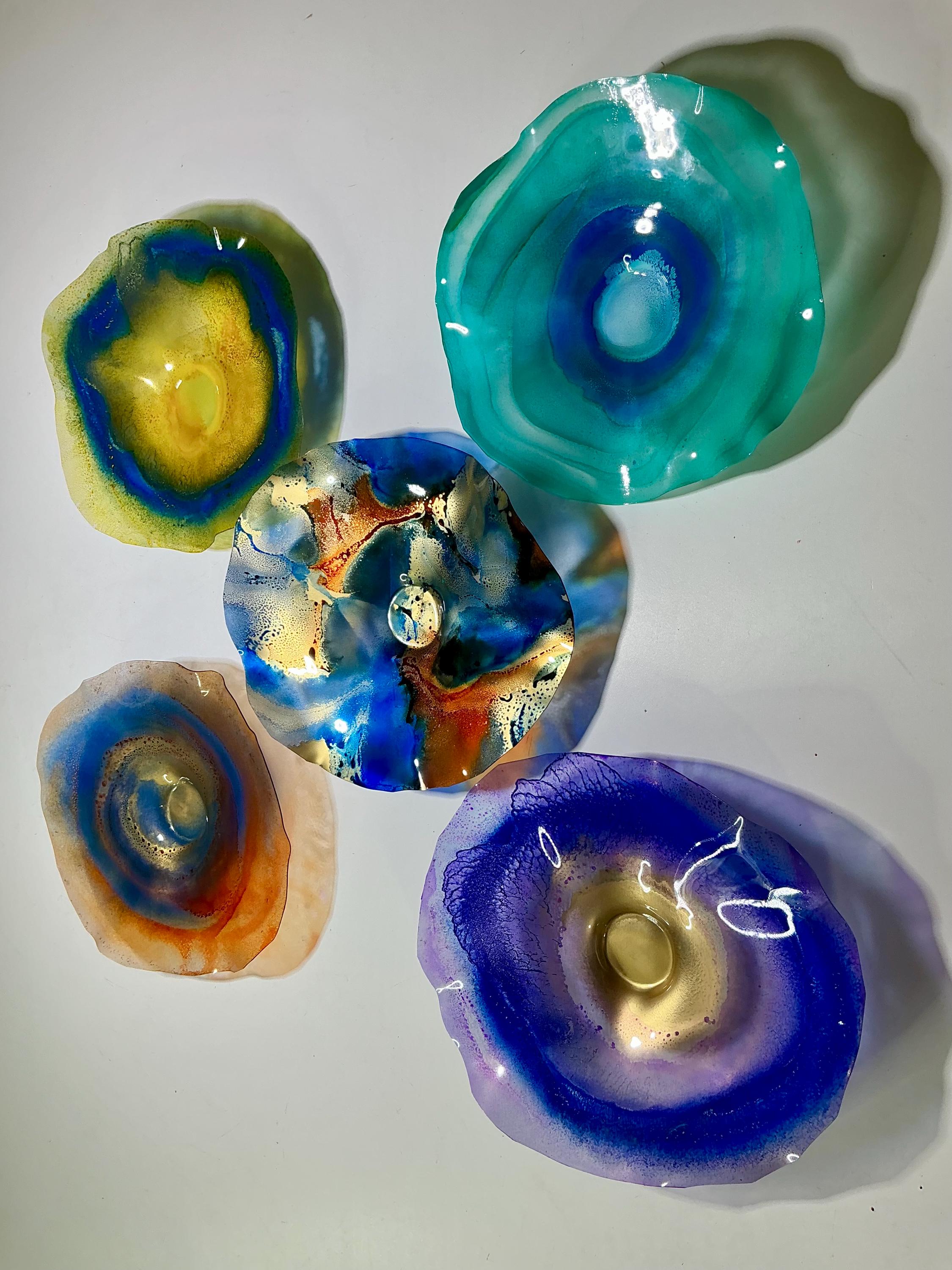 From the wall, they look like glass. The bonuses are that these flowers are light, unbreakable, environmentally friendly, easy to hang, and have no damage to the wall due to drilling for would-be-heavy traditional glass flowers.