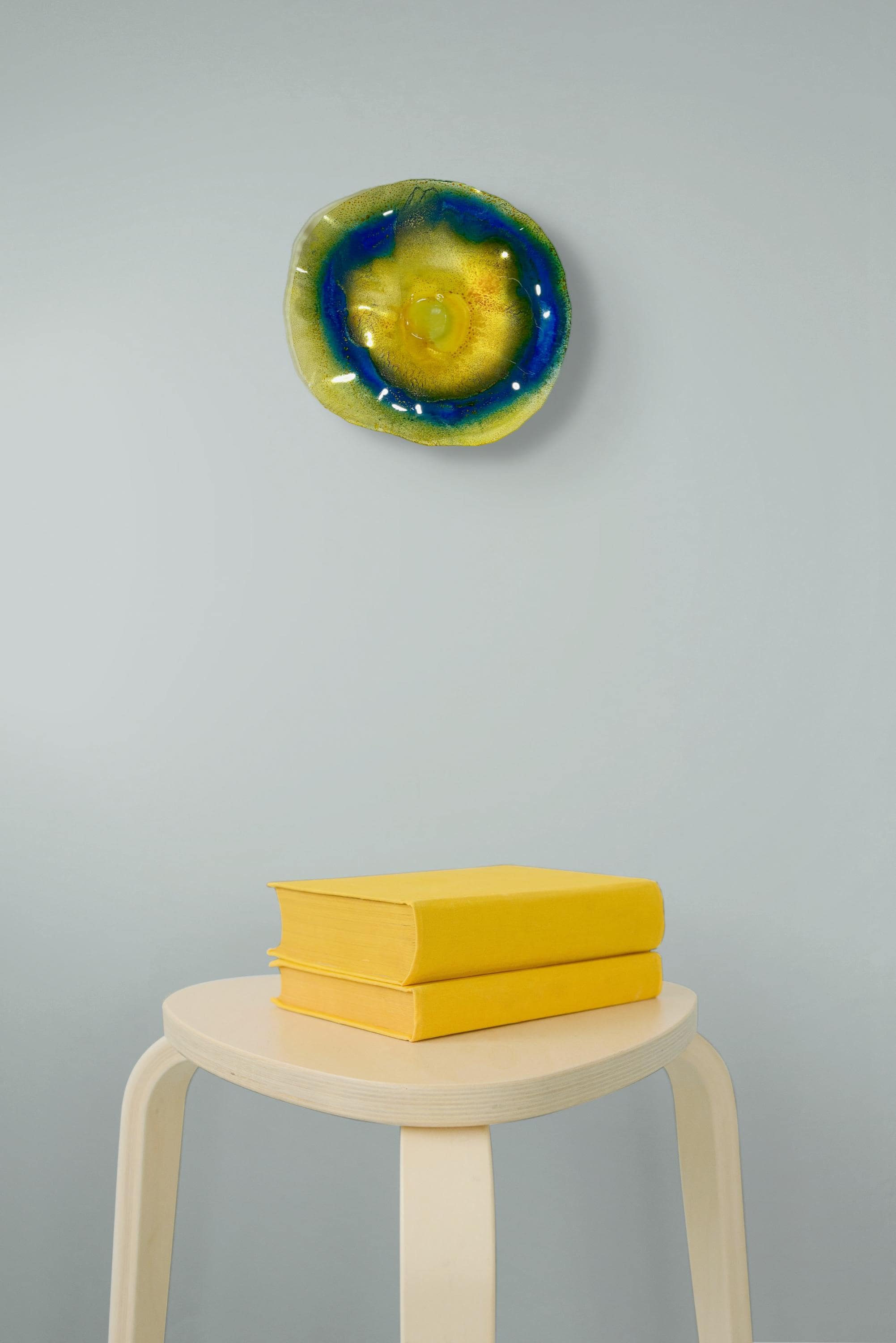 Bring a touch of elegance to your space with this stunning 9” wall flower, handcrafted by Todd Lynd. Made from recycled plastic, this unique art piece resembles beautiful glass, showcasing a vibrant blend of yellow and blue hues. Perfect for adding a pop of color to your home decor, this one-of-a-kind creation is sure to be a conversation starter. Elevate your interior with this environmentally-friendly masterpiece that embodies creativity and sustainability.
