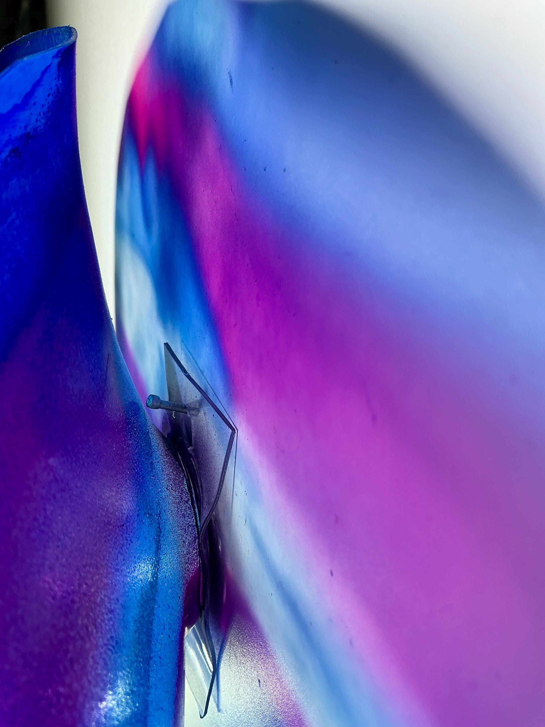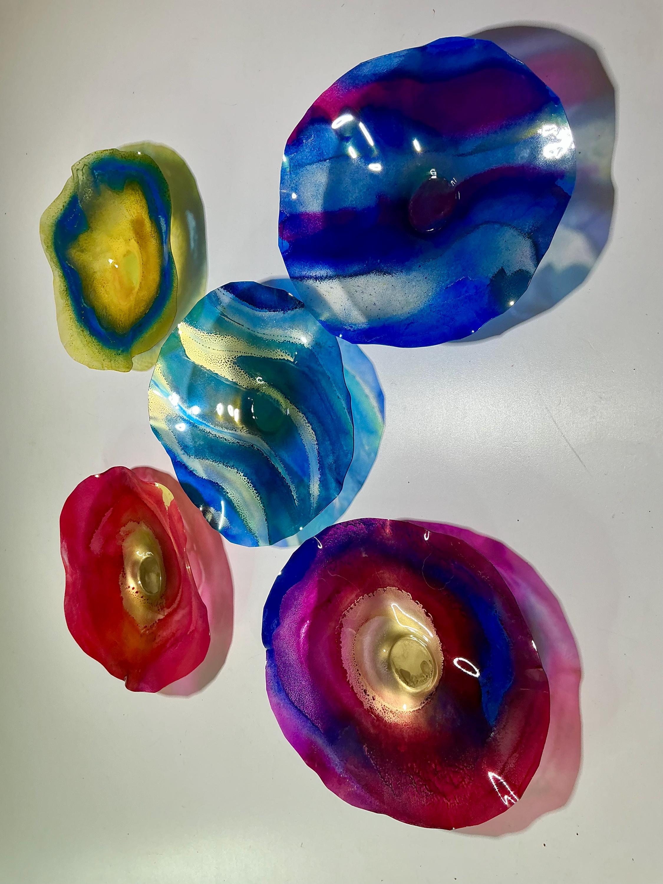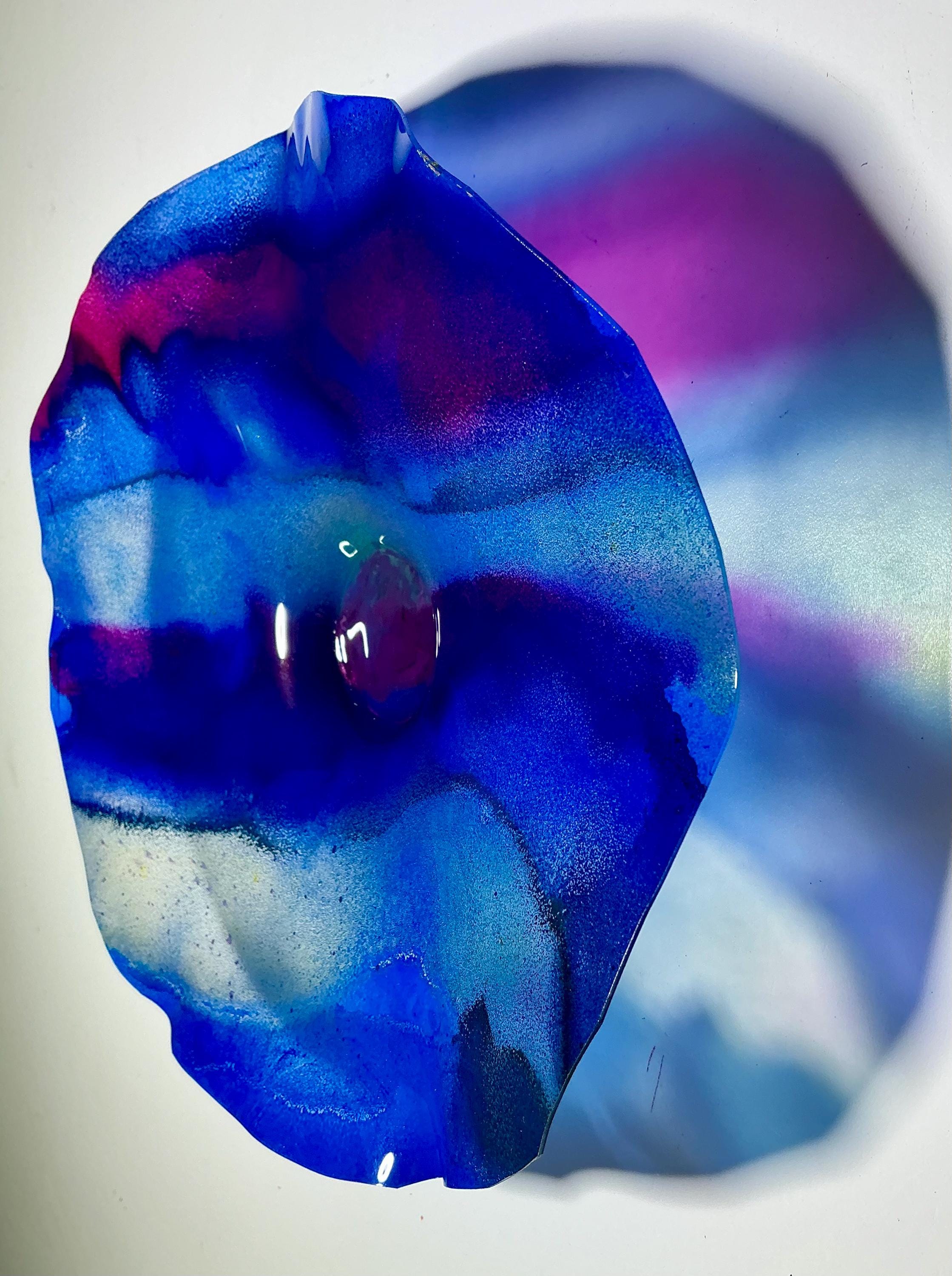 Each collectible piece is unique, no two are alike. This permanent, colorful, eye catching art looks and feels like glass. It shimmers in the light resembling water. They are very DURABLE AND LIGHTWEIGHT. This flower is easy to hang all weather and UV resistant. Great for indoor or outdoor decorating.