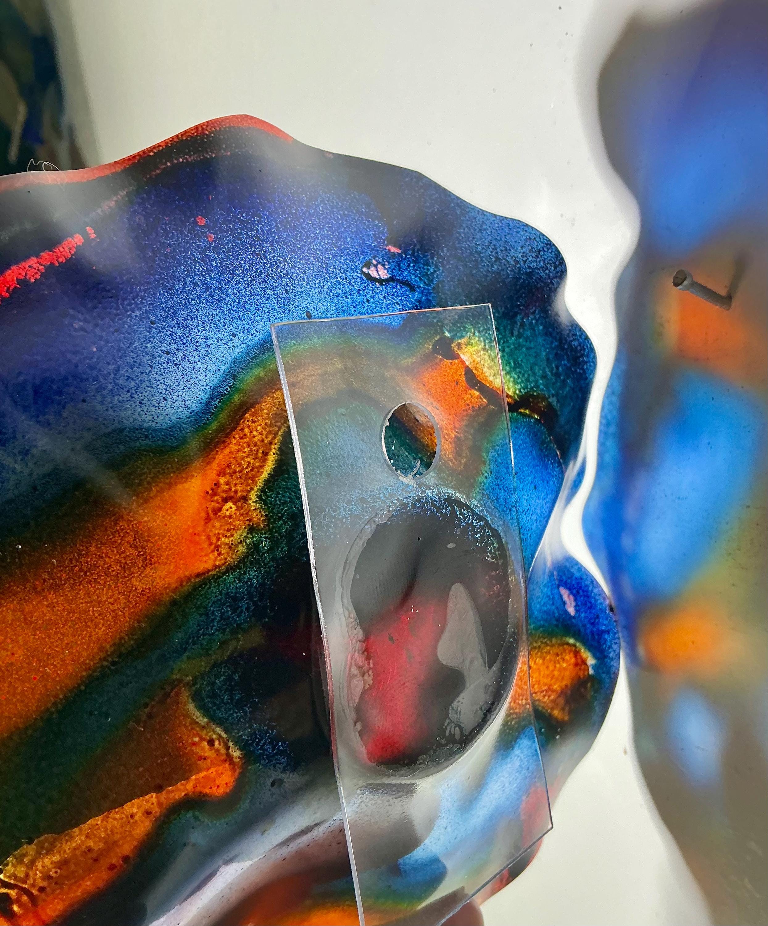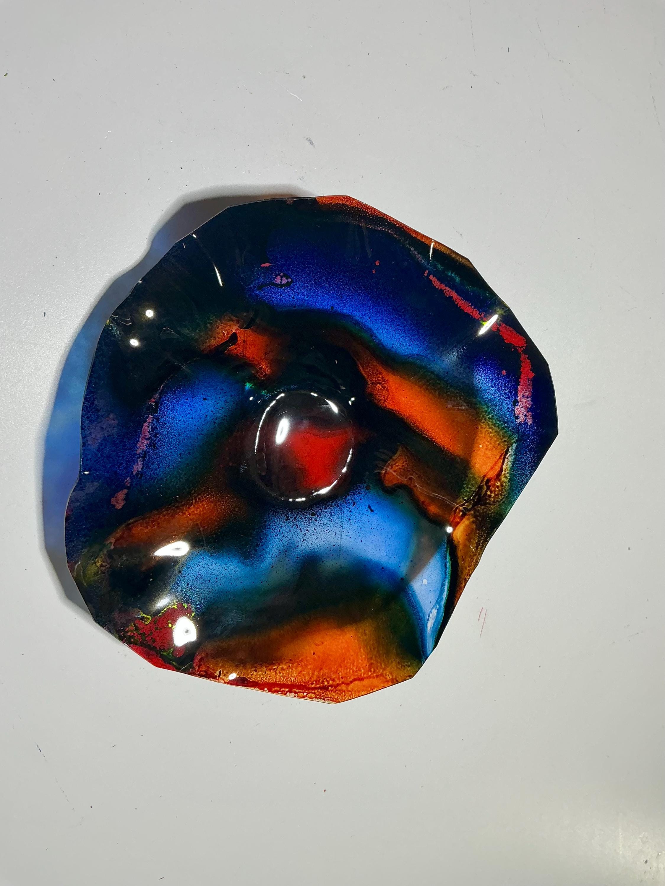 Elevate your space with this stunning 5-inch dark blue with red and orange wall hanging! Handcrafted from upcycled plastic, it mimics the elegance of glass while being eco-friendly. This unique centerpiece adds a vibrant touch to any room, perfect for art lovers and sustainable home decor enthusiasts alike. Each piece is one-of-a-kind, showcasing the beauty of creativity and recycling. Bring art and nature together in your home with this captivating wall hanging!