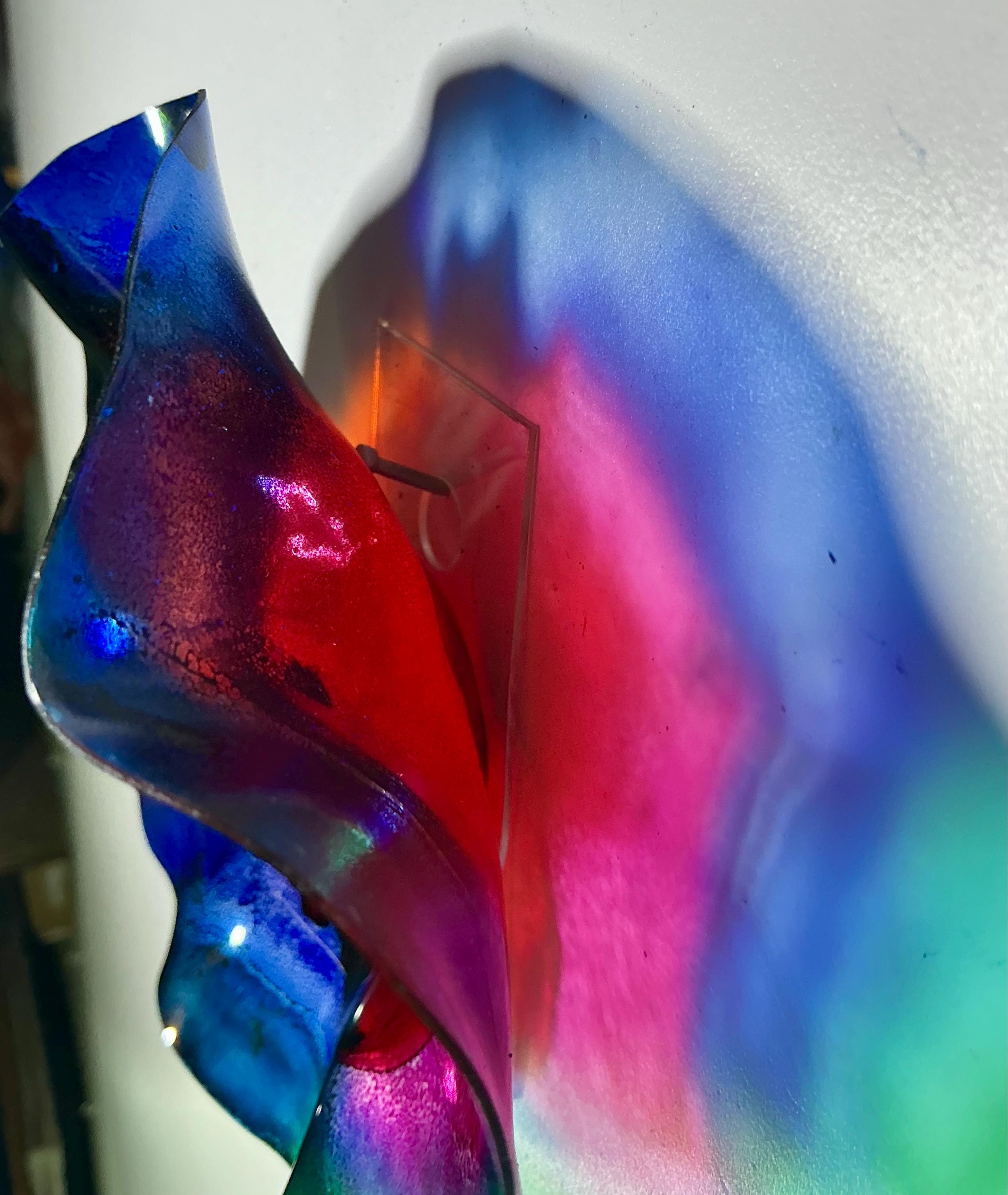 Each collectible piece is unique, no two are alike. This permanent, colorful, eye catching art looks and feels like glass. It shimmers in the light resembling water. They are very DURABLE AND LIGHTWEIGHT. This flower is easy to hang all weather and UV resistant. Great for indoor or outdoor decorating.