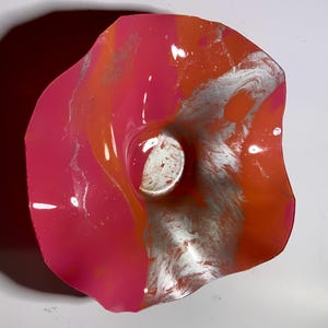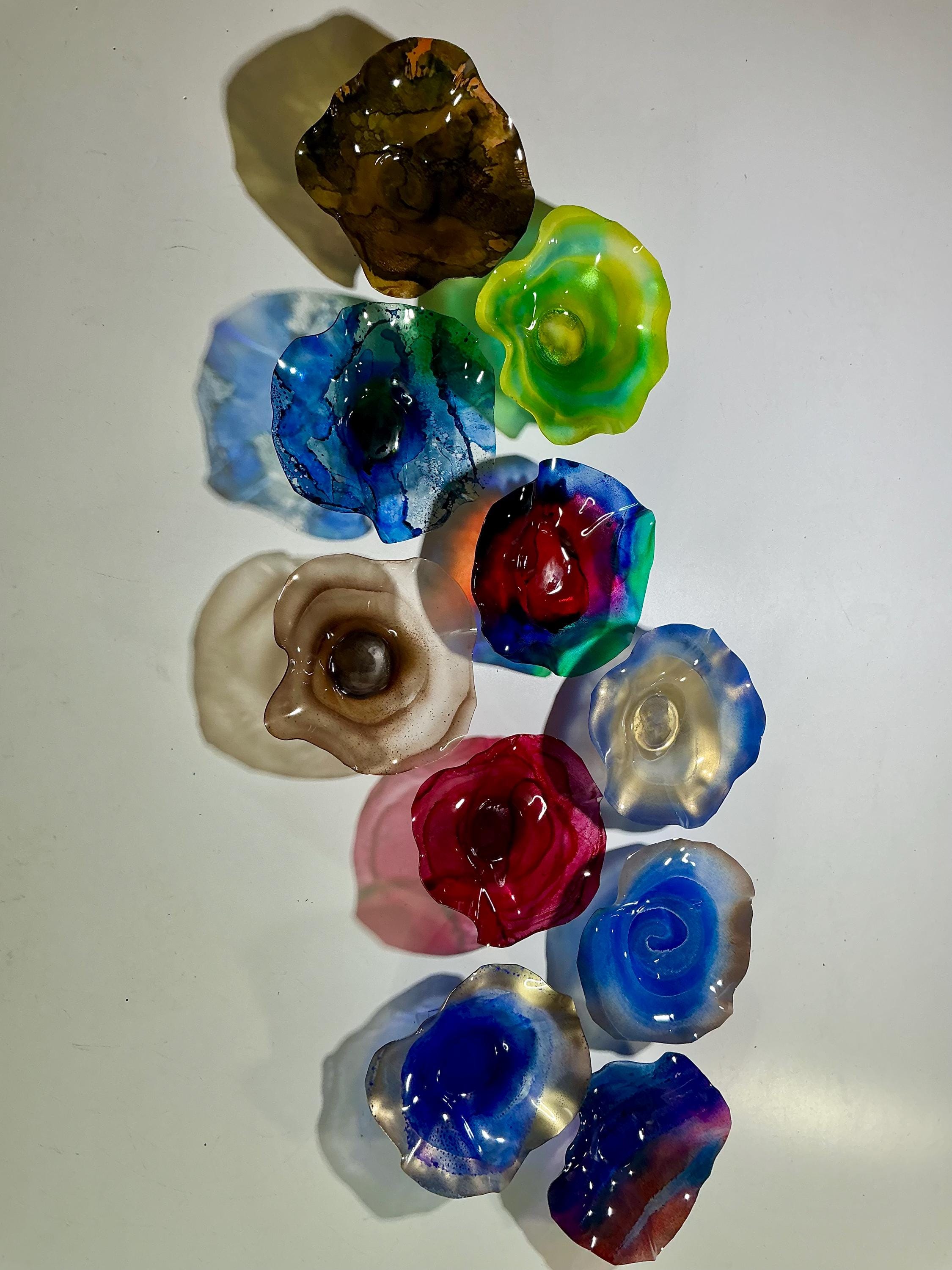 Each collectible piece is unique, no two are alike. This permanent, colorful, eye catching art looks and feels like glass. It shimmers in the light resembling water. They are very DURABLE AND LIGHTWEIGHT. These flowers are easy to hang, are all weather and UV resistant. Great for indoor or outdoor decorating.