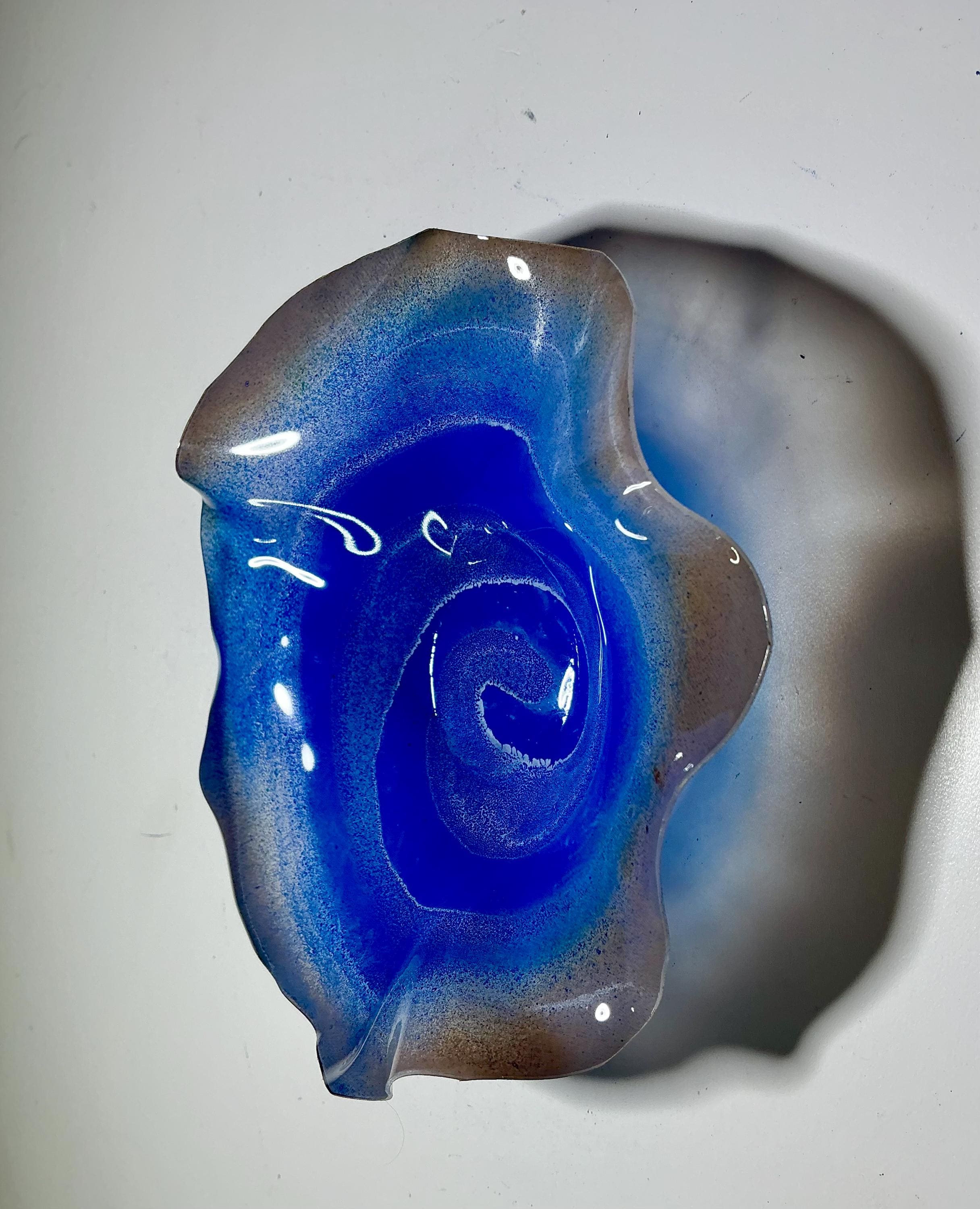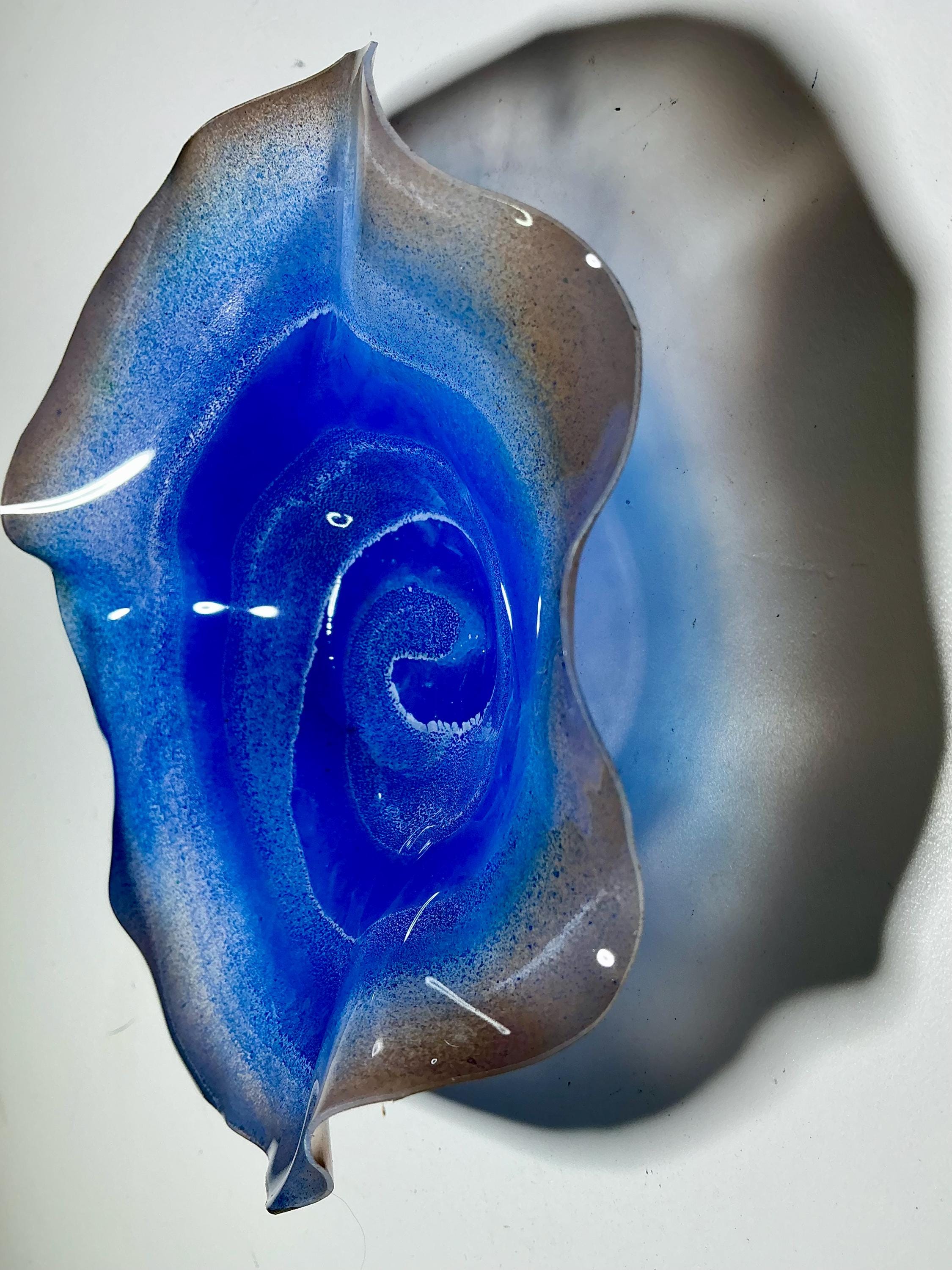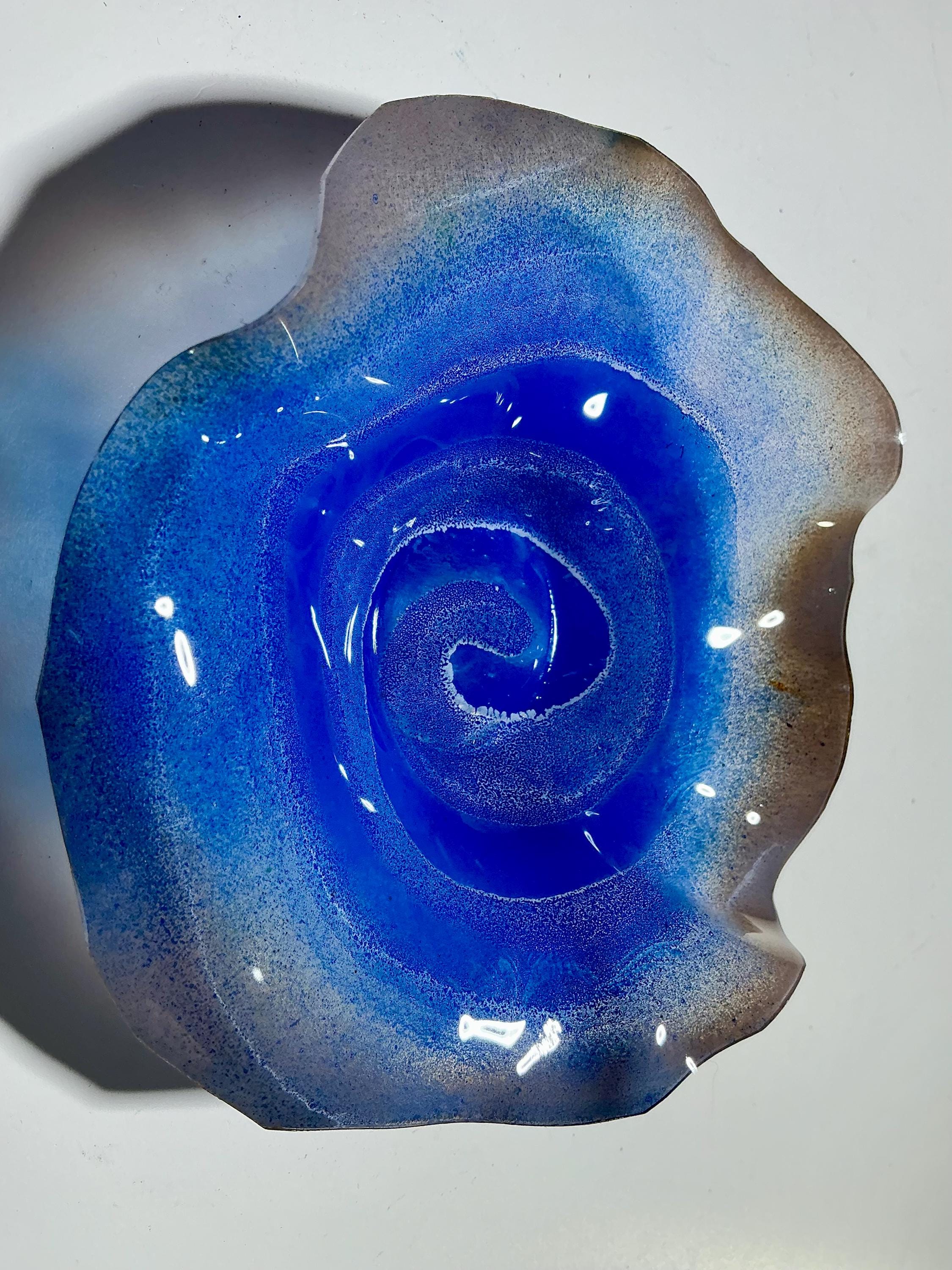 Eye catching wall flower earth brown and ocean blue with brown center. The light filters through casting a colorful glow to the hanging surface.