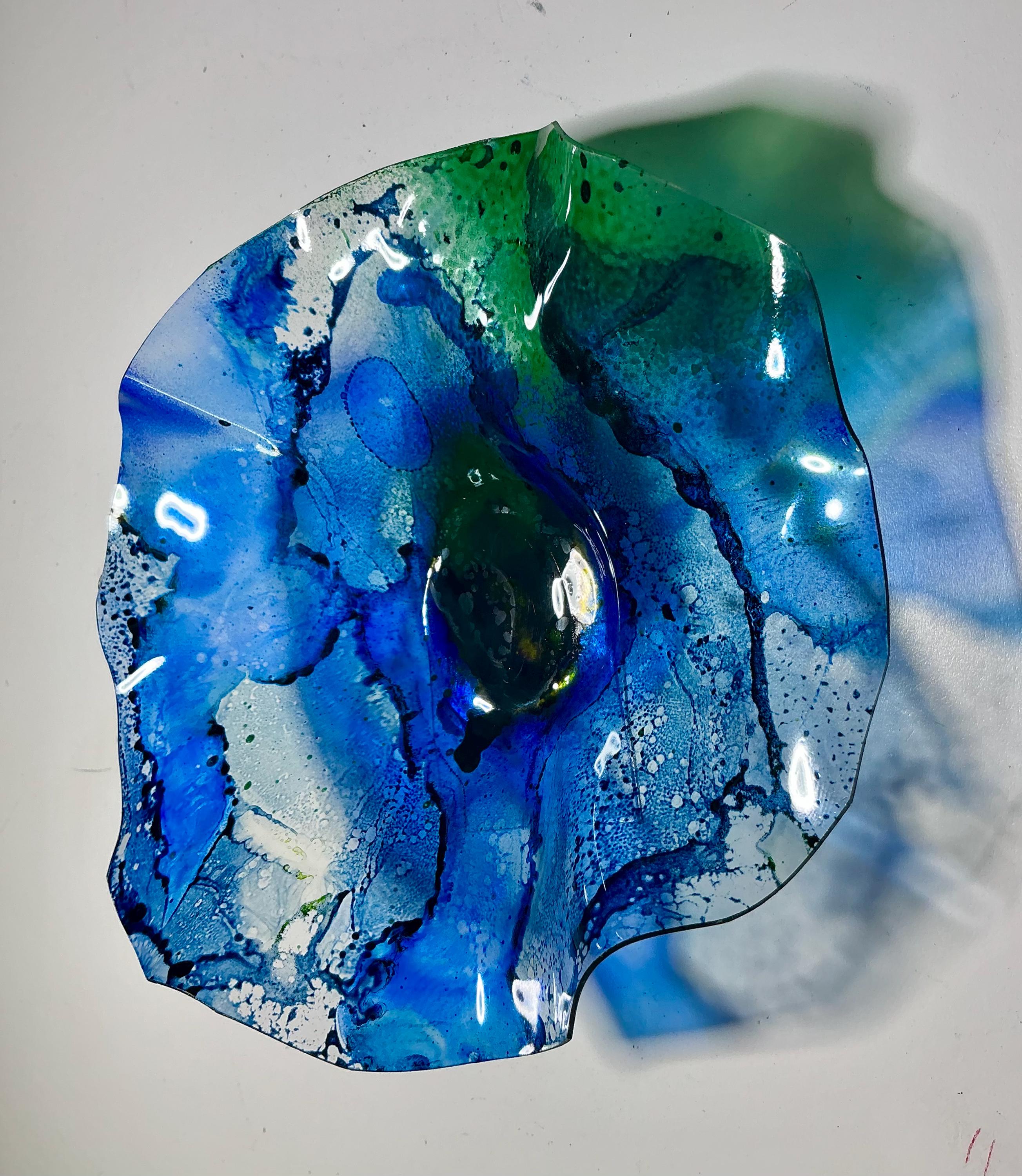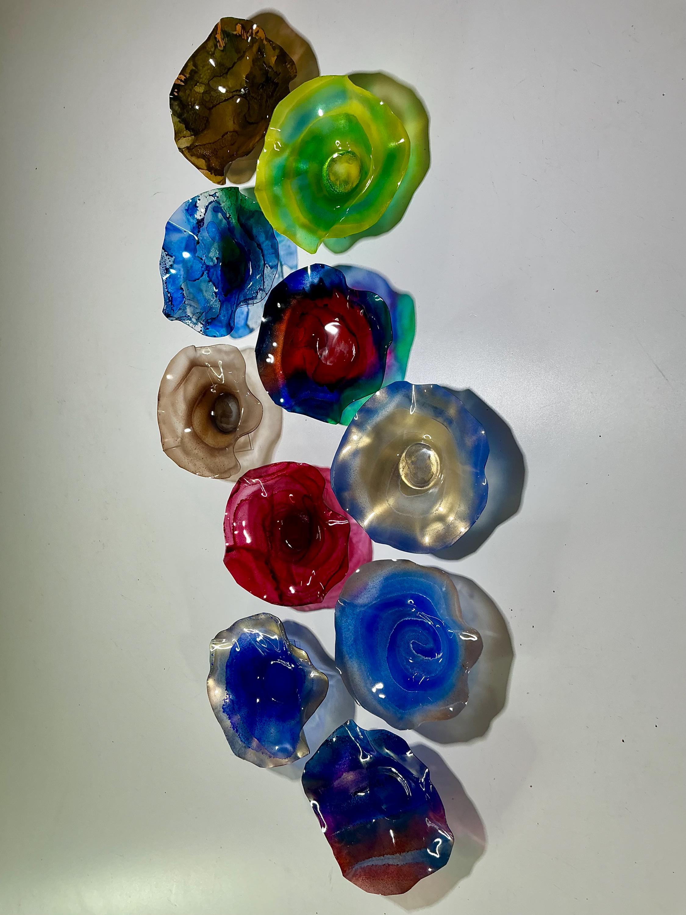 Each collectible piece is unique, no two are alike. This permanent, colorful, eye catching art looks and feels like glass. It shimmers in the light resembling water. They are very DURABLE AND LIGHTWEIGHT. These flowers are easy to hang ,are all weather and UV resistant. Great for indoor or outdoor decorating.
