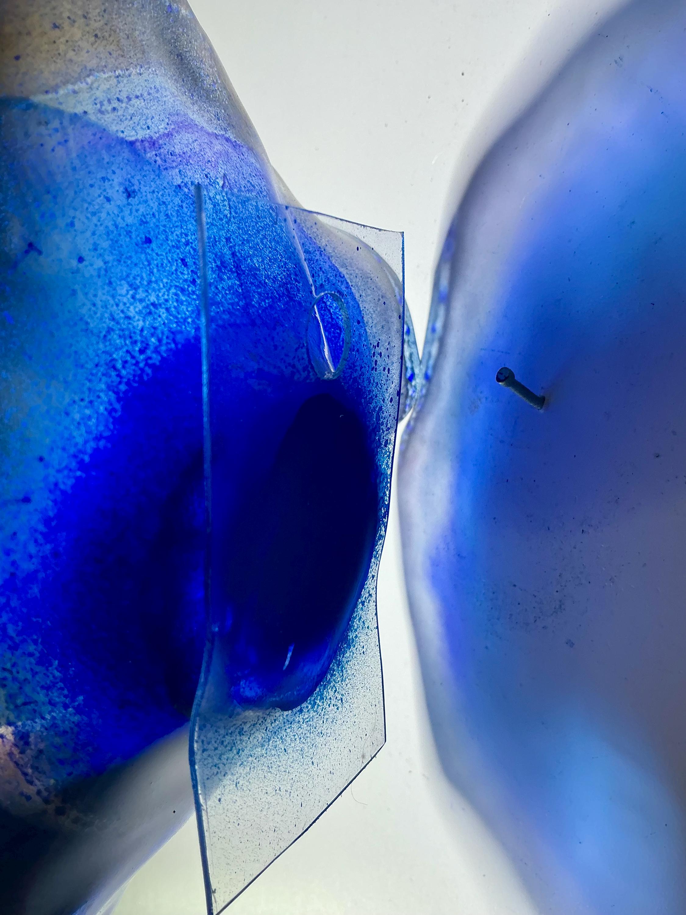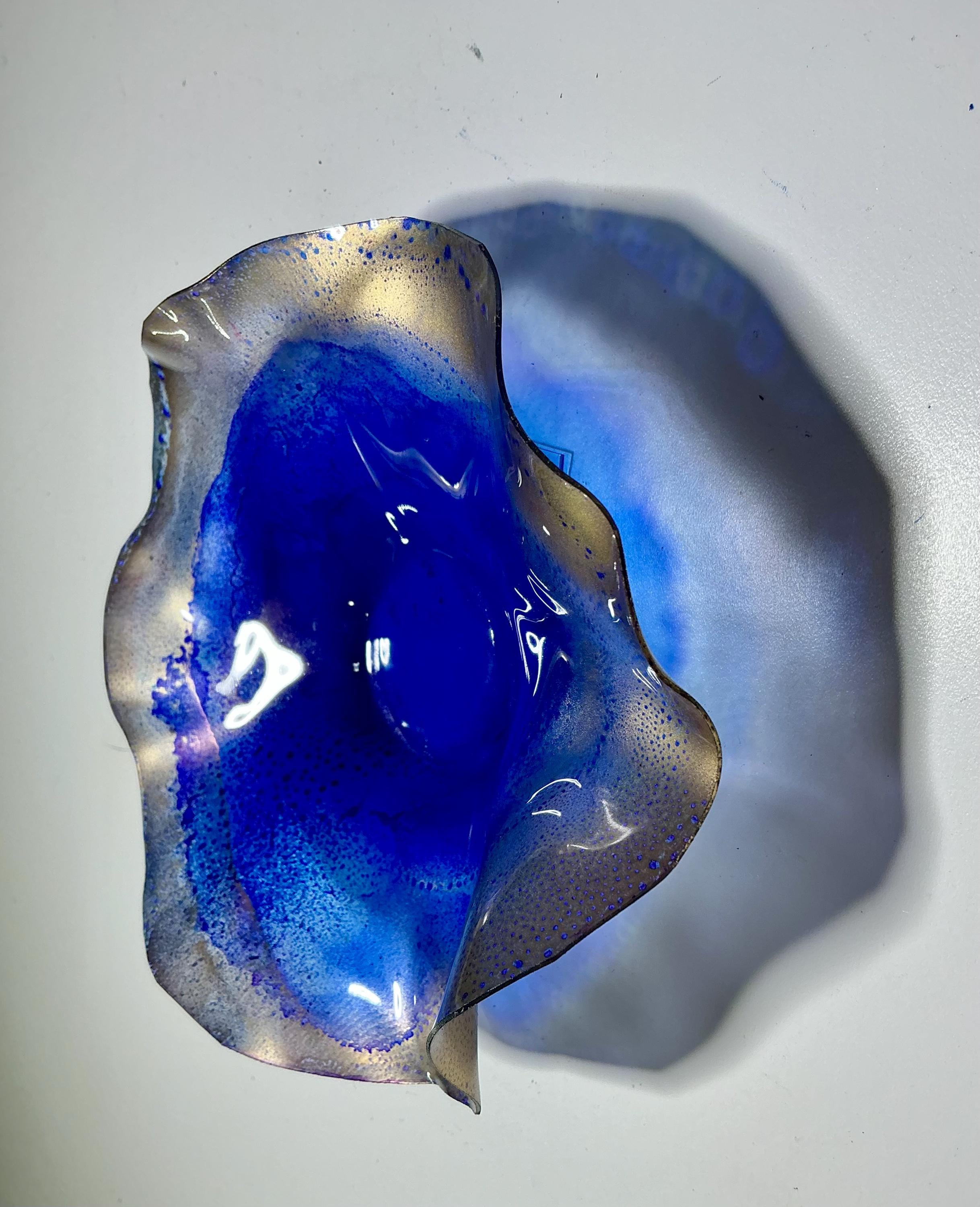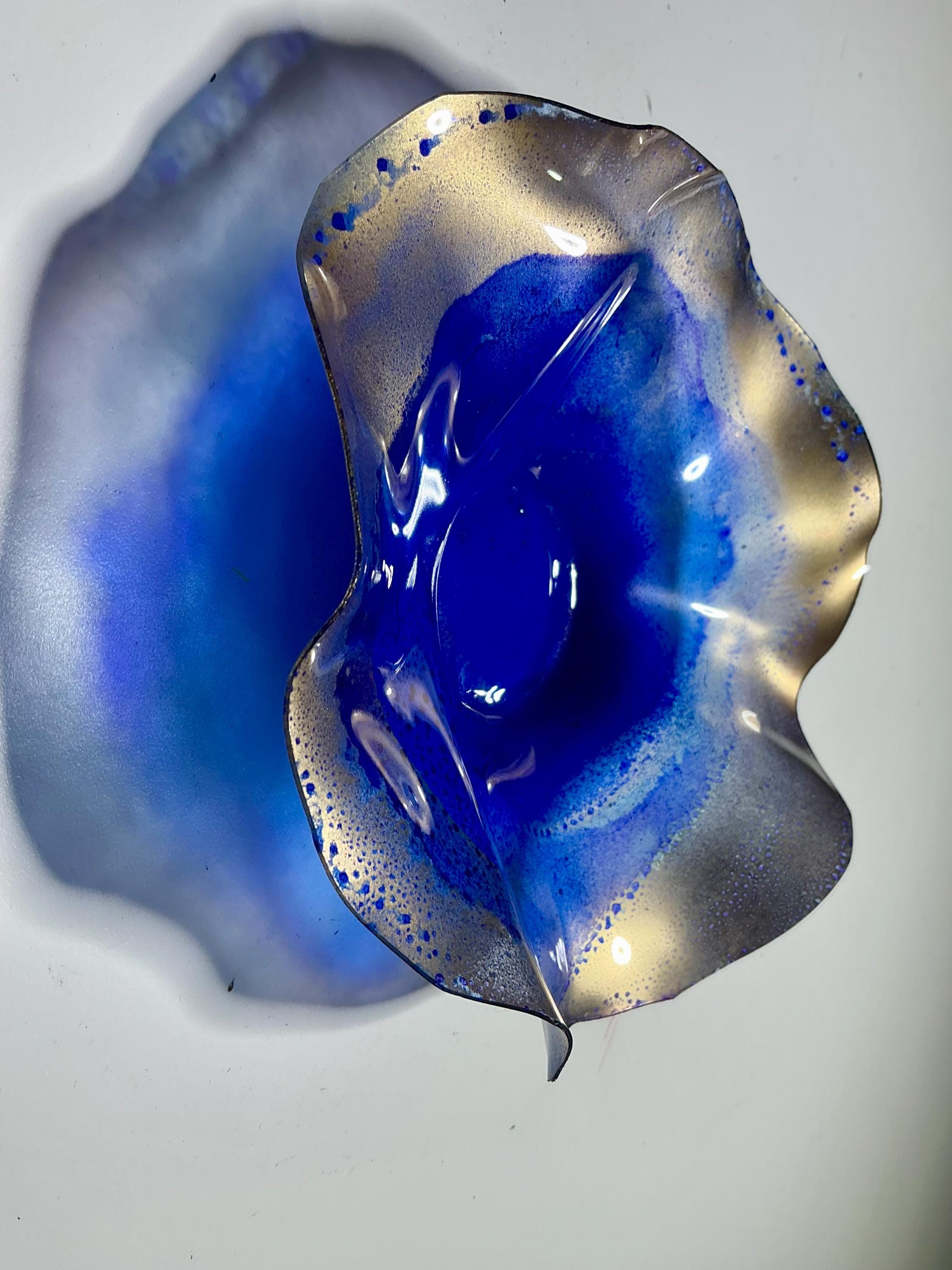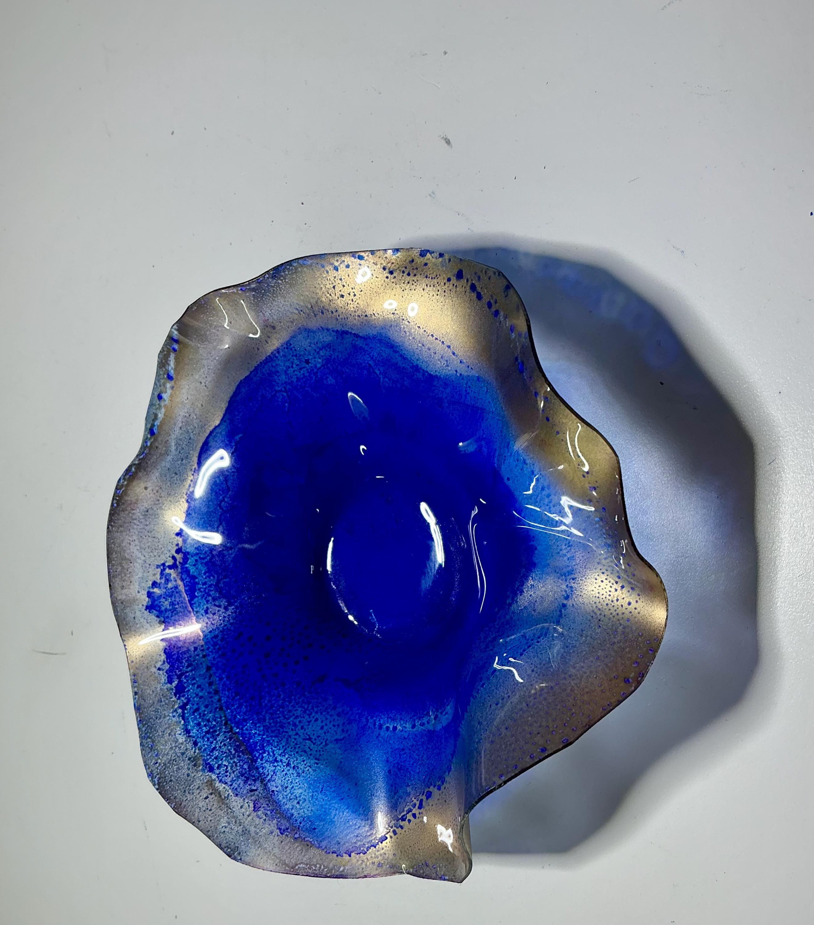 Colorful Handmade platter cobalt blue/gold wall hanging home decor/poolside art/recycled plastic extra small 5” looks like glass/unique gift