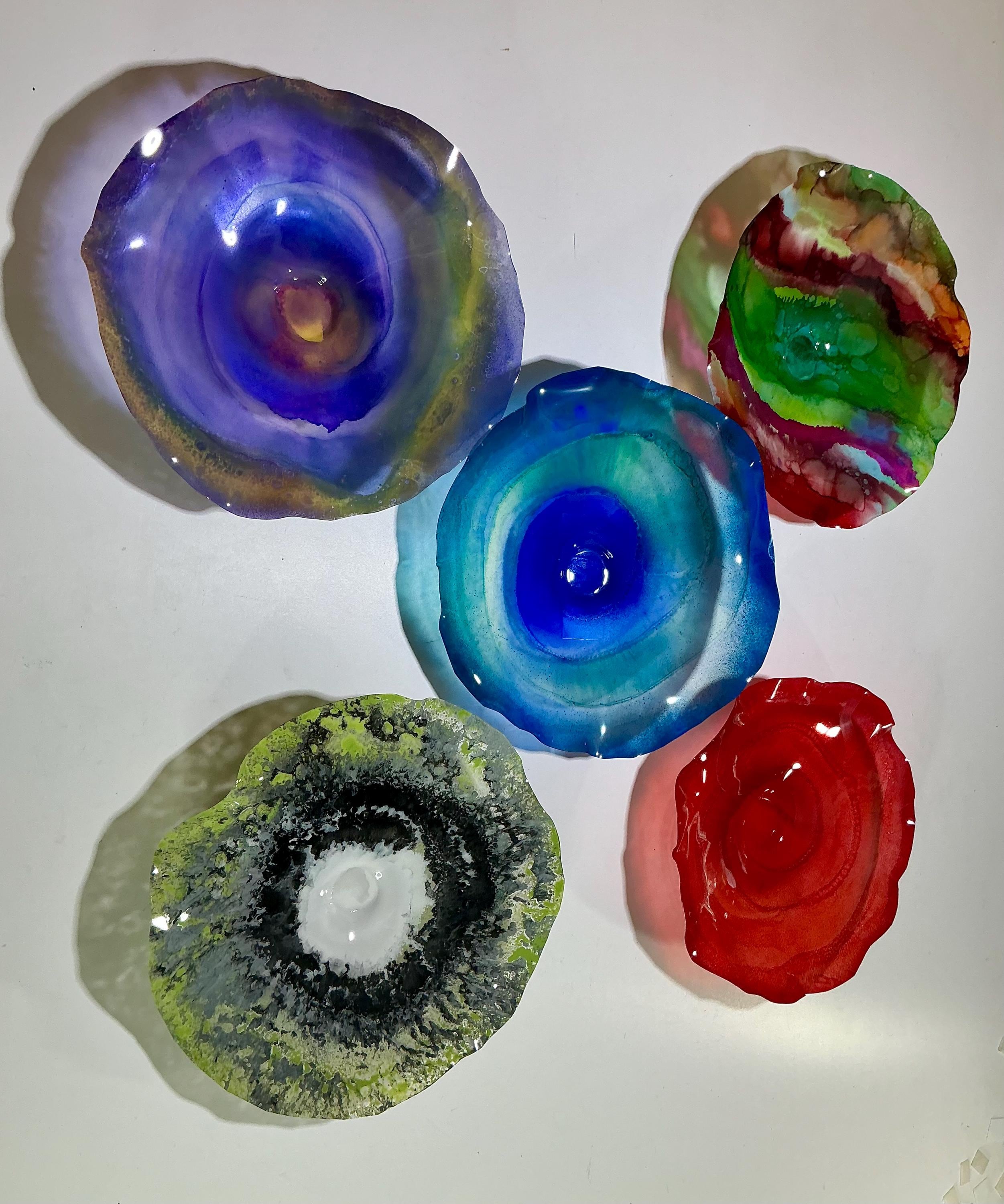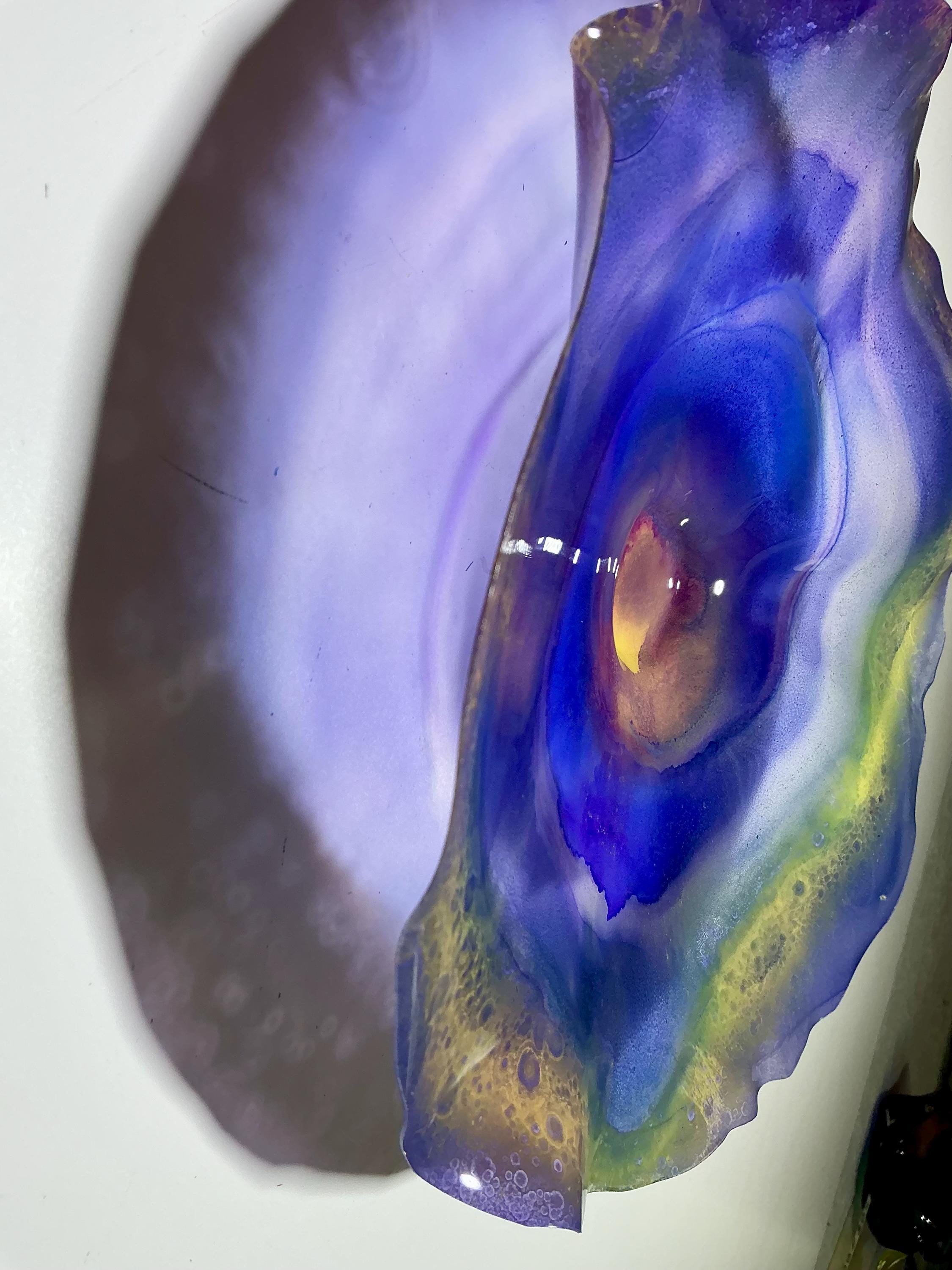 Each collectible piece is unique, no two are alike. This permanent, colorful, eye catching art looks and feels like glass. It shimmers in the light resembling water. They are very DURABLE, AND LIGHTWEIGHT. These flowers are easy to hang, all weather and UV resistant. Great for indoor or outdoor decorating.