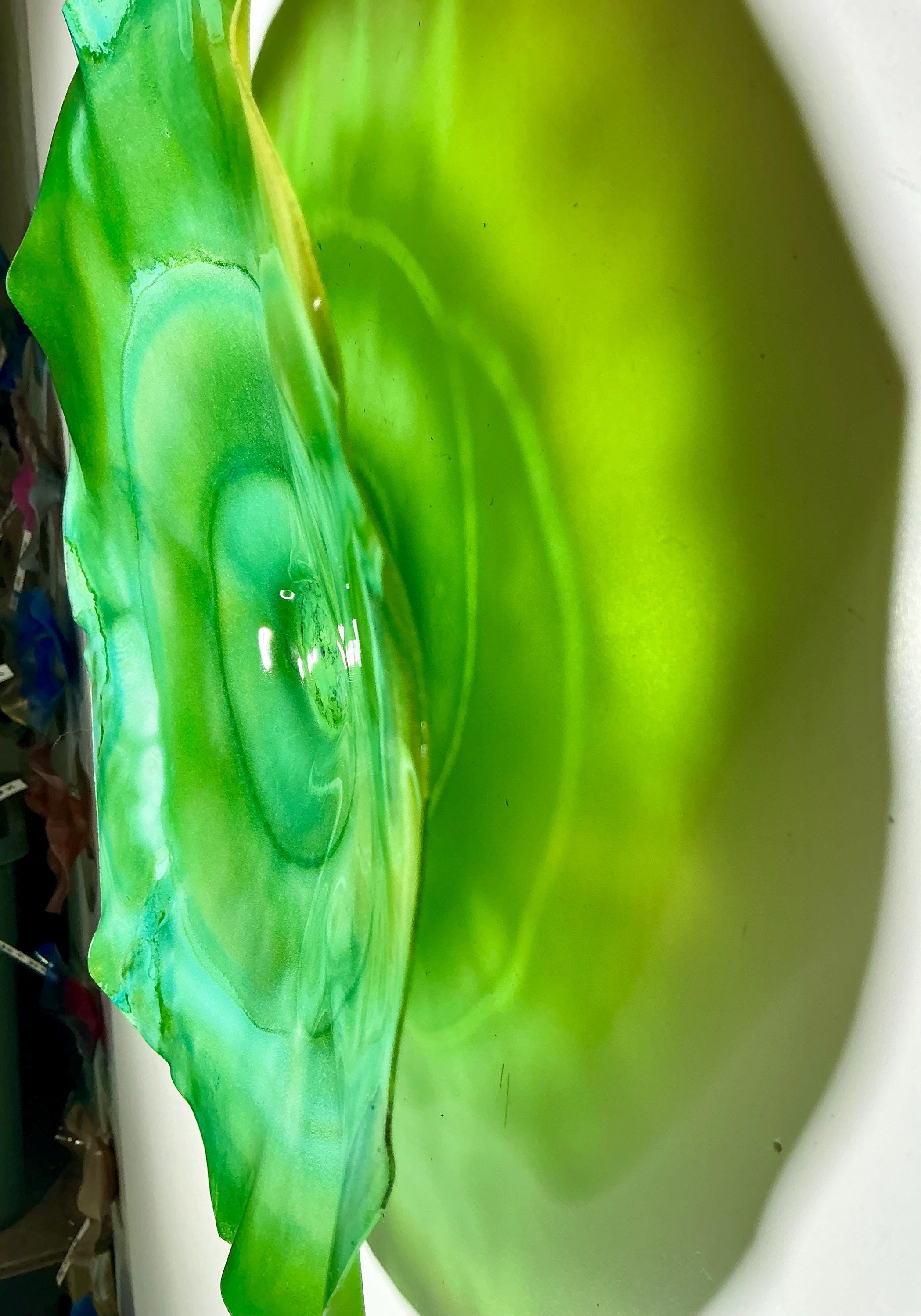 Medium wall flower Dish art 12" vibrant green handmade recycled plastic/earth tone home decor/wall mount/looks like glass