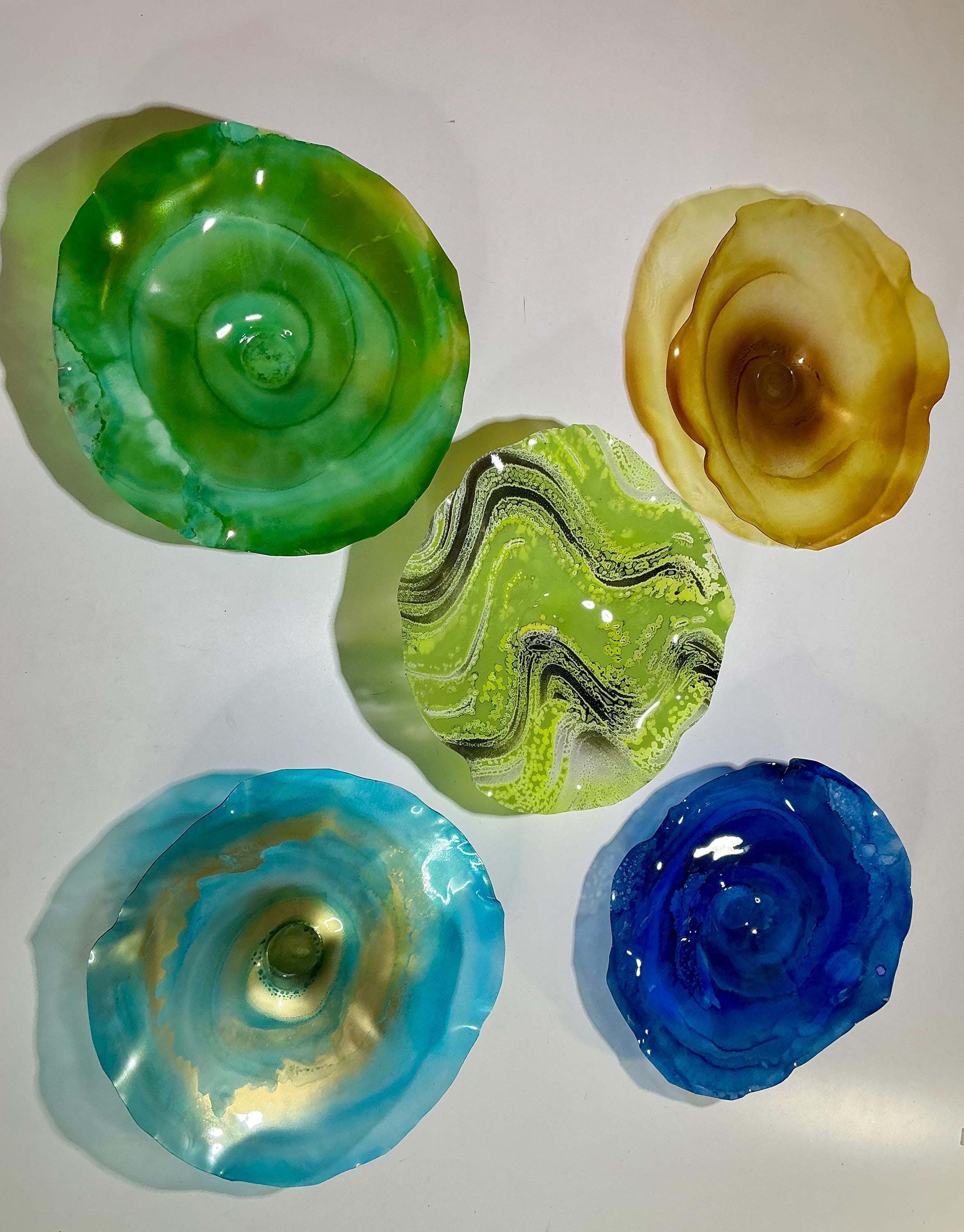 Each collectible piece is unique, no two are alike. This permanent, colorful, eye catching art looks and feels like glass. It shimmers in the light resembling water. They are very DURABLE, AND LIGHTWEIGHT. These flowers are easy to hang, all weather and UV resistant. Great for indoor or outdoor decorating.