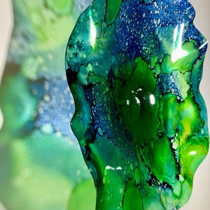 Each collectible piece is unique, no two are alike. This permanent, colorful, eye catching art looks and feels like glass. It shimmers in the light resembling water. They are very DURABLE AND LIGHTWEIGHT. This flower is easy to hang all weather and UV resistant. Great for indoor or outdoor decorating.
