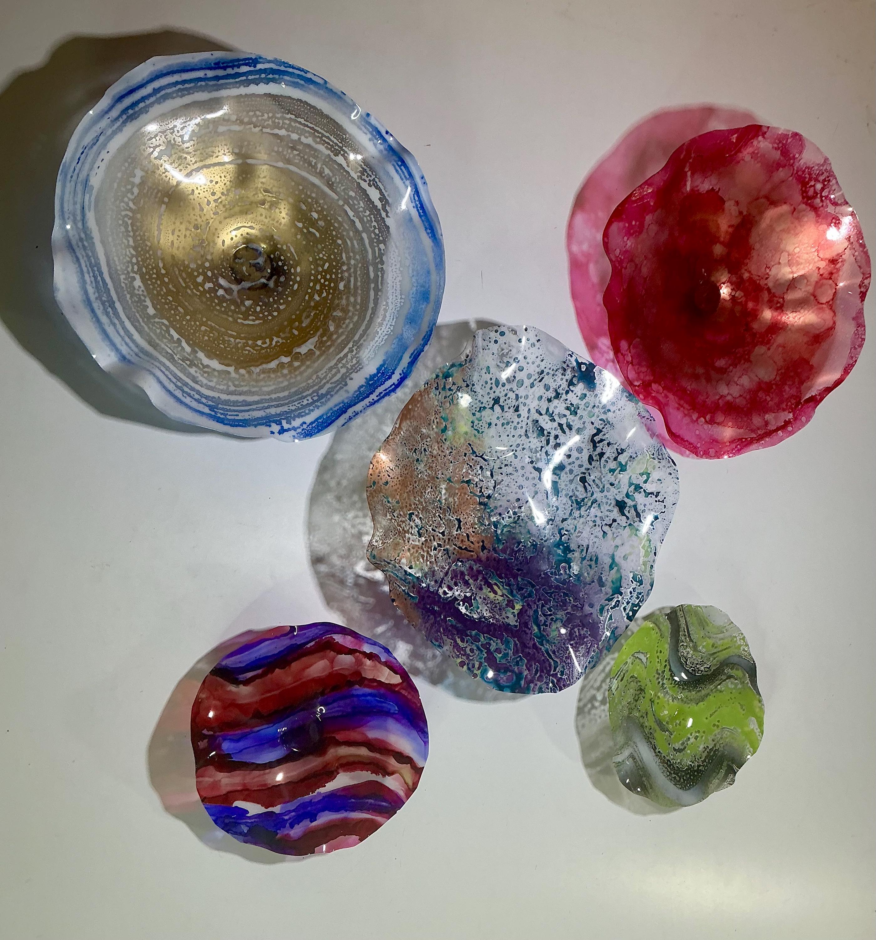 Each collectible piece is unique, no two are alike. This permanent, colorful, eye catching art looks and feels like glass. It shimmers in the light resembling water. They are very DURABLE AND LIGHTWEIGHT. This flower is easy to hang all weather and UV resistant. Great for indoor or outdoor decorating.