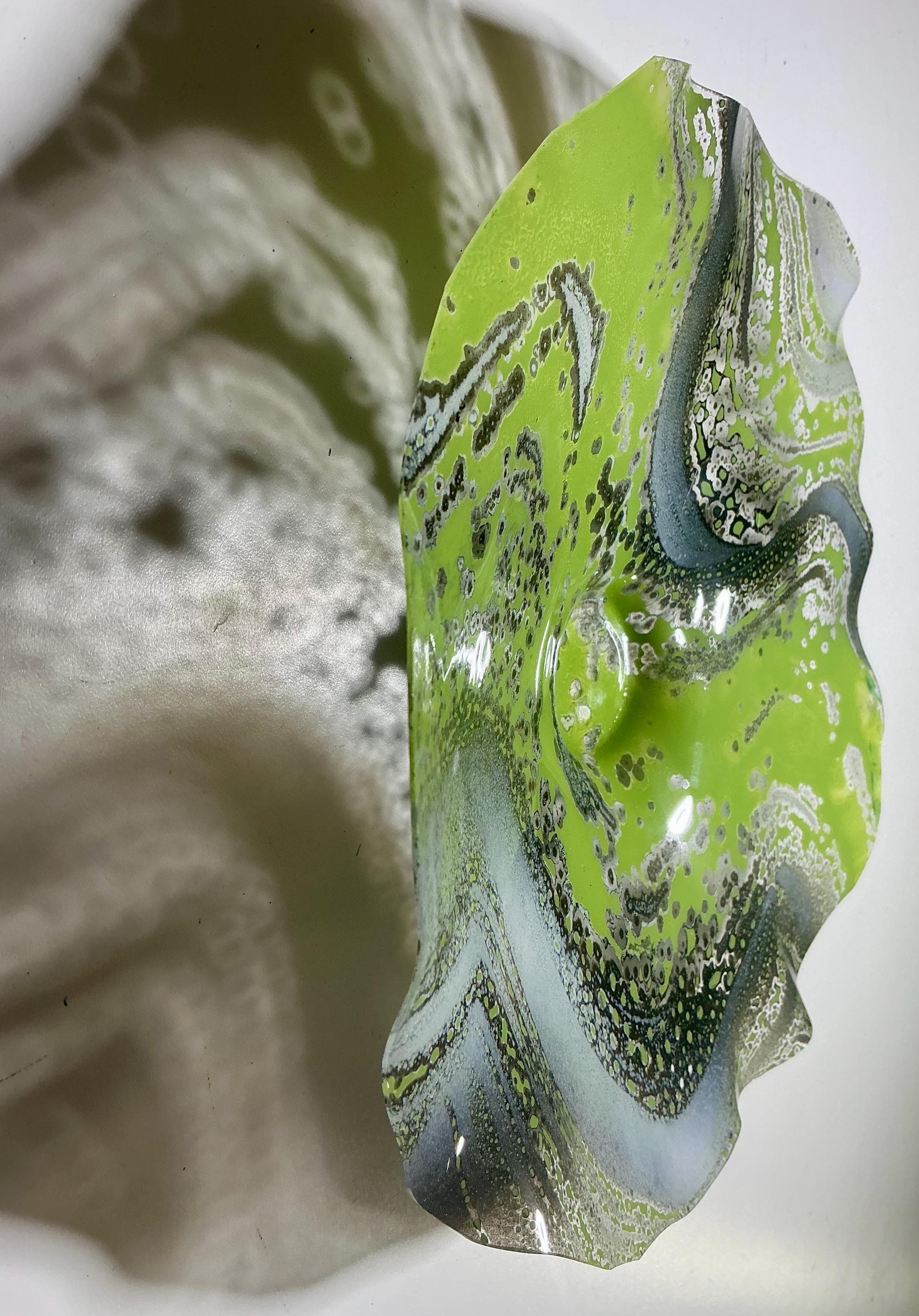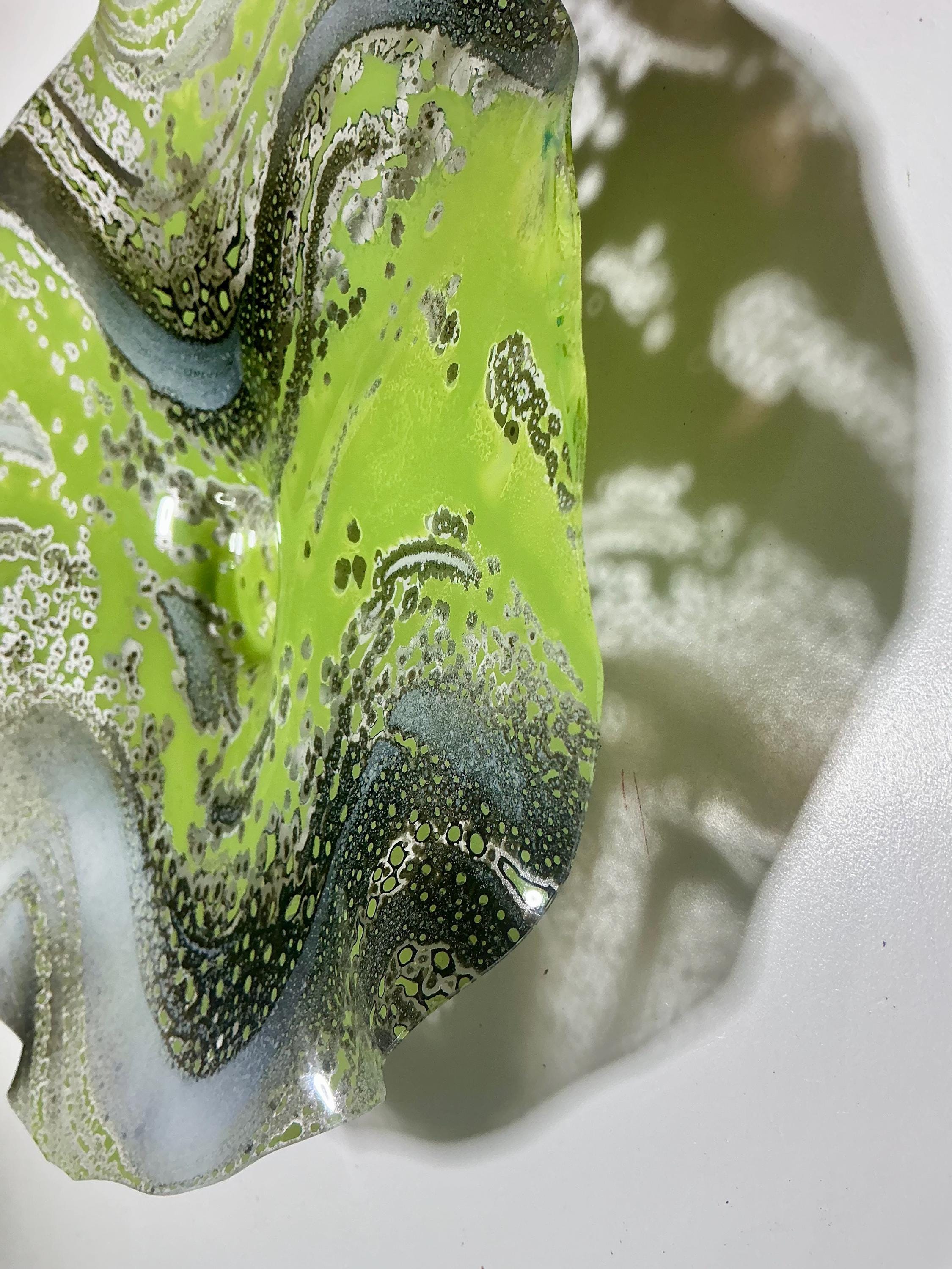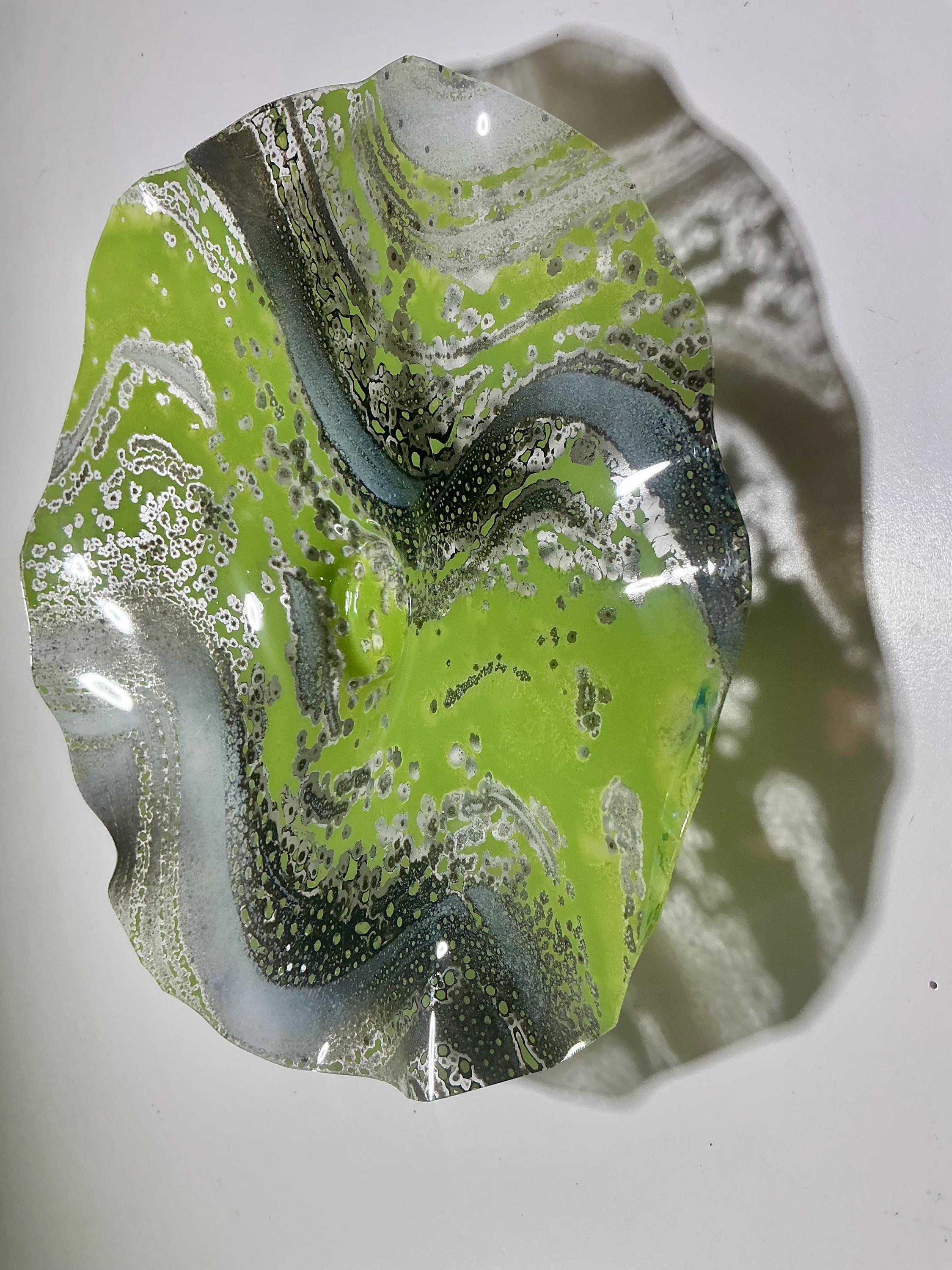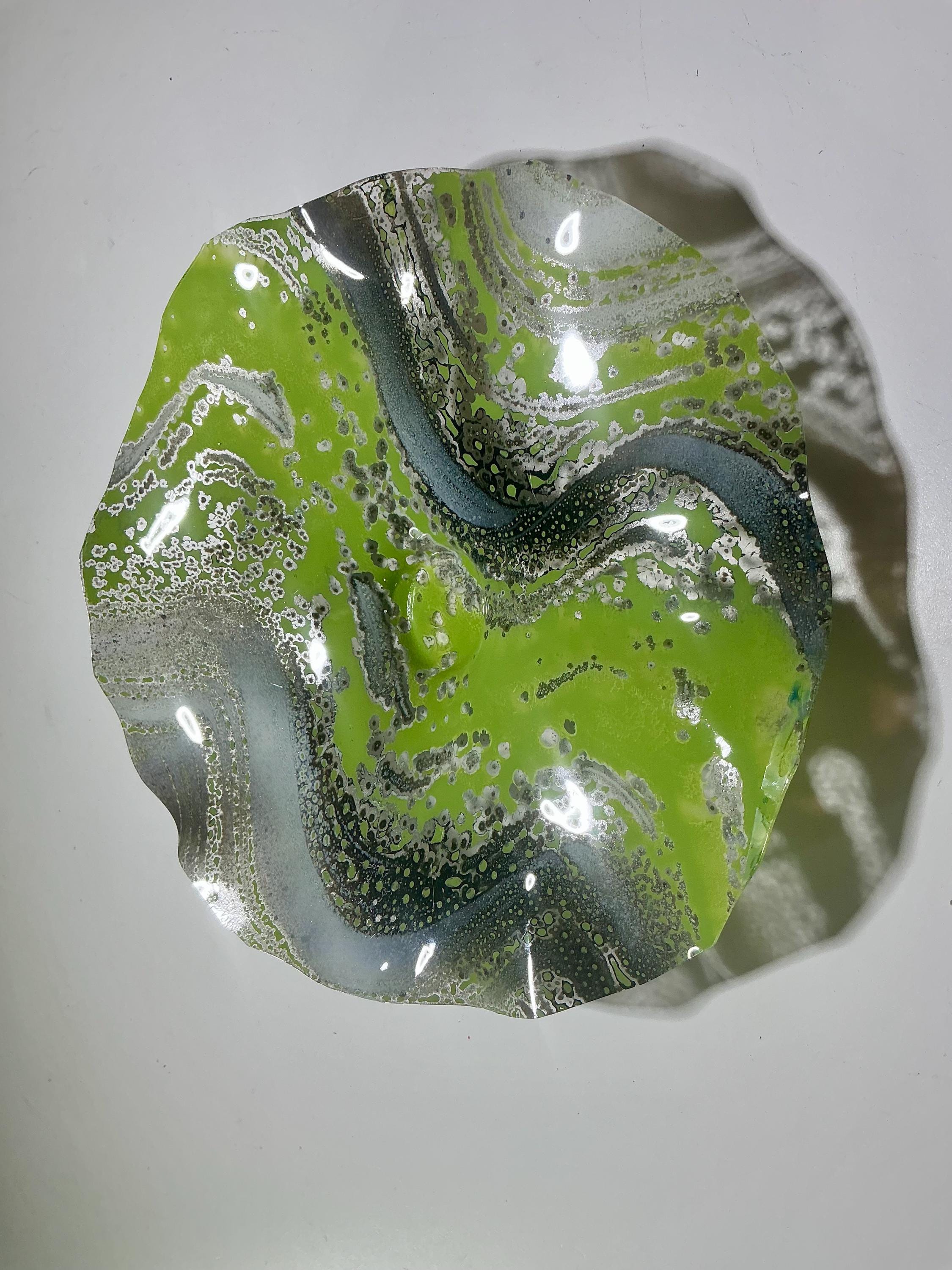 Beautiful Handcrafted 8” Wall Flower - green, gray and white Eco-Friendly Art-upcycled plastic- glass like look