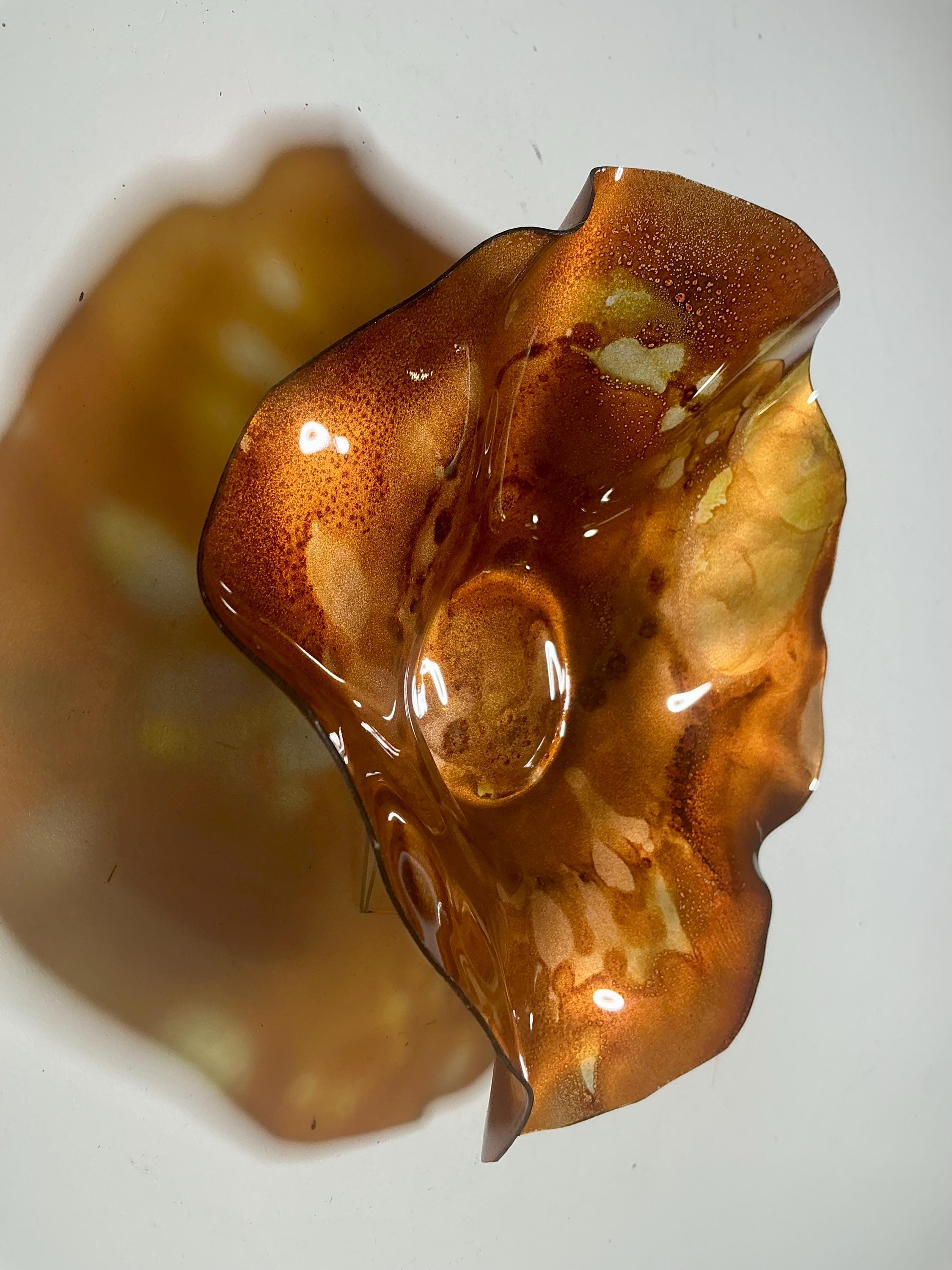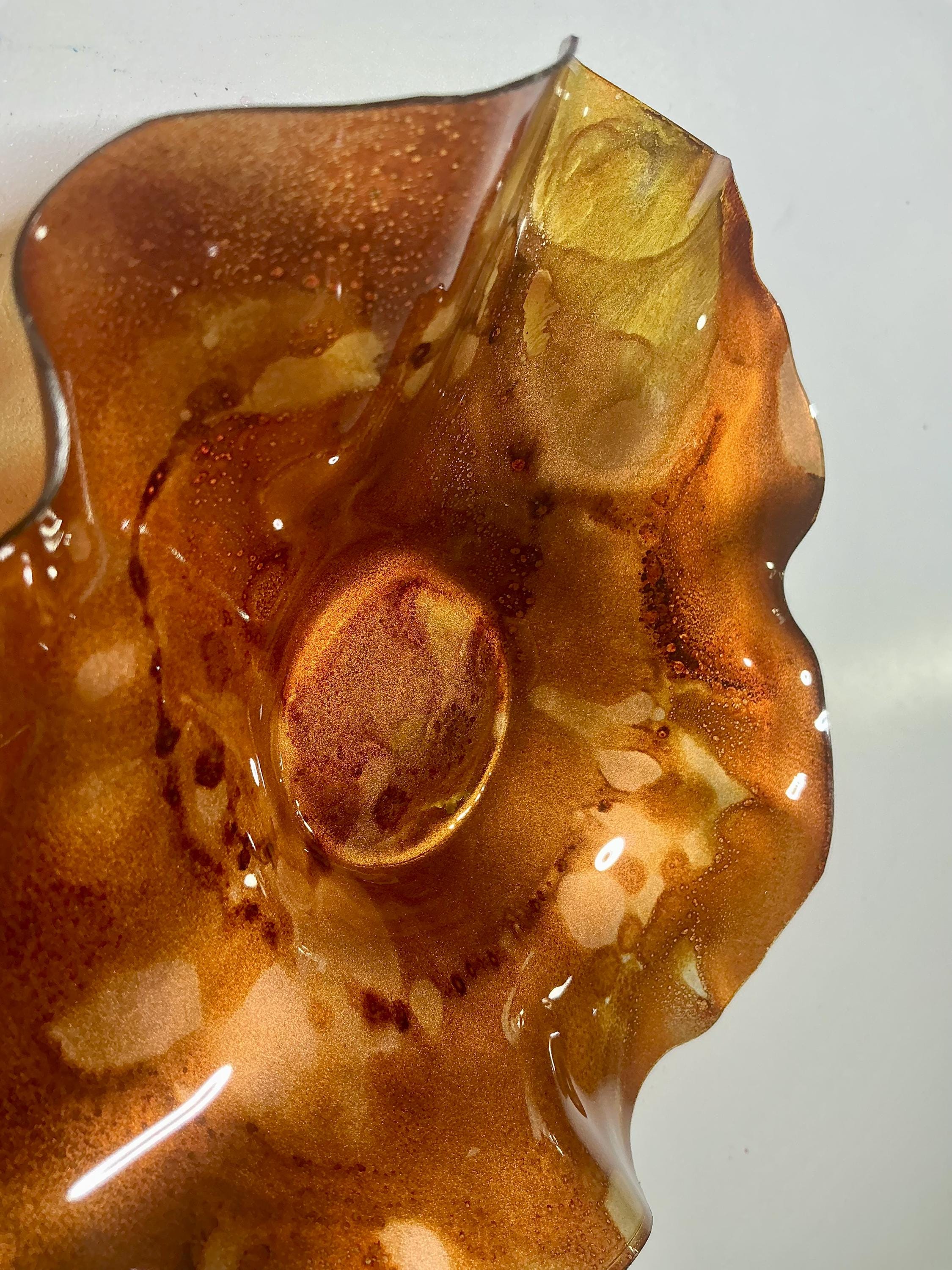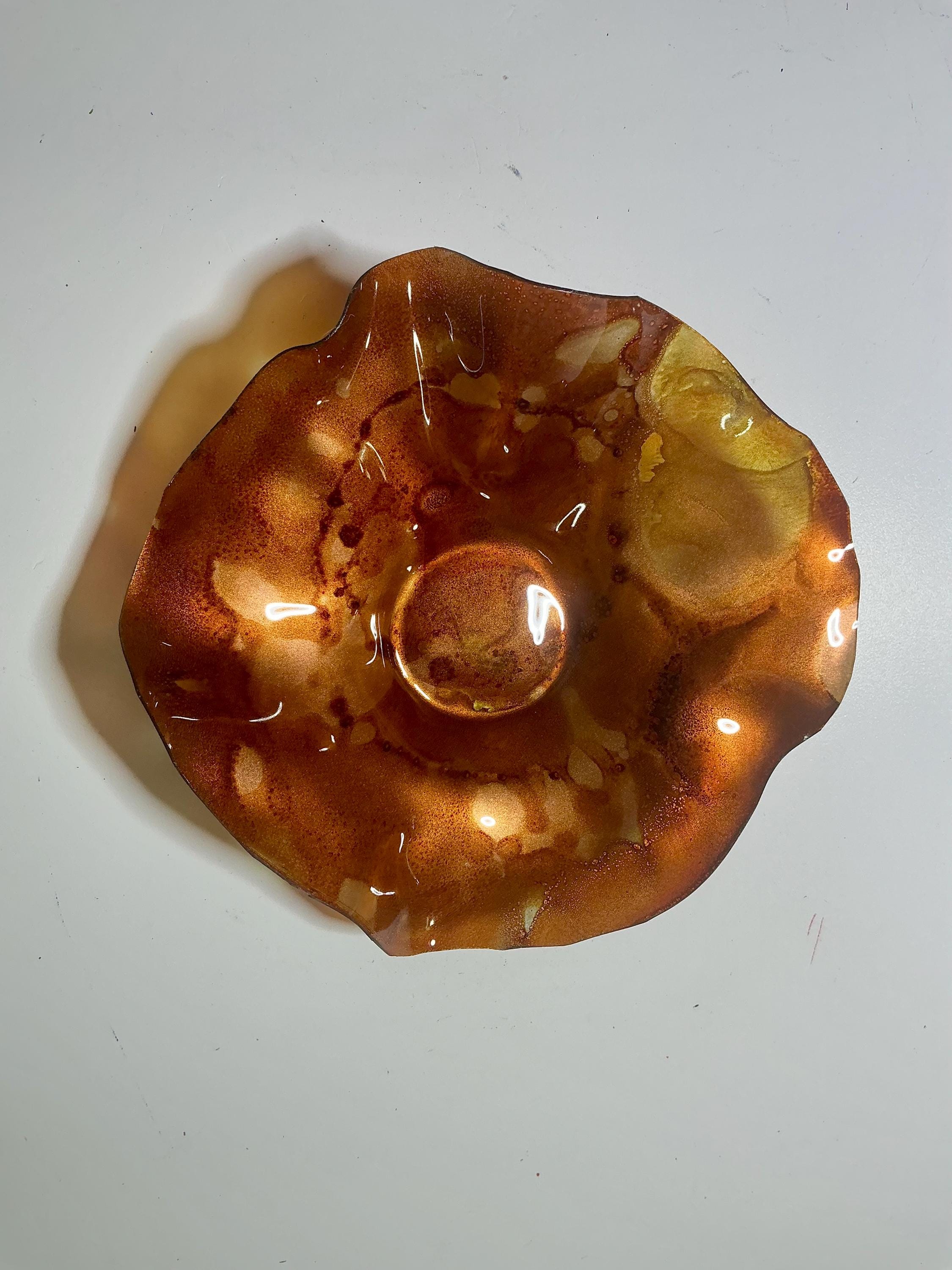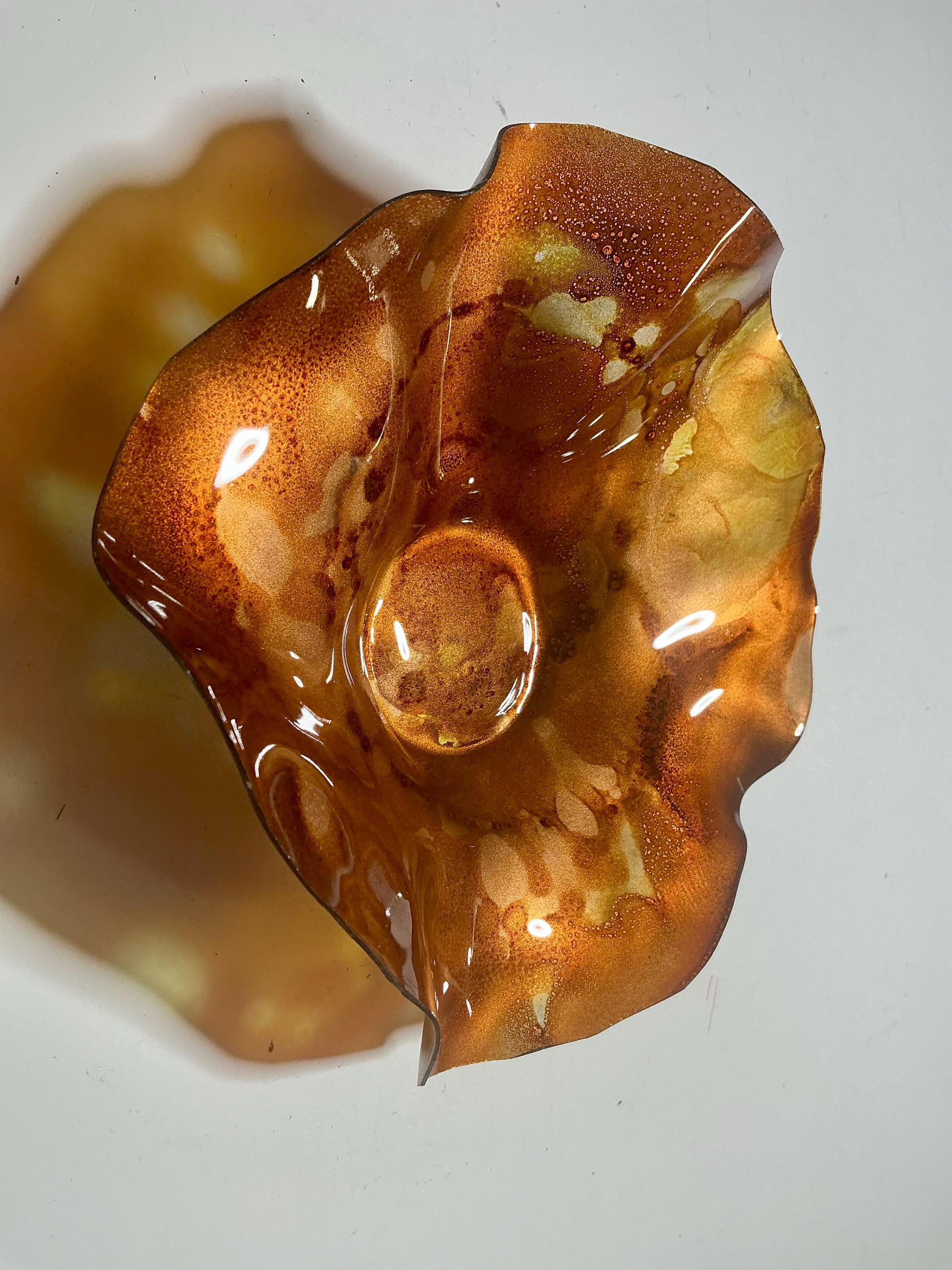 Eye catching wall flower stunning blend of copper and terra-cotta. The light filters through casting a colorful glow to the hanging surface.