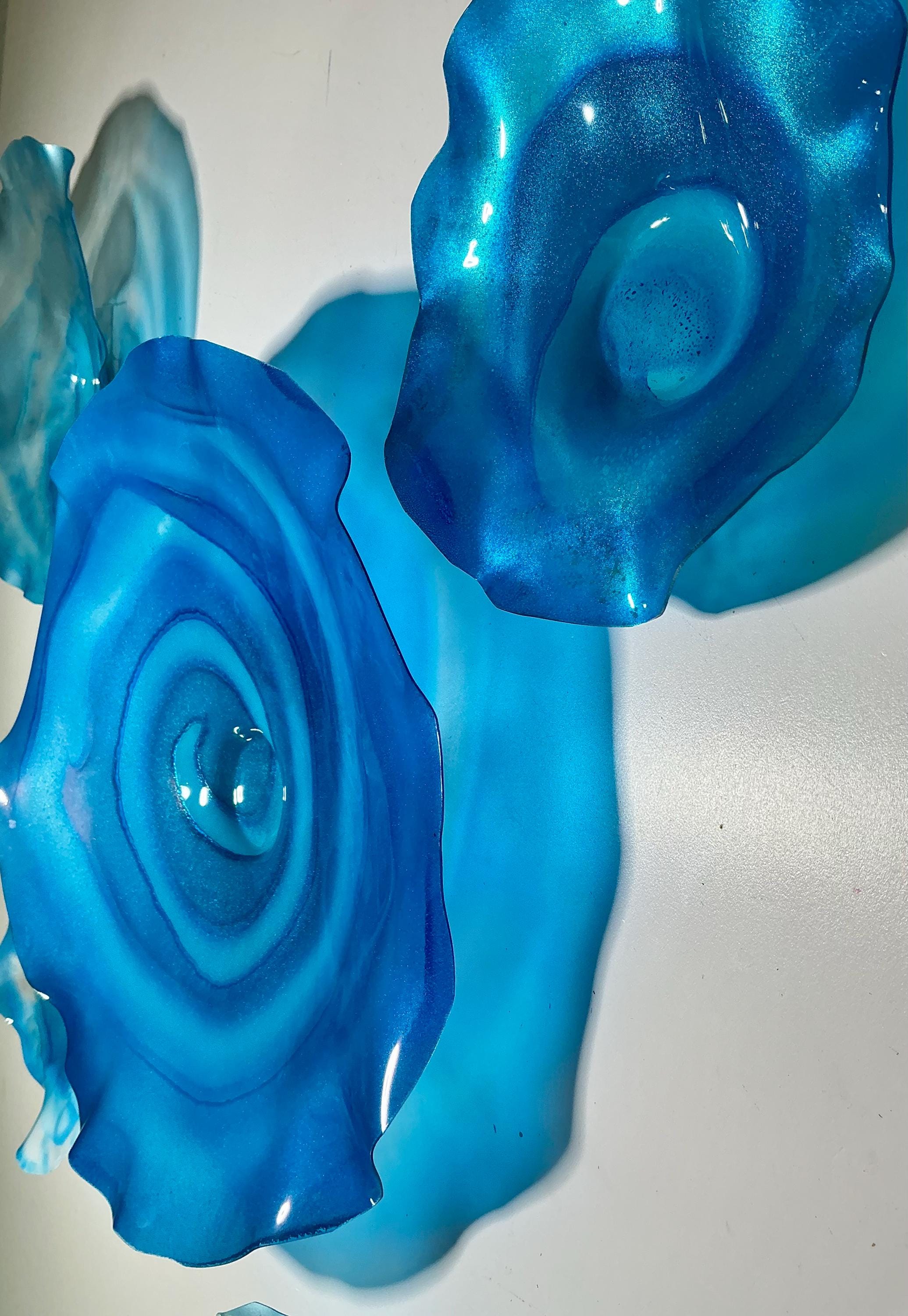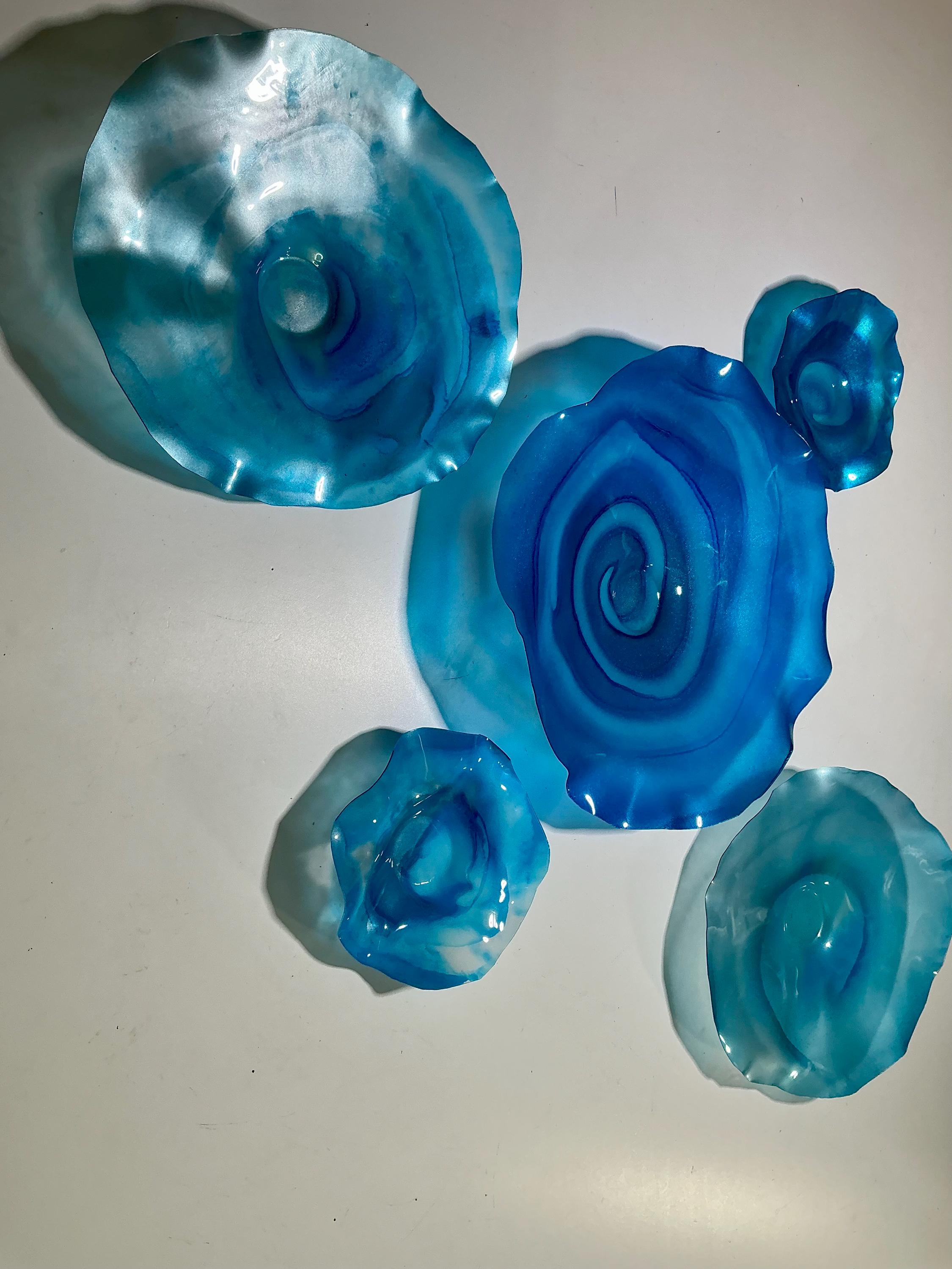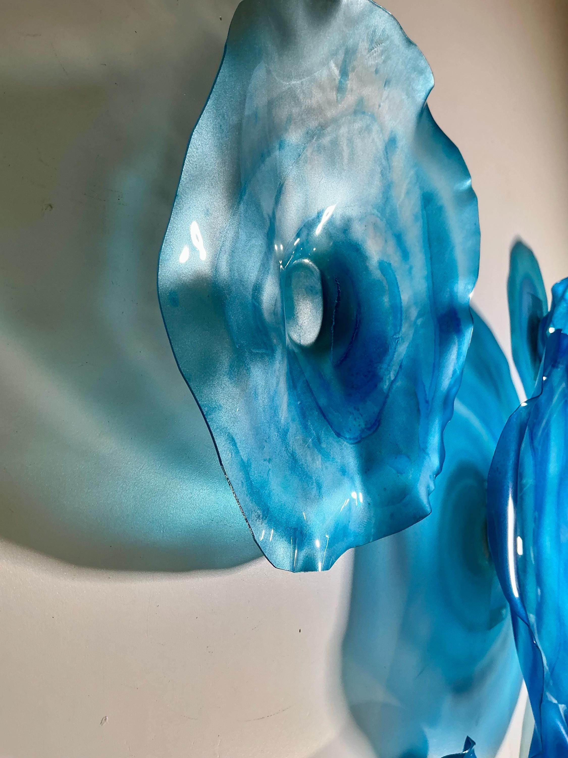 Bring color and movement your space with the radiant glow of This unique set of 5 shades of ocean blues wall flowers. The light filters through creating a colorful effect on the hanging surface.