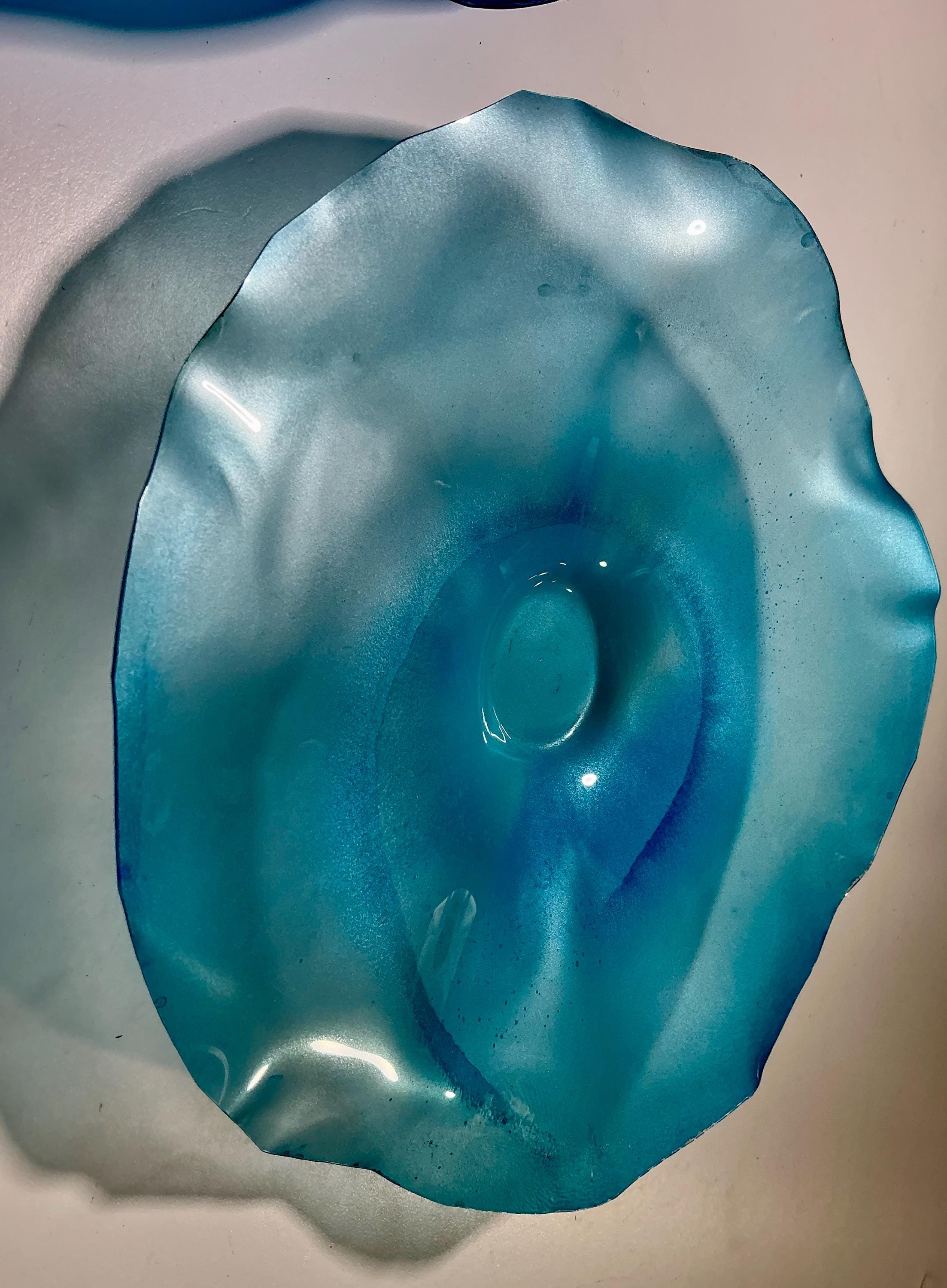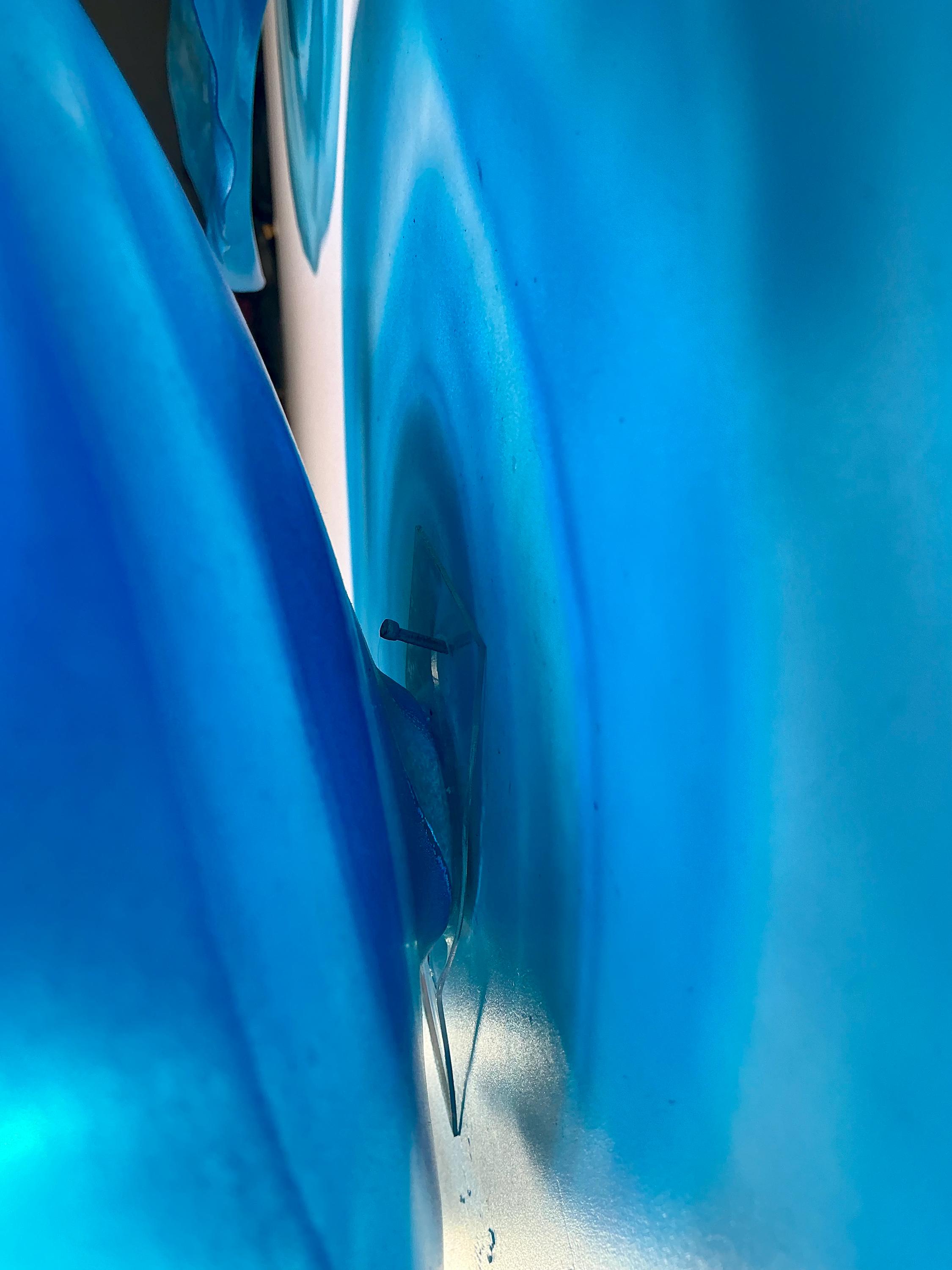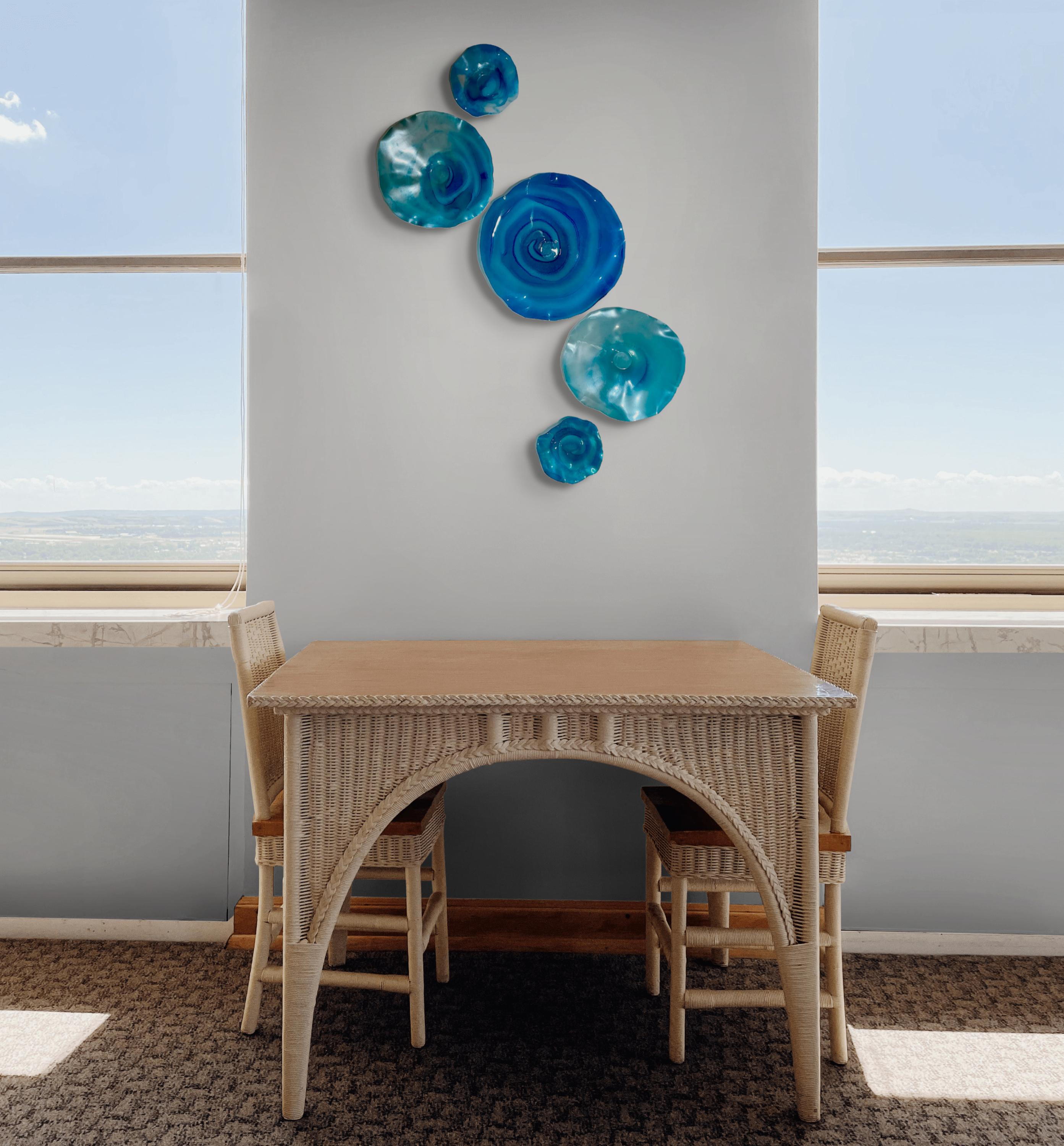 Bring color and movement your space with the radiant glow of This unique set of 5 shades of ocean blues wall flowers. The light filters through creating a colorful effect on the hanging surface.
