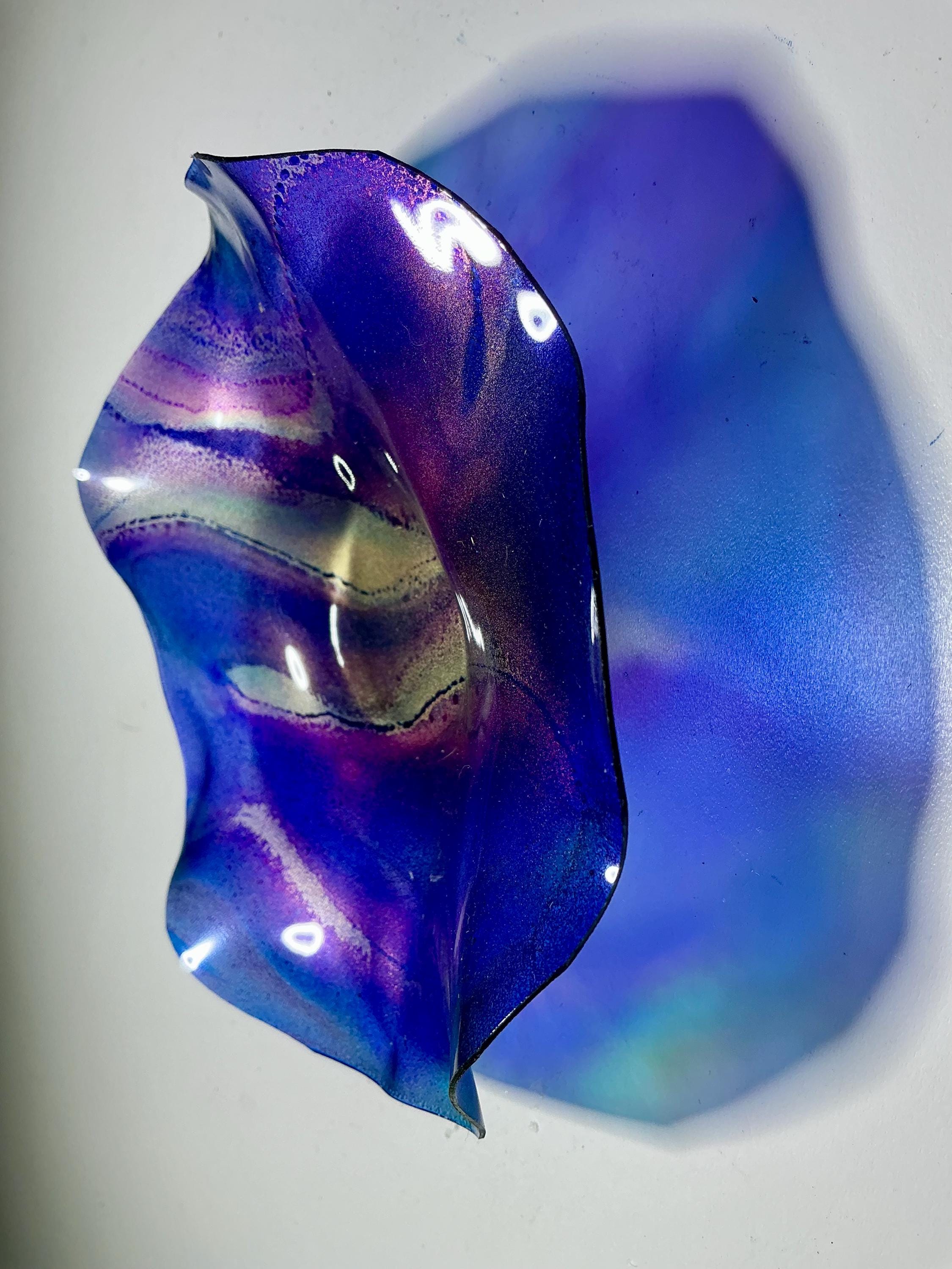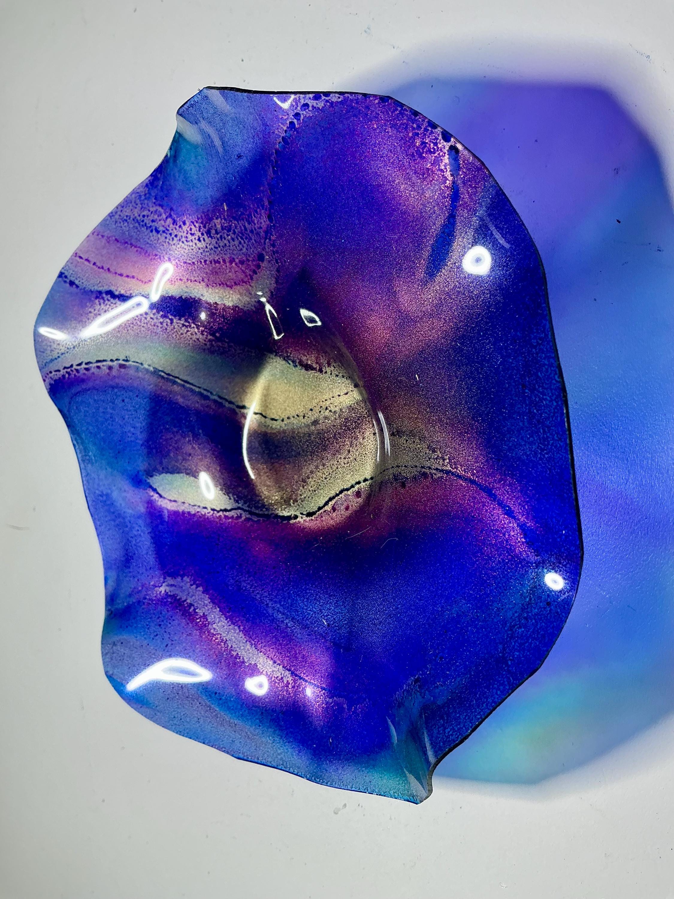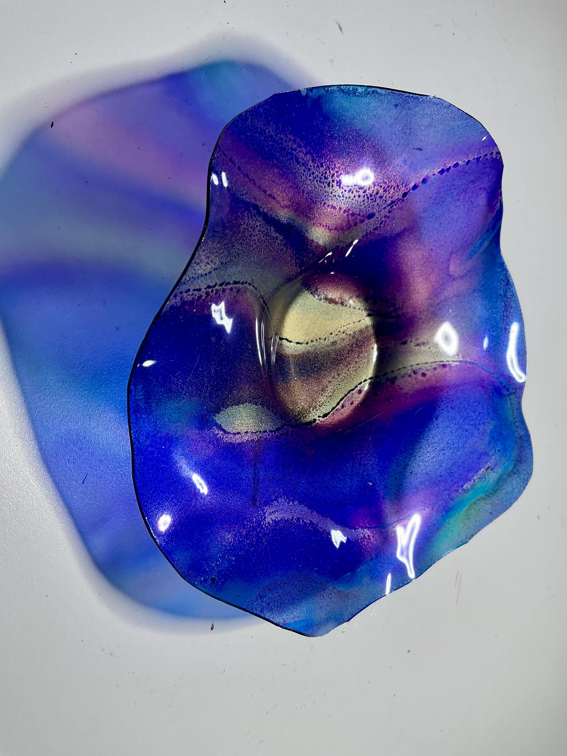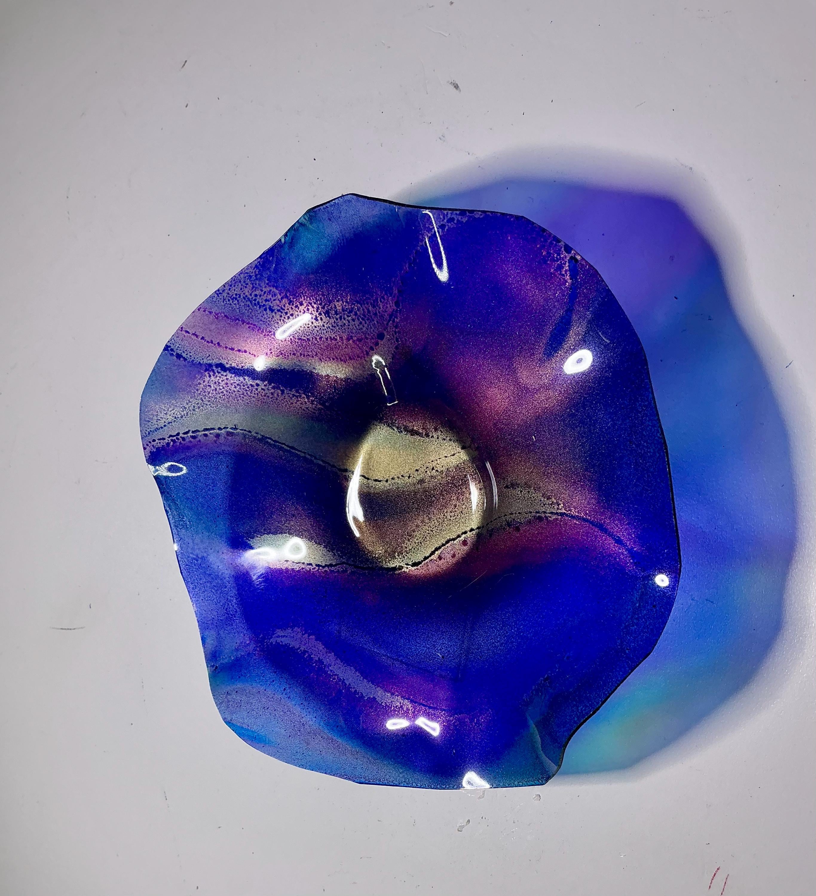 Sustainable Recycled plastic one of a kind x-Small wall flower 5” handmade purple, blue & gold boho beach home decor/looks like glass