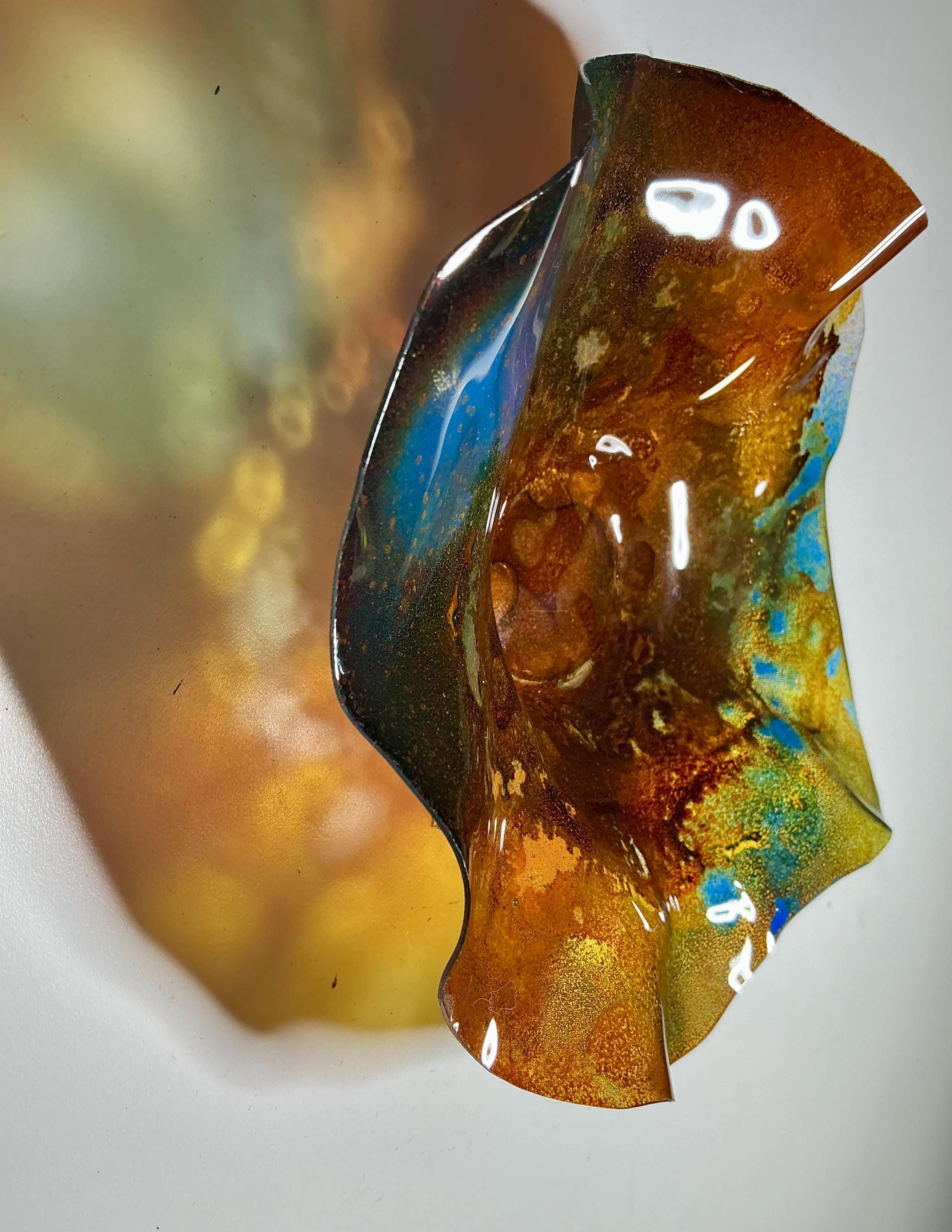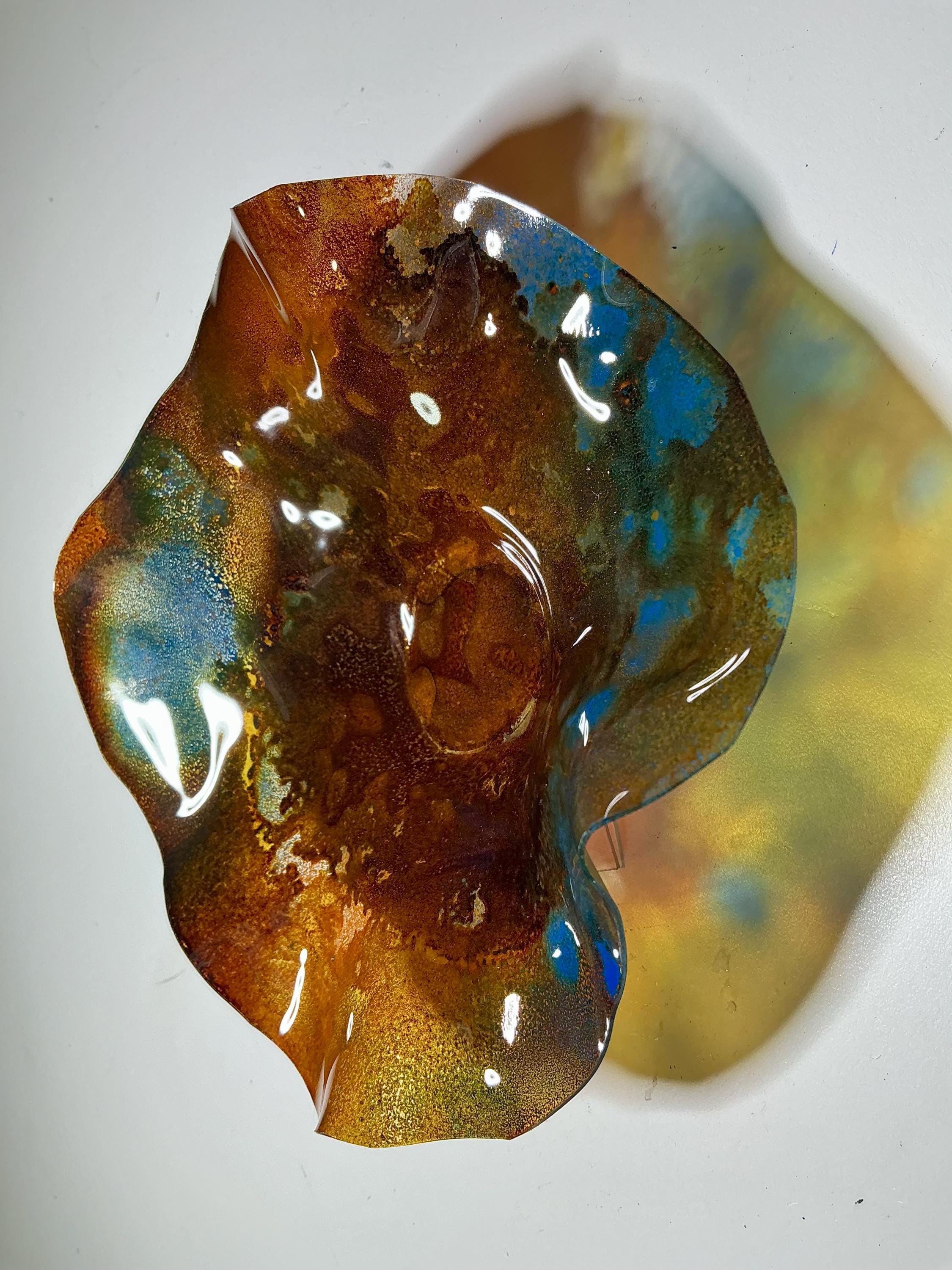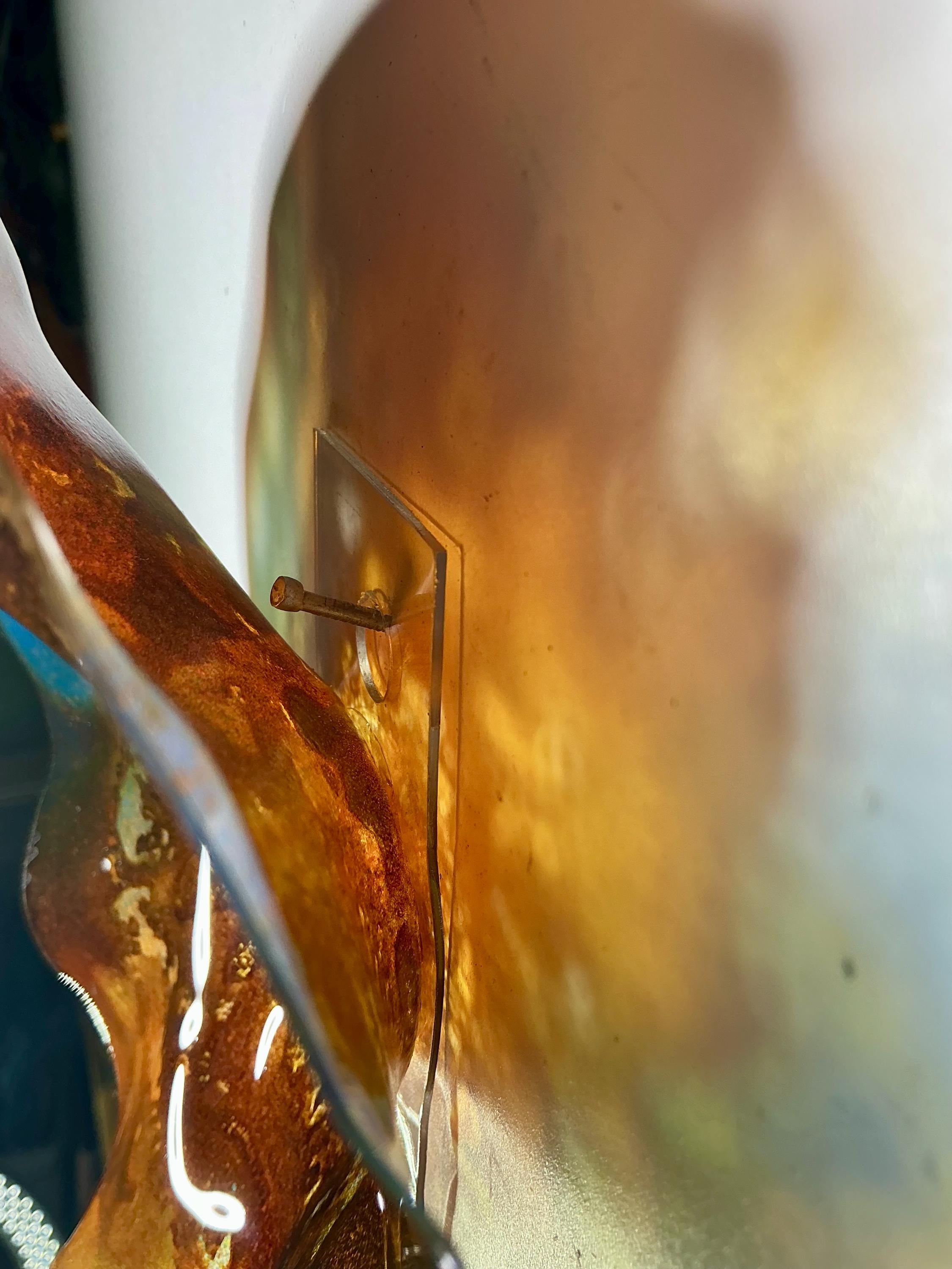 Each collectible piece is unique, no two are alike. This permanent, colorful, eye catching art looks and feels like glass. It shimmers in the light resembling water. They are very DURABLE AND LIGHTWEIGHT. These flowers are easy to hang ,are all weather and UV resistant. Great for indoor or outdoor decorating.