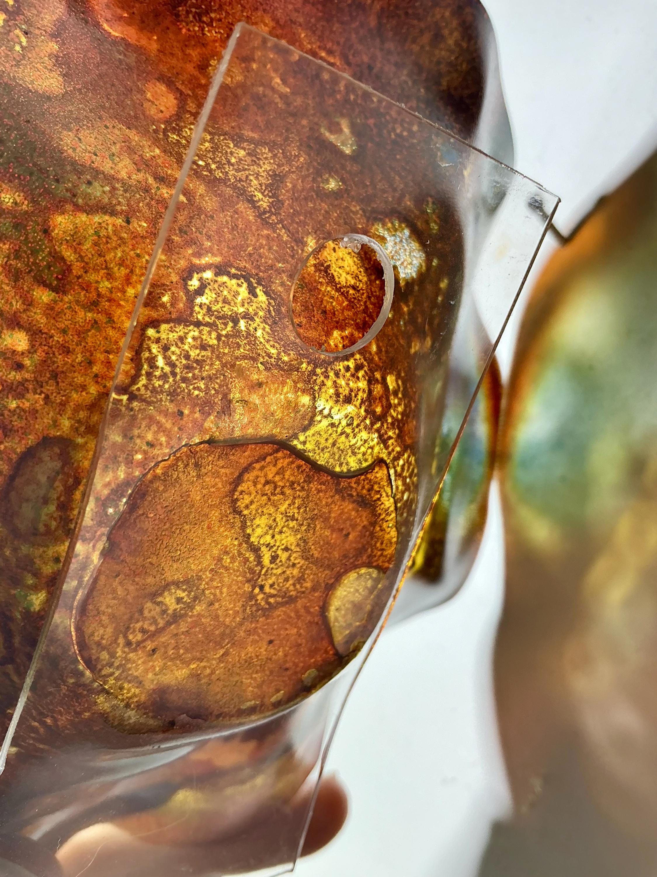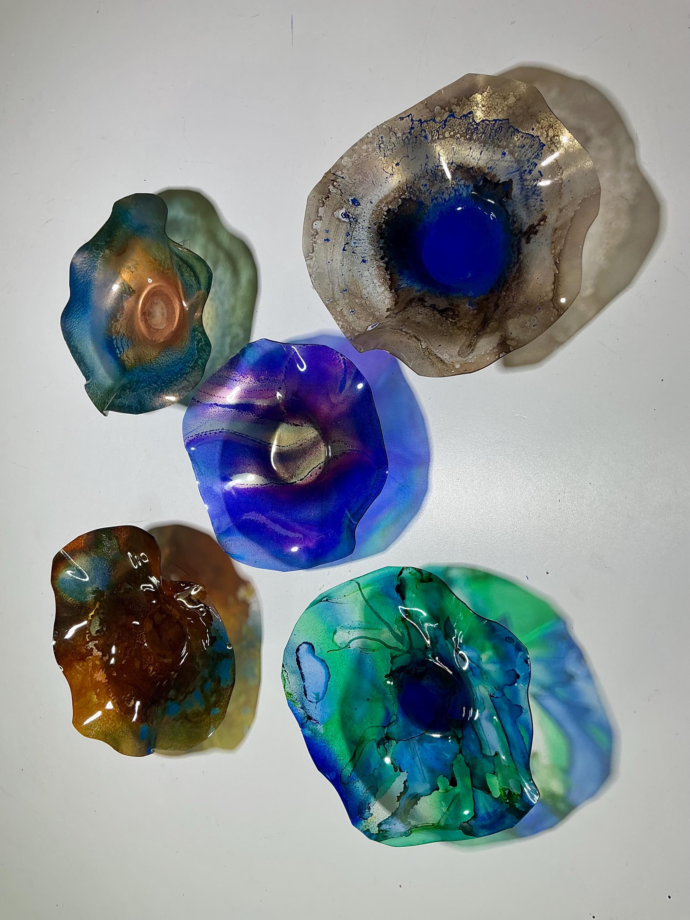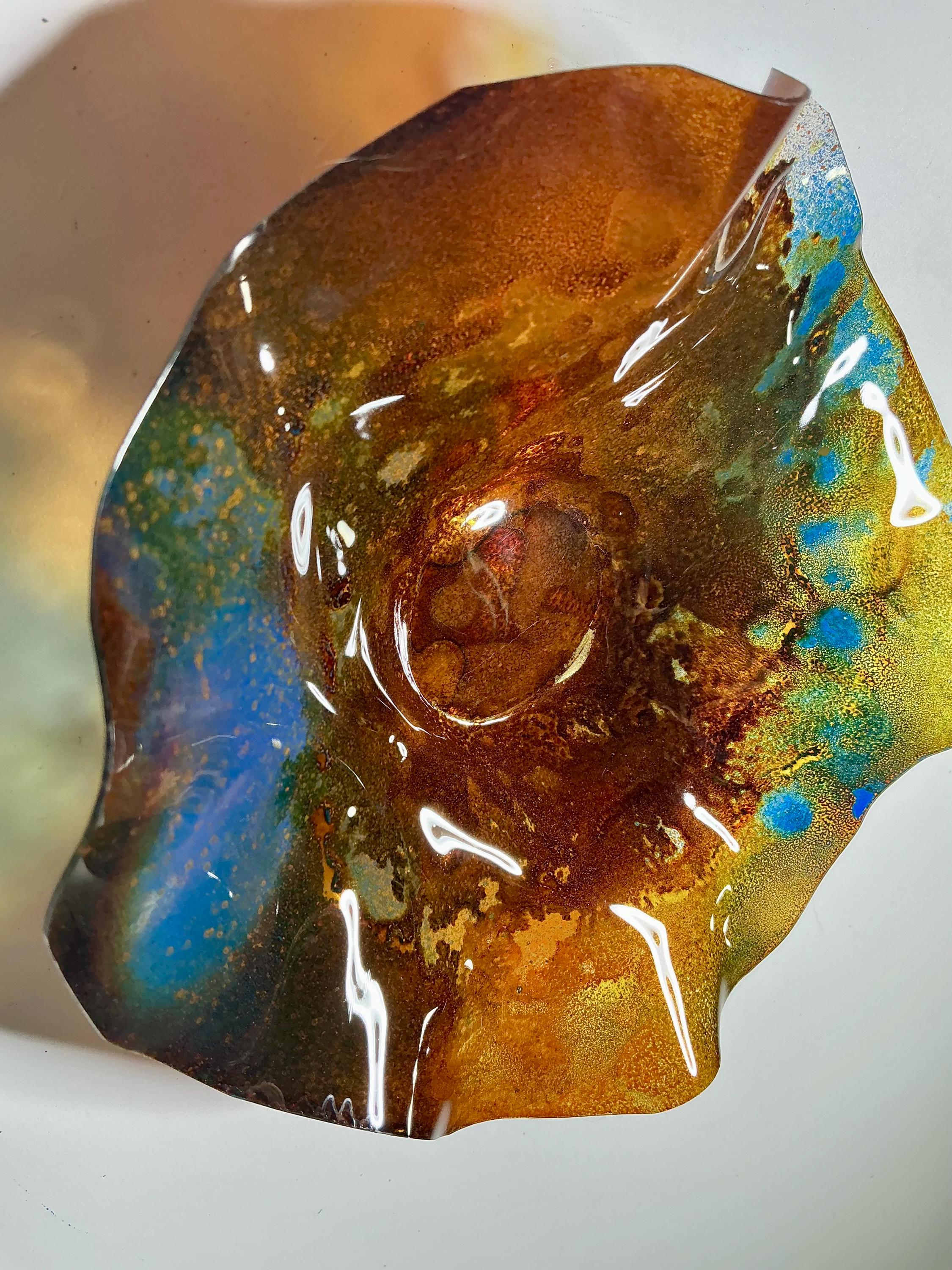 Each collectible piece is unique, no two are alike. This permanent, colorful, eye catching art looks and feels like glass. It shimmers in the light resembling water. They are very DURABLE AND LIGHTWEIGHT. These flowers are easy to hang ,are all weather and UV resistant. Great for indoor or outdoor decorating.