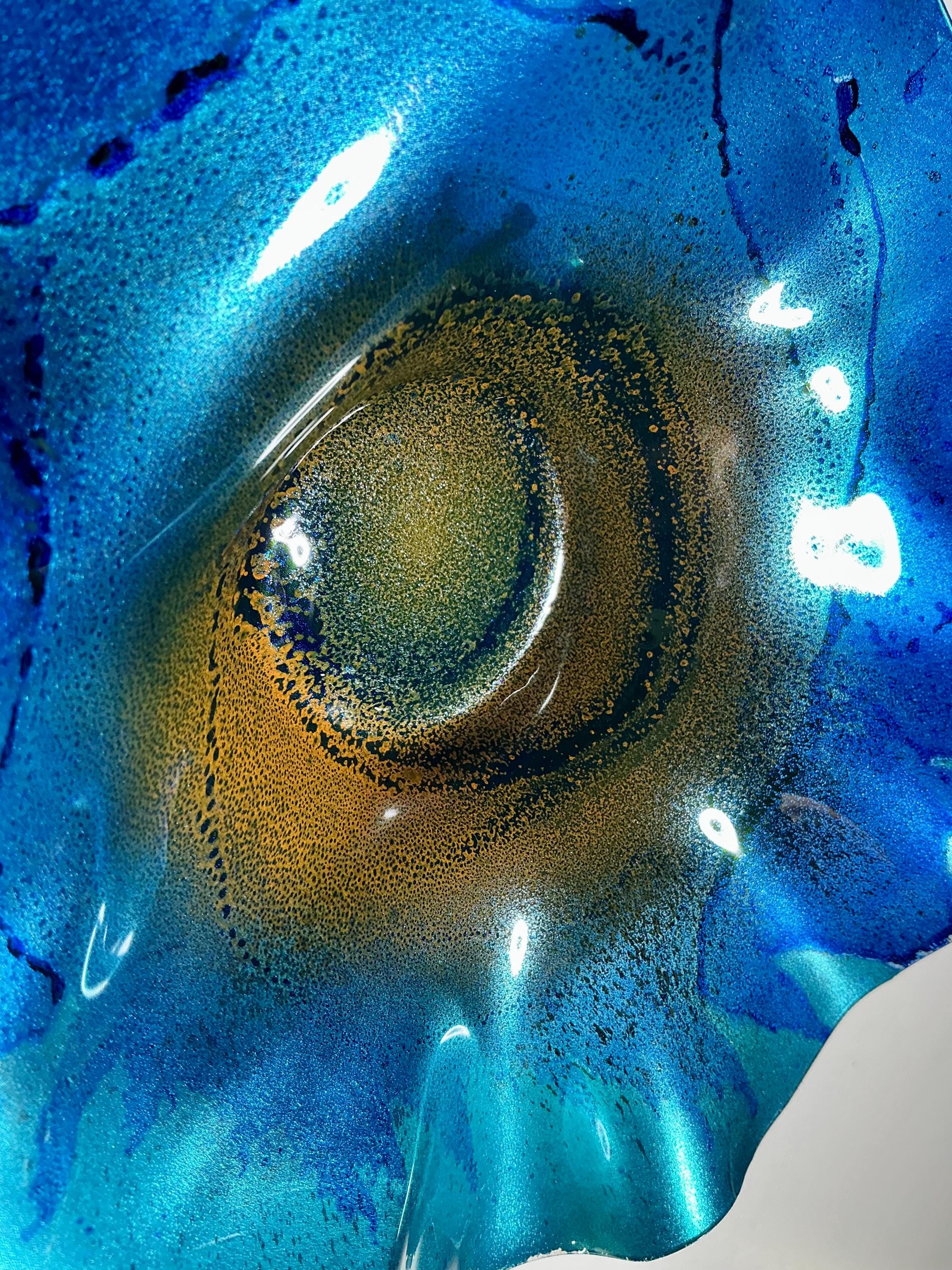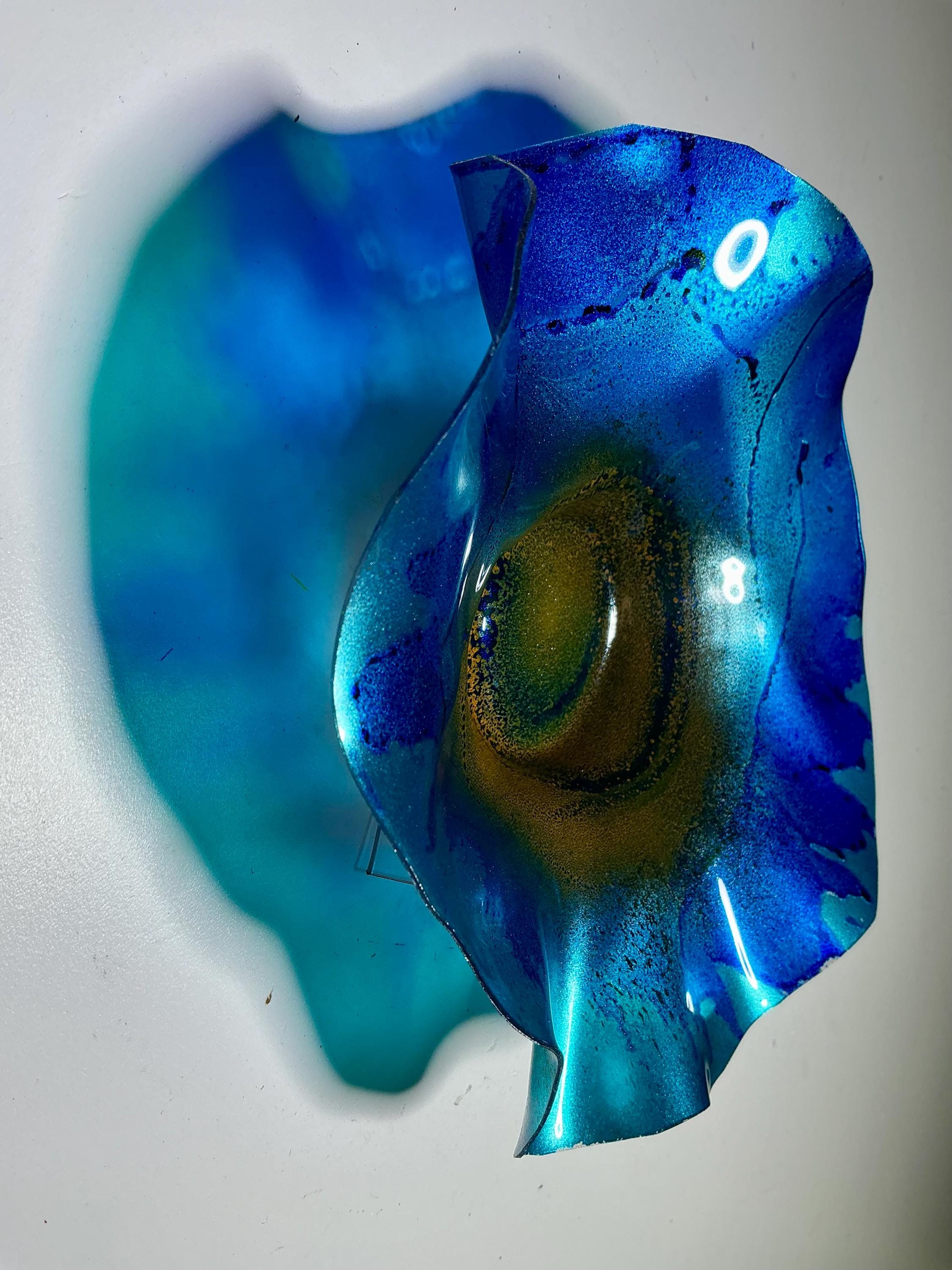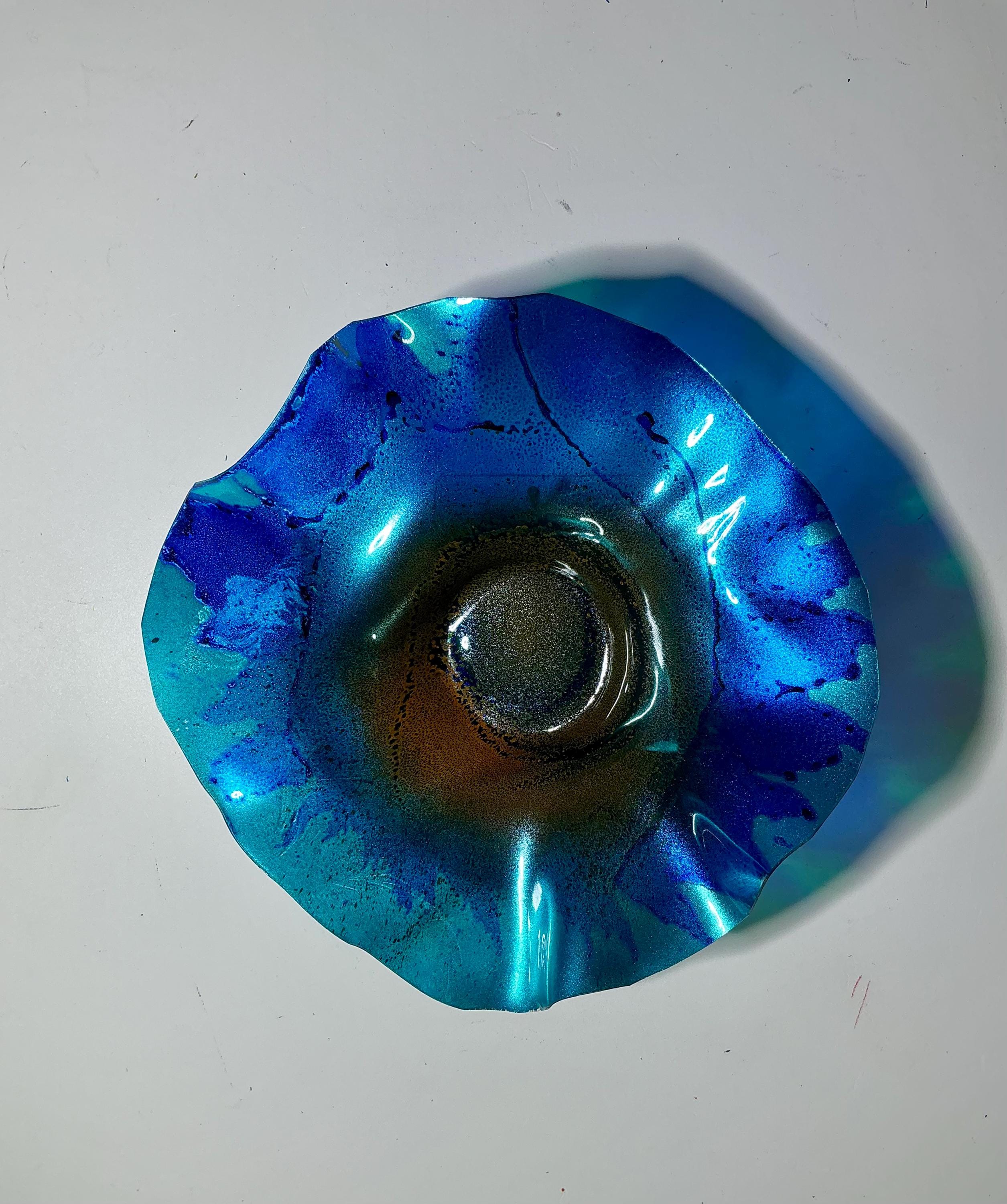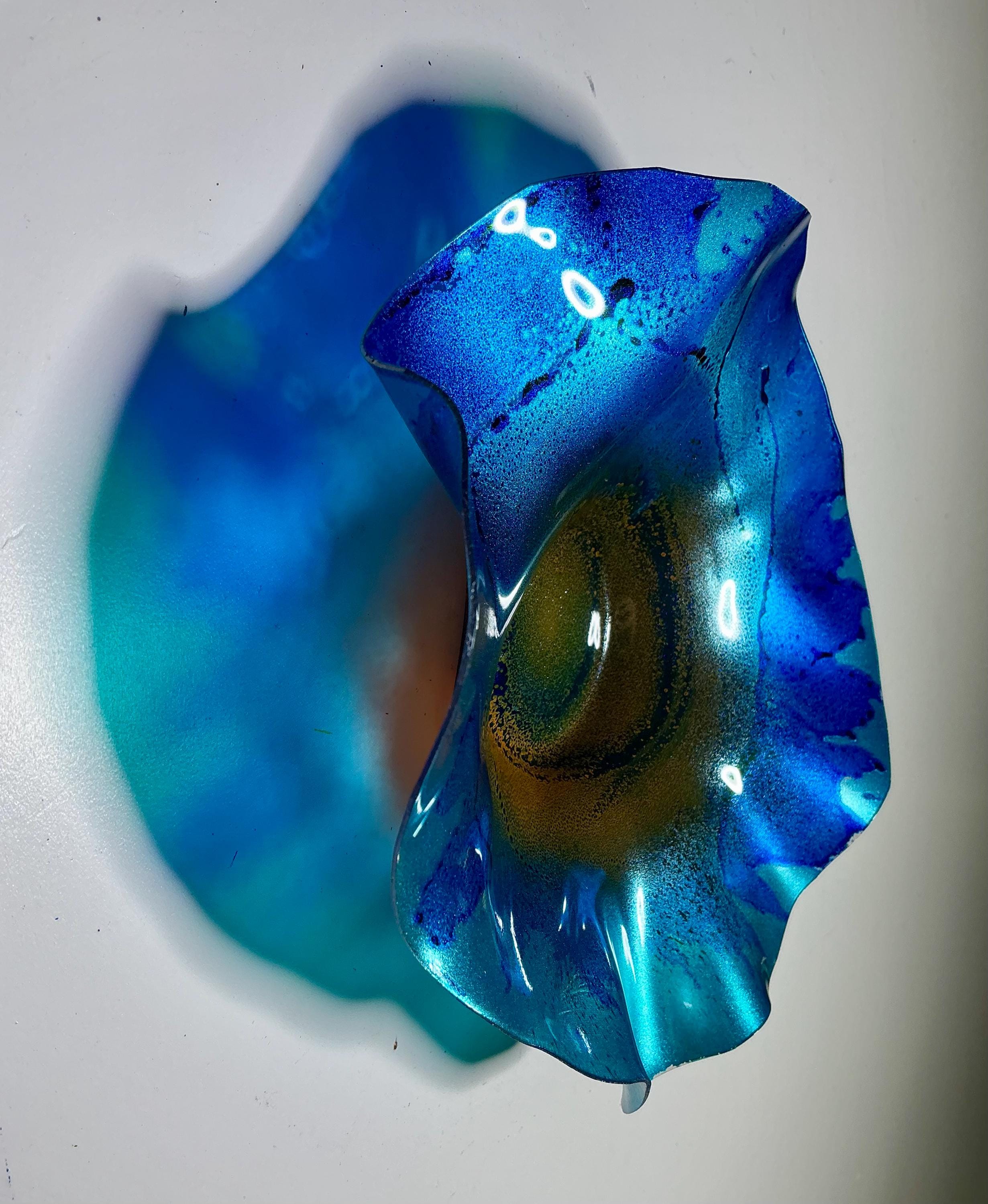 Add a touch of unique elegance to your space with this stunning 5-inch blue with burnt orange center wall hanging. Crafted from upcycled plastic, this handmade piece boasts a beautiful glass-like look that catches the light and draws the eye. Each item is one of a kind, ensuring that your decor stands out. Perfect for any room, this eco-friendly art piece blends style and sustainability effortlessly. Elevate your home decor with this charming, artisanal creation!