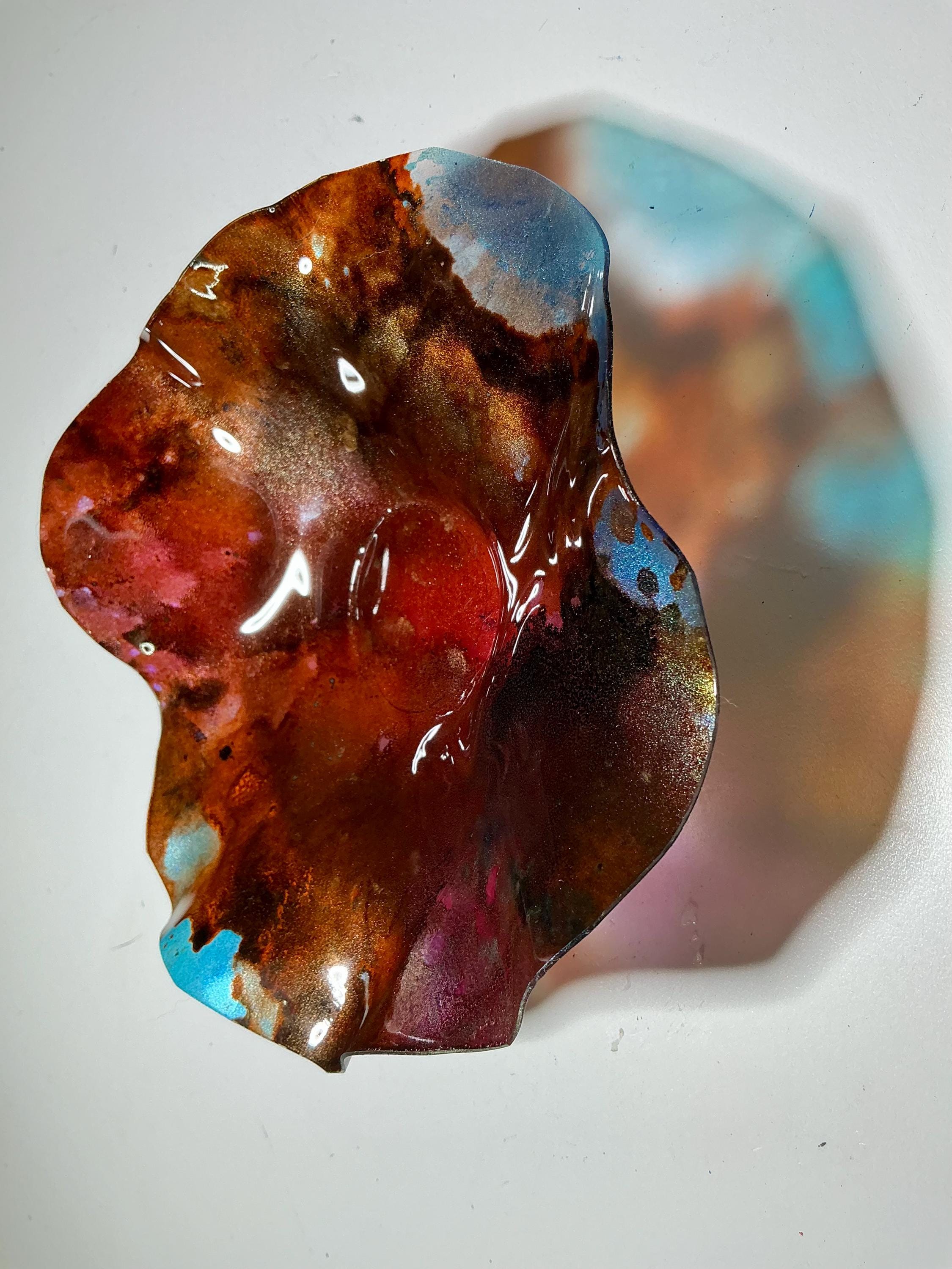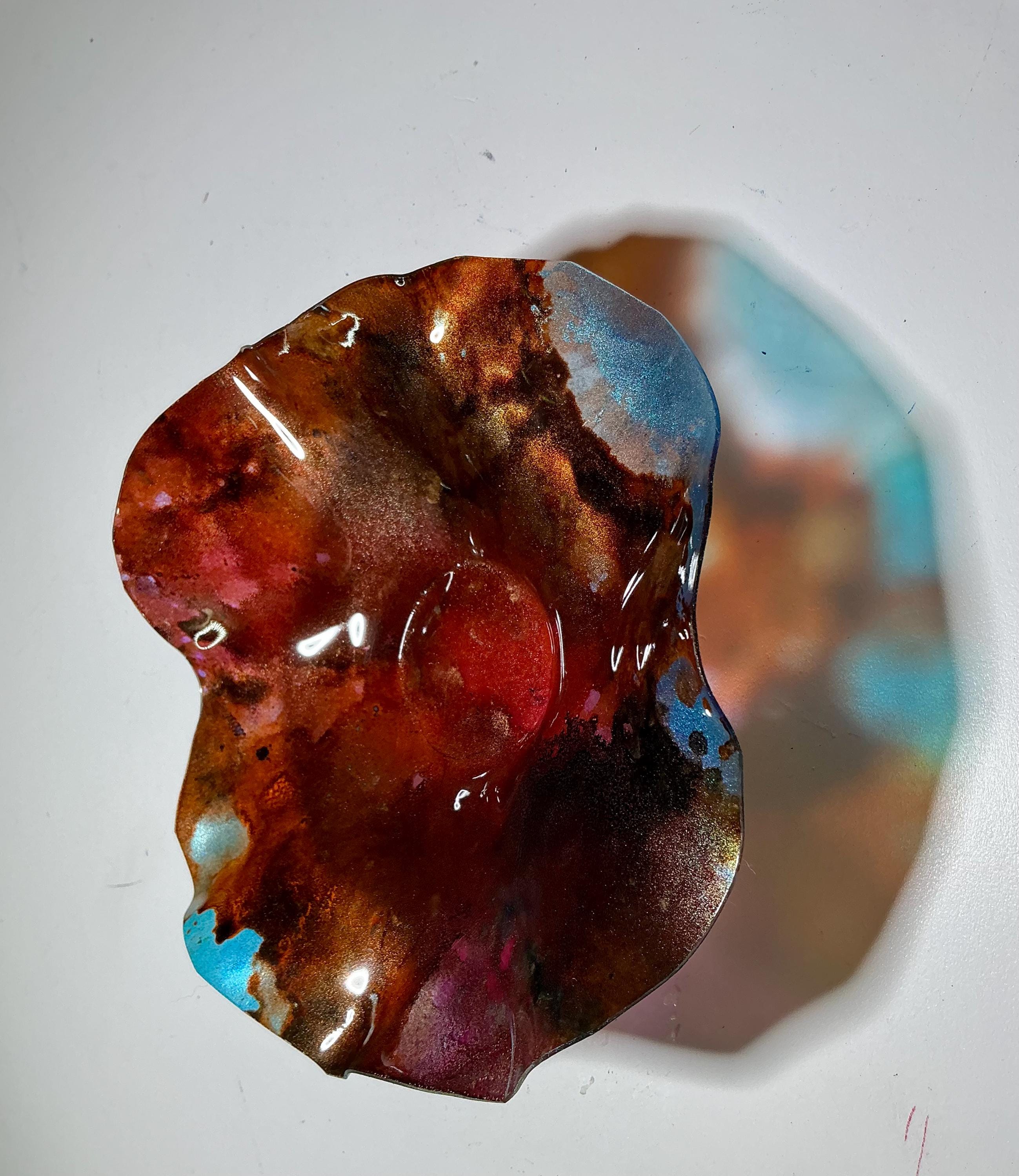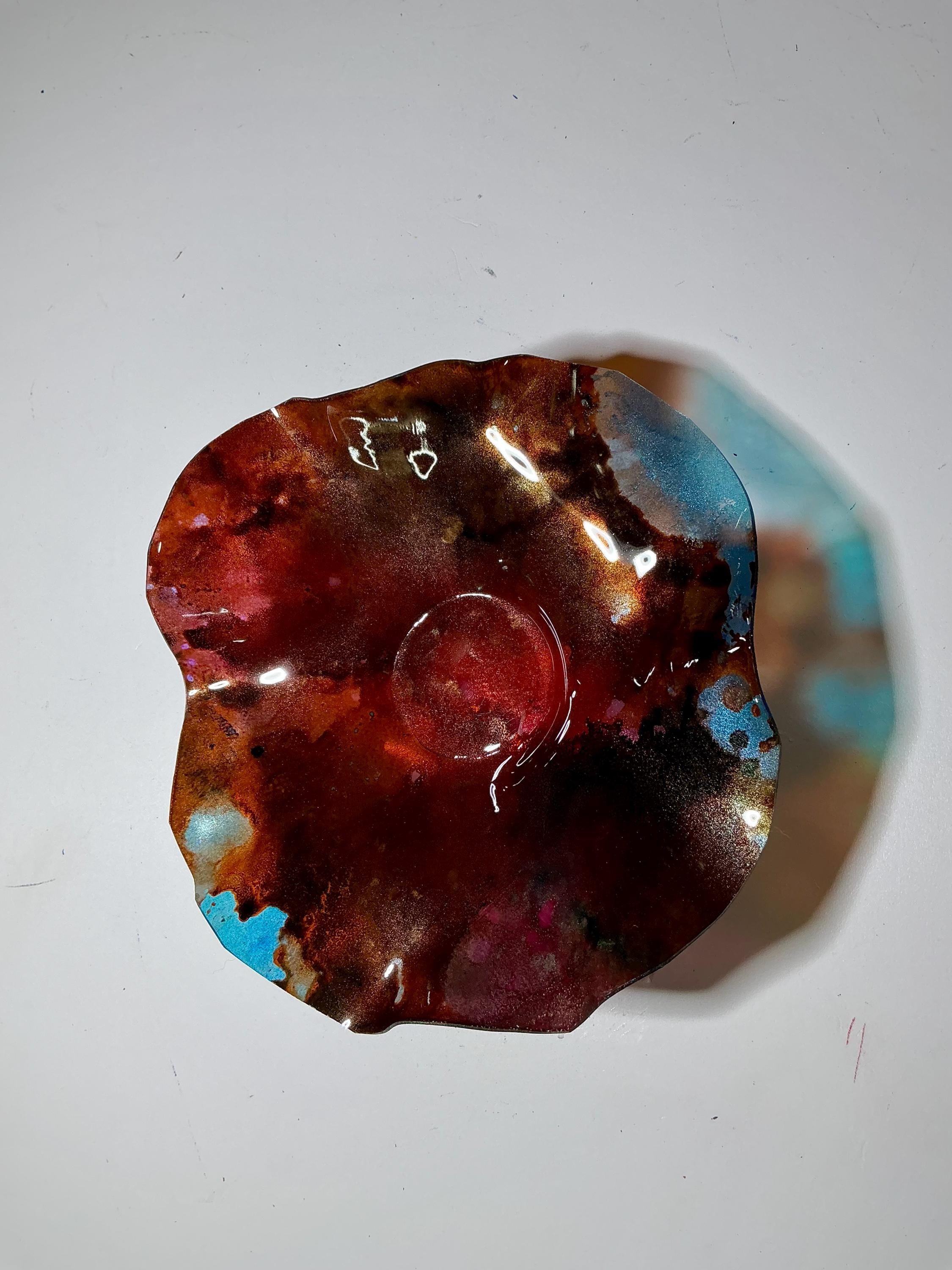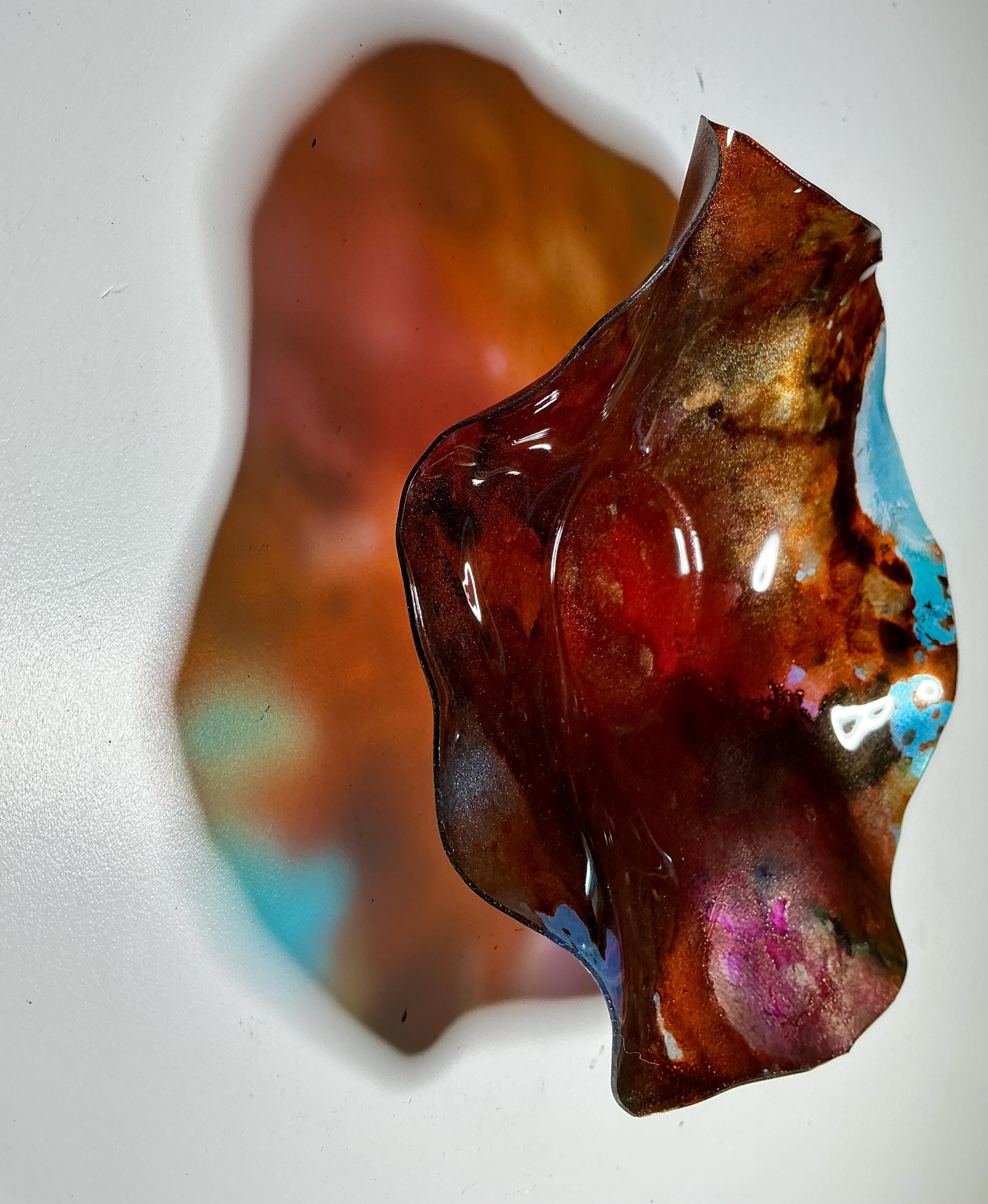 Stunning wall flower cool wall art iridescent brown with blue and burgundy. The light filters through casting a colorful glow to the hanging surface.
