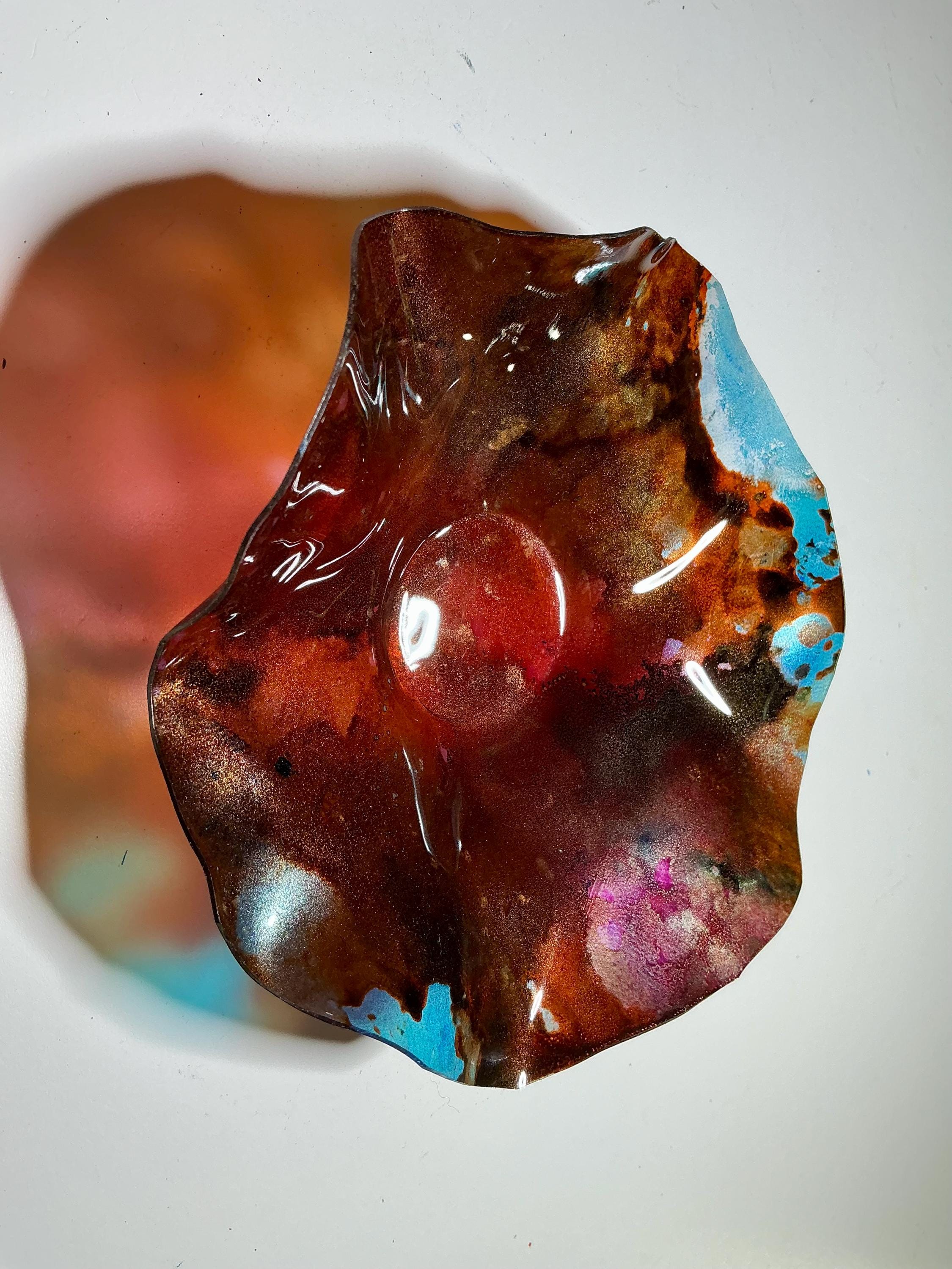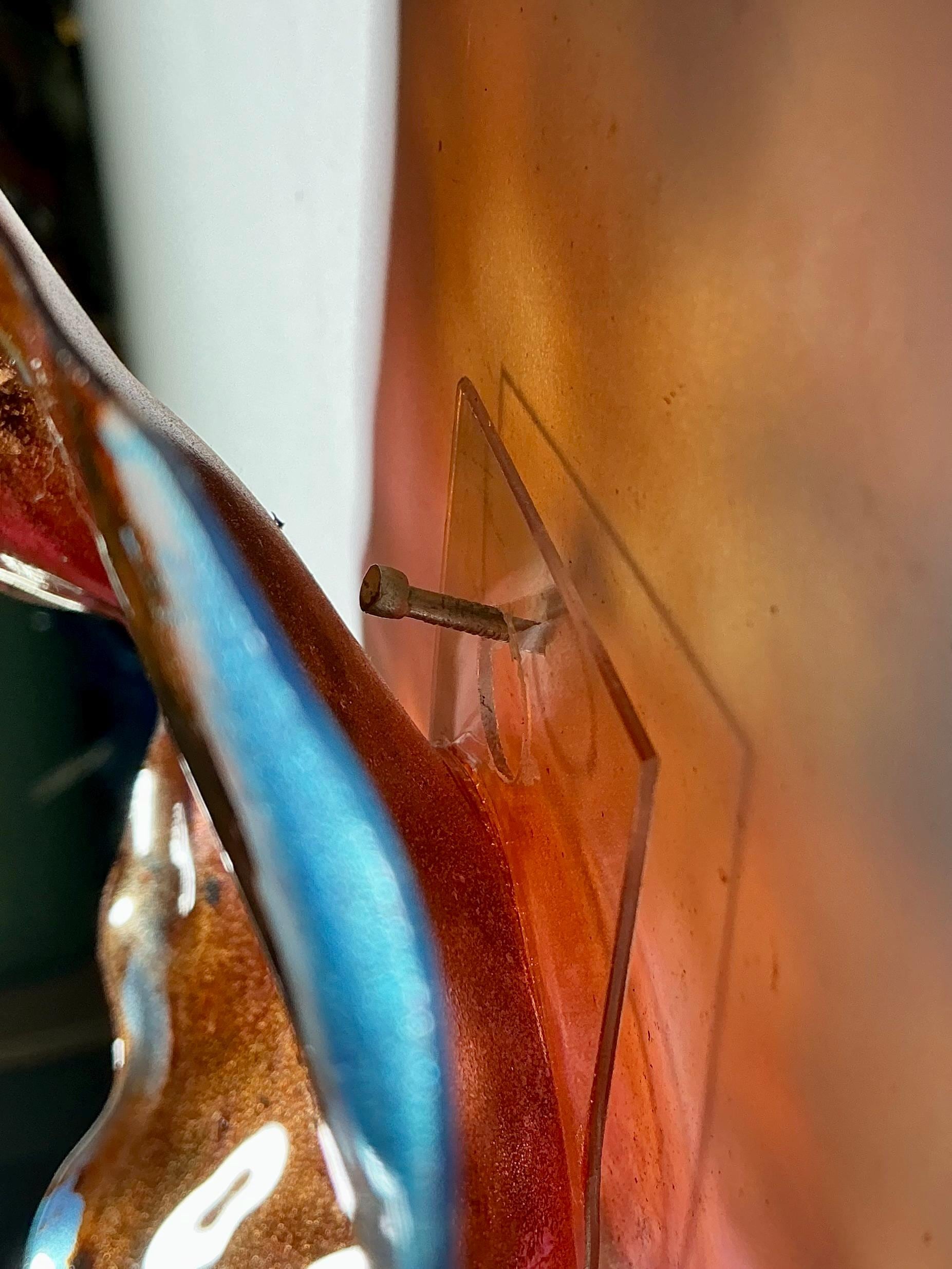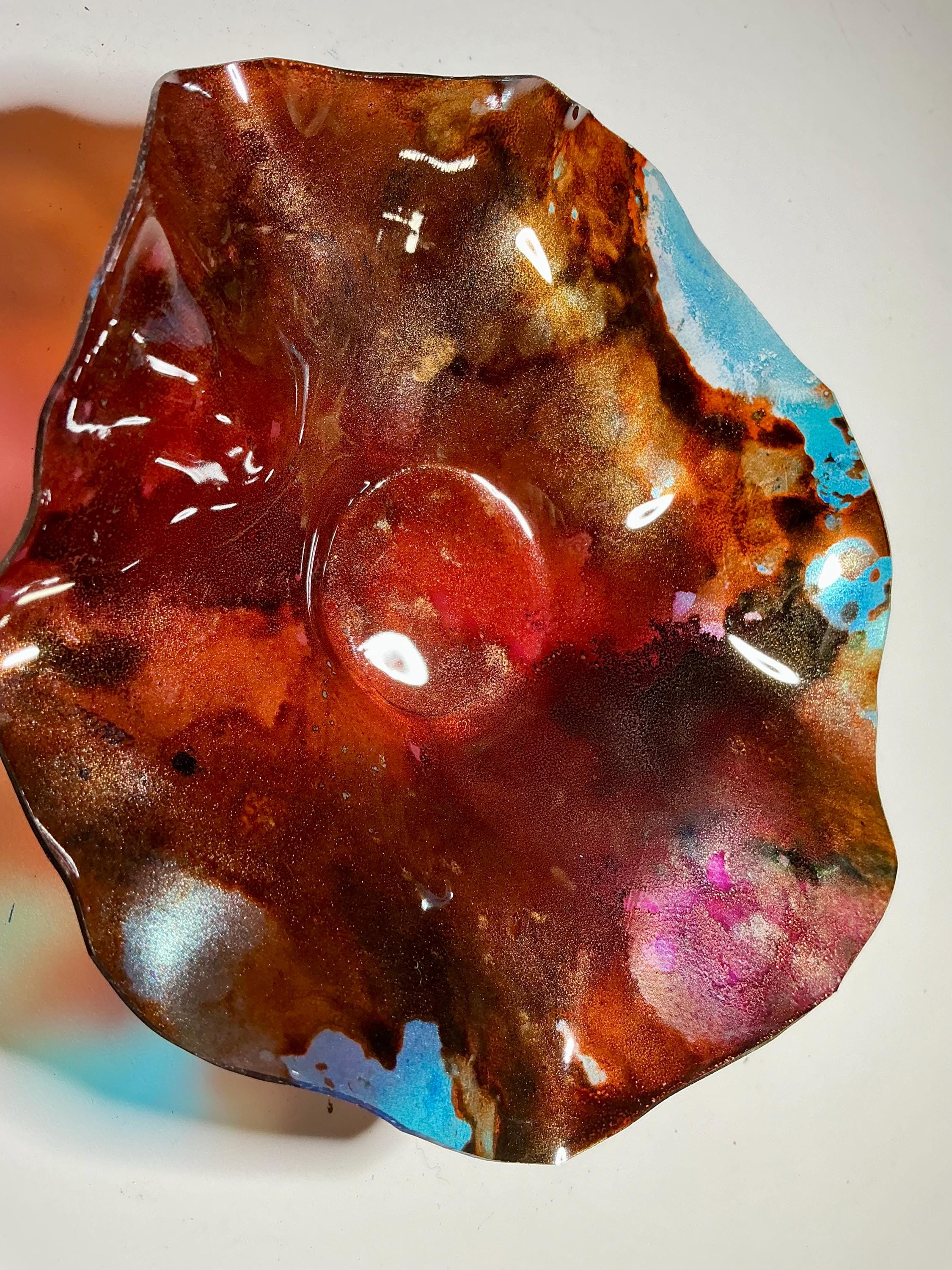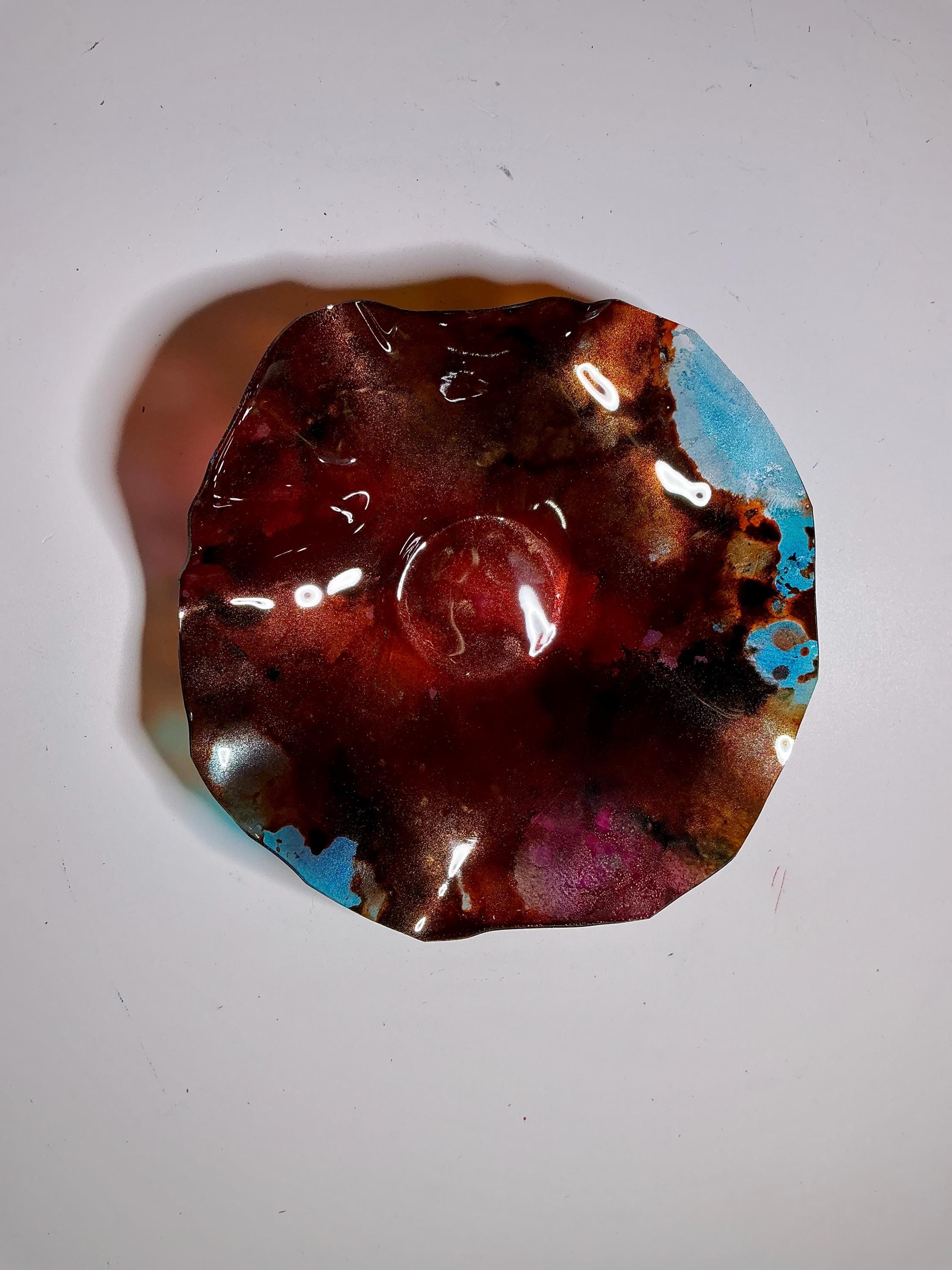 Stunning wall flower cool wall art iridescent brown with blue and burgundy. The light filters through casting a colorful glow to the hanging surface.
