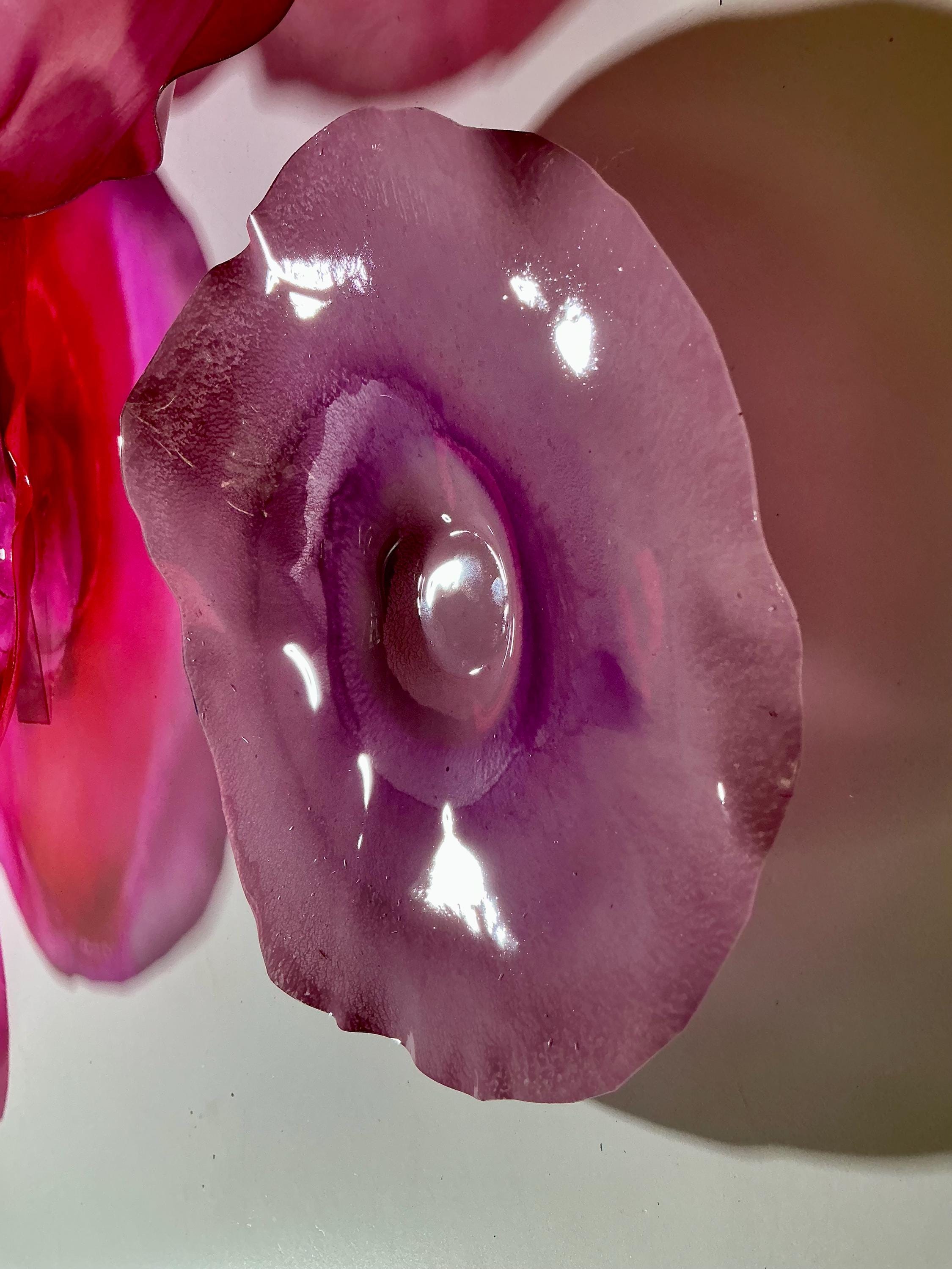 Our wall flowers are made from sustainable recycled PET as in a water bottle. Each piece contains at least 50% recycled polyethylene terphalate (rPET)