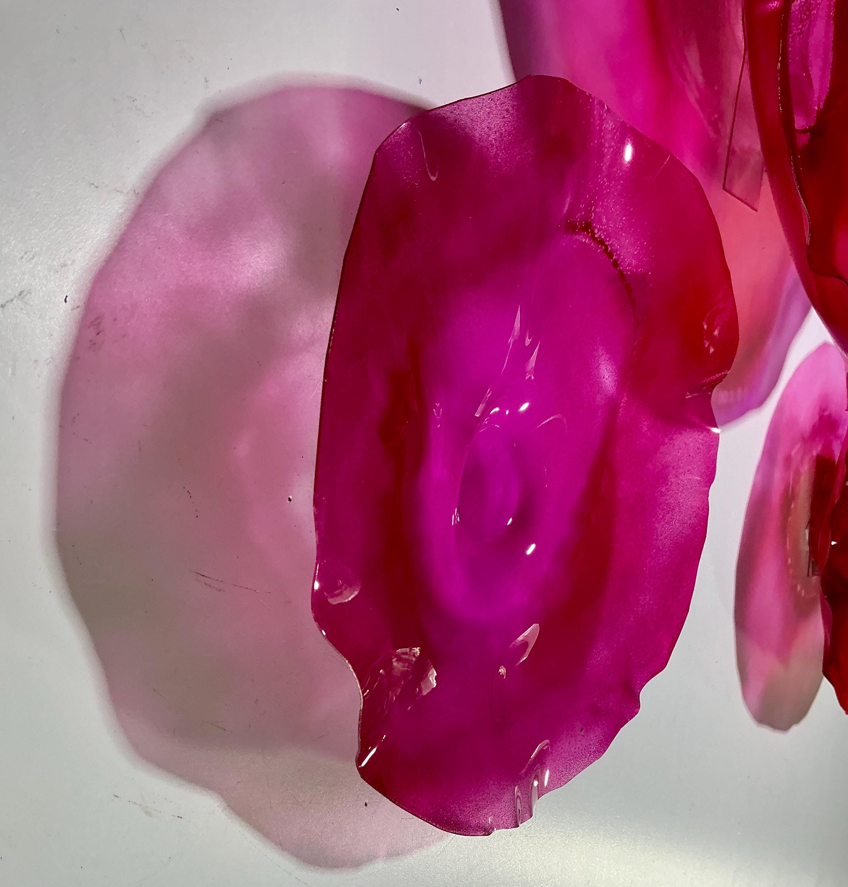 This permanent, colorful, eye catching art looks and feels like glass. They shimmer in the light resembling water. They are very DURABLE AND LIGHTWEIGHT. These flowers are easy to hang, are all weather and UV resistant. Great for indoor or outdoor decorating.